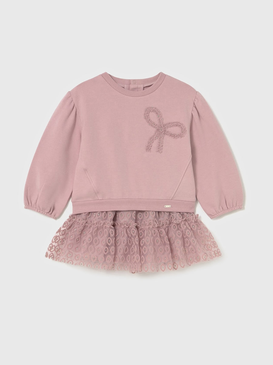 This stylish set combines the comfort of a sweater with the charm of a tulle skirt. The soft sweatshirt features a delightful embroidered bow on the chest and long puff sleeves. The skirt features a tiered design made from frilly tulle fabric.