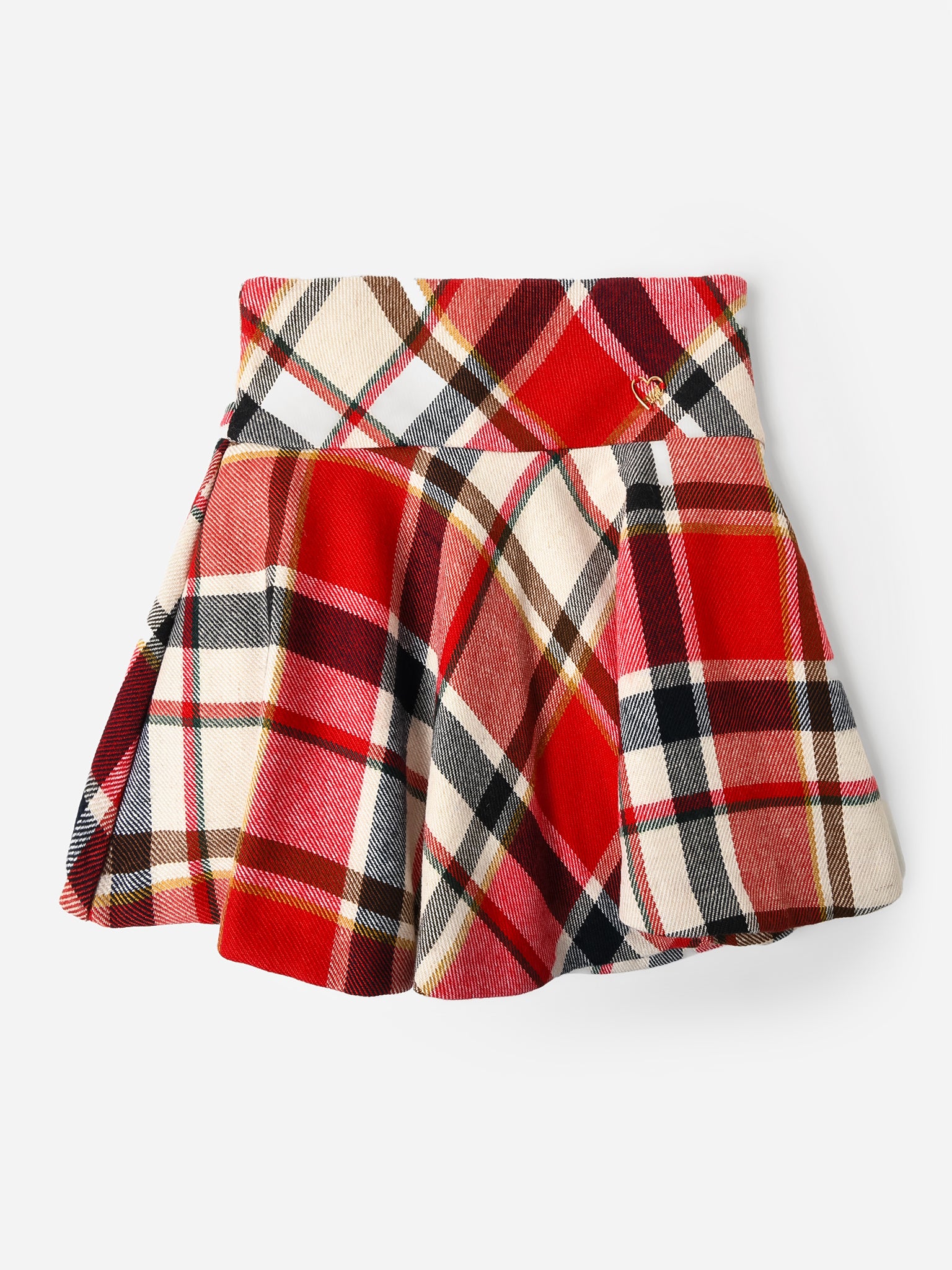 Multi-colored plaid skirt with a side zip closure and flounce hem.