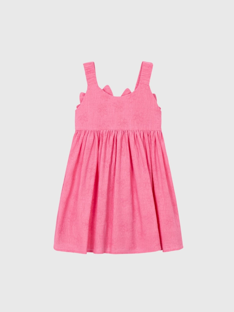 This fun and flowy dress is crafted from floral jacquard fabric and features elastic straps with bow details on the back.