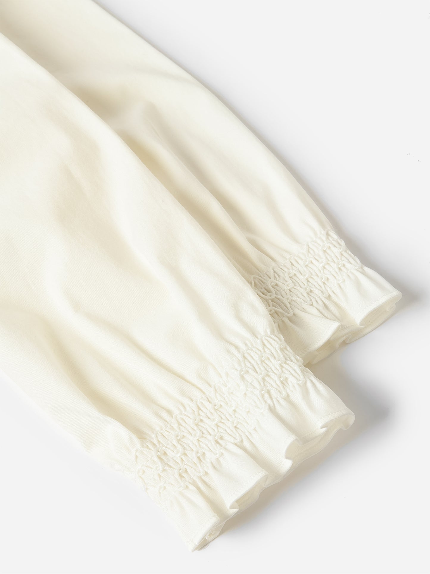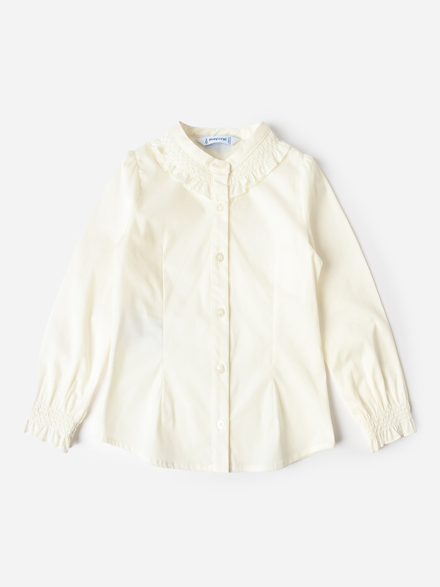 Crisp poplin top with a ruffle-trimmed neckline and cuffs.