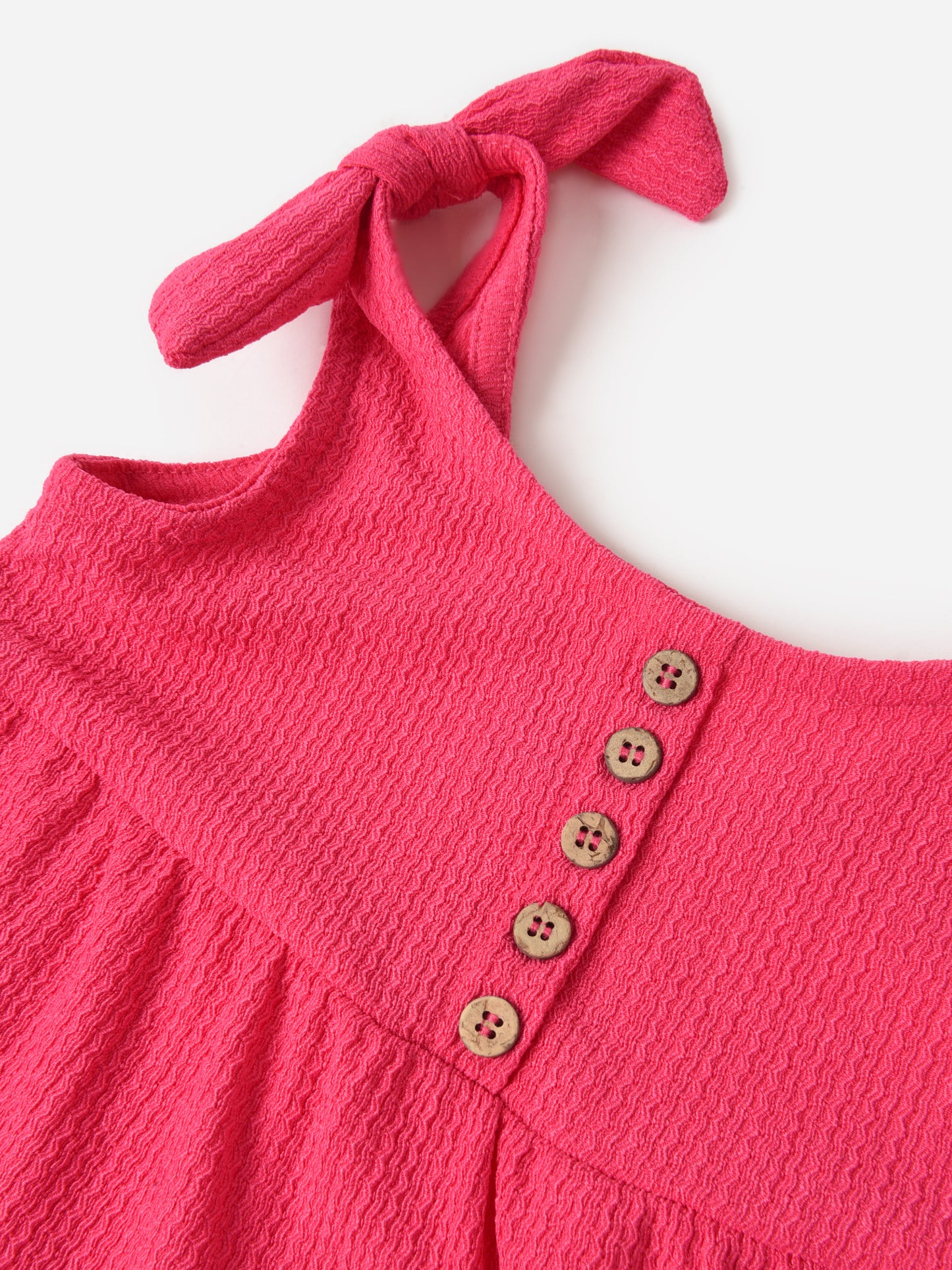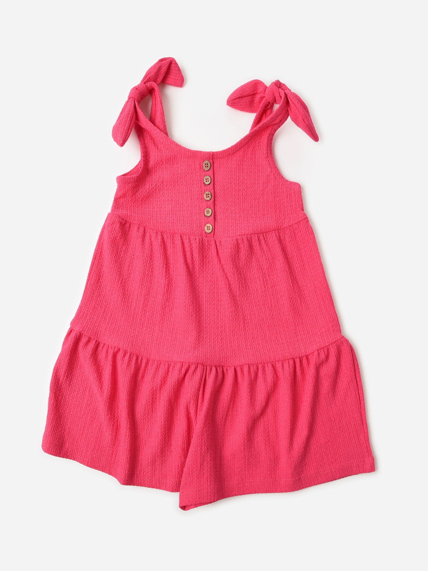 A sleeveless romper with bow straps and tiered seams.