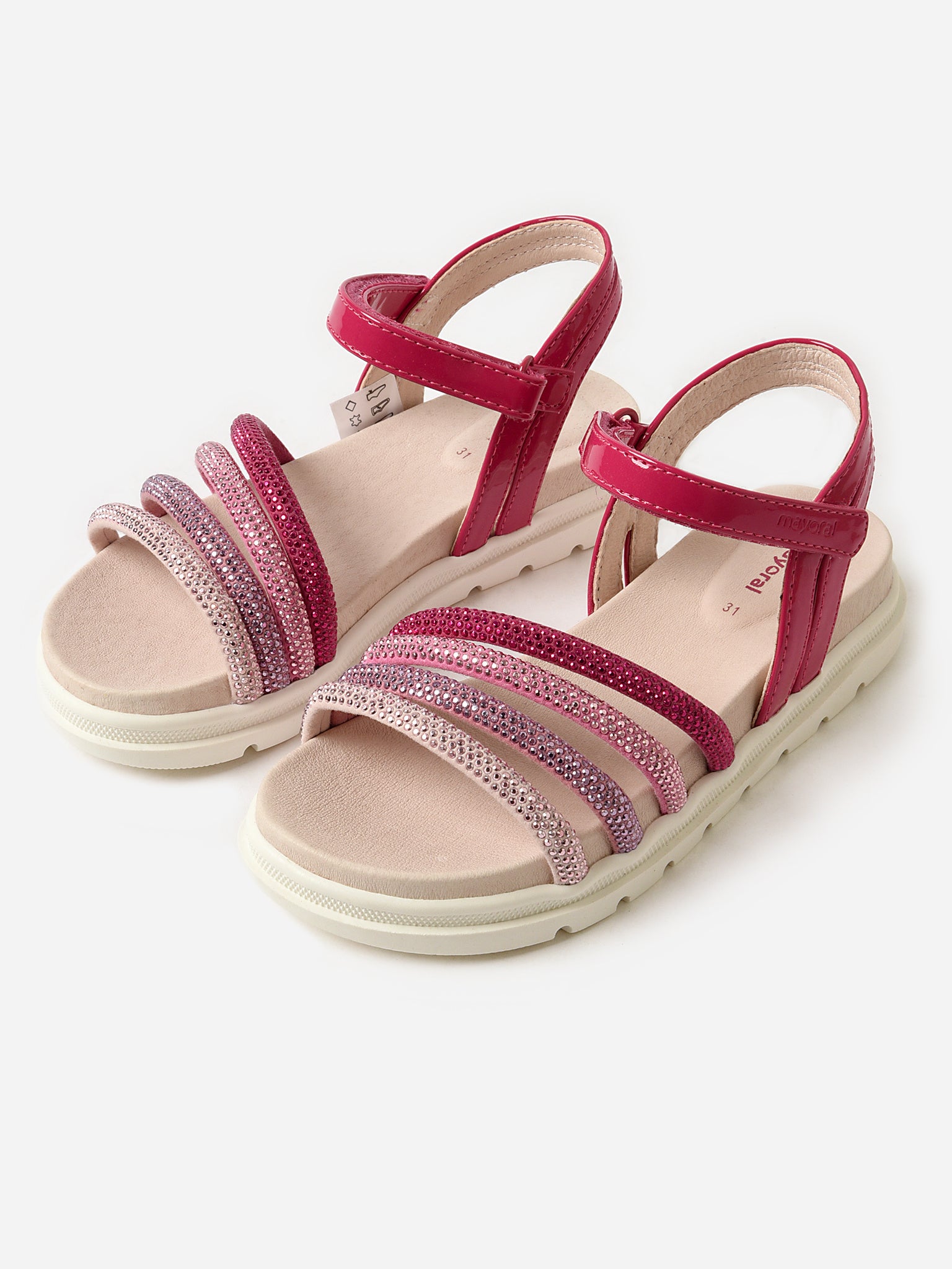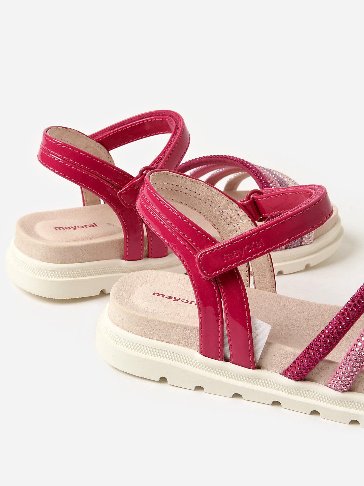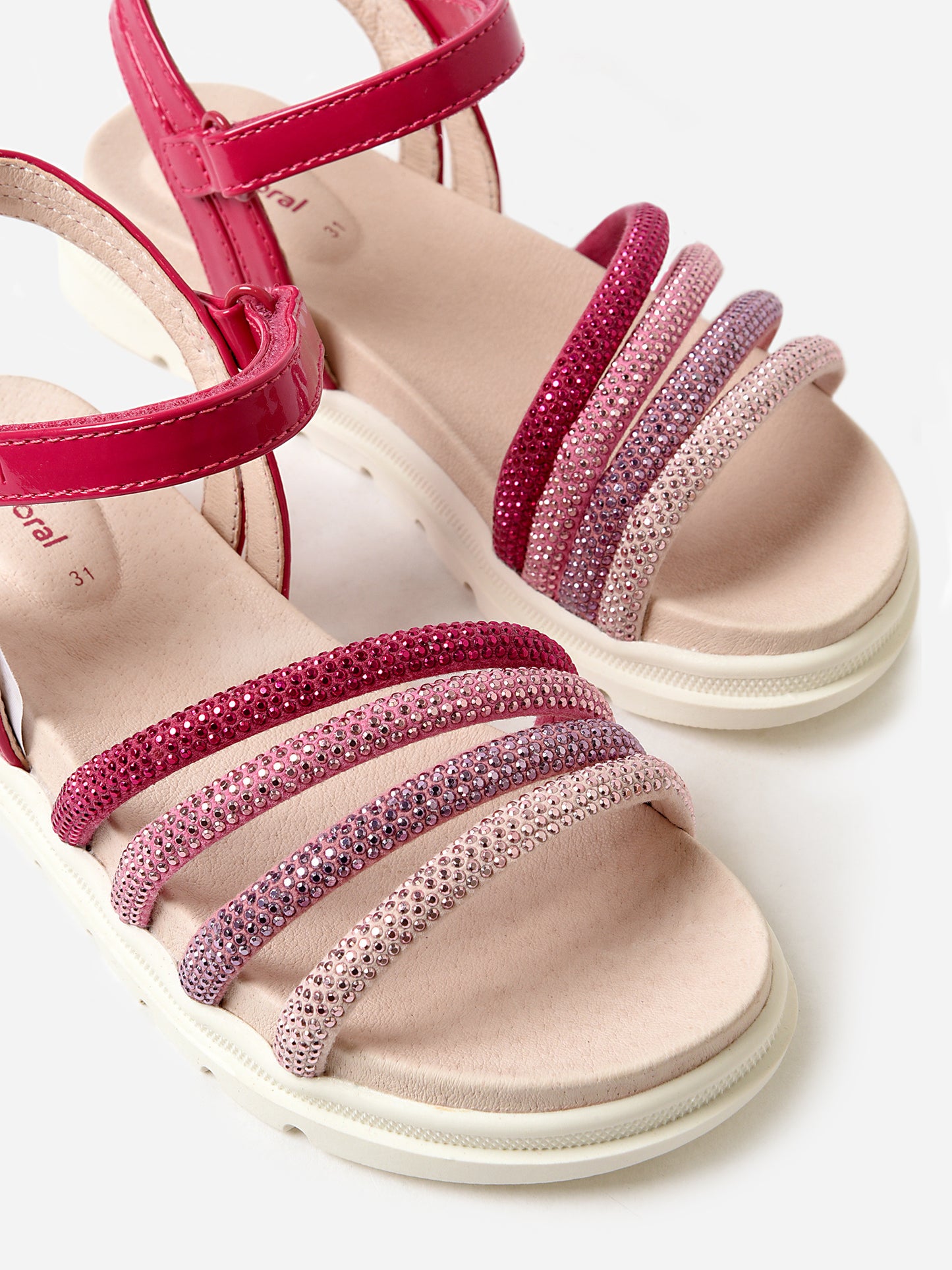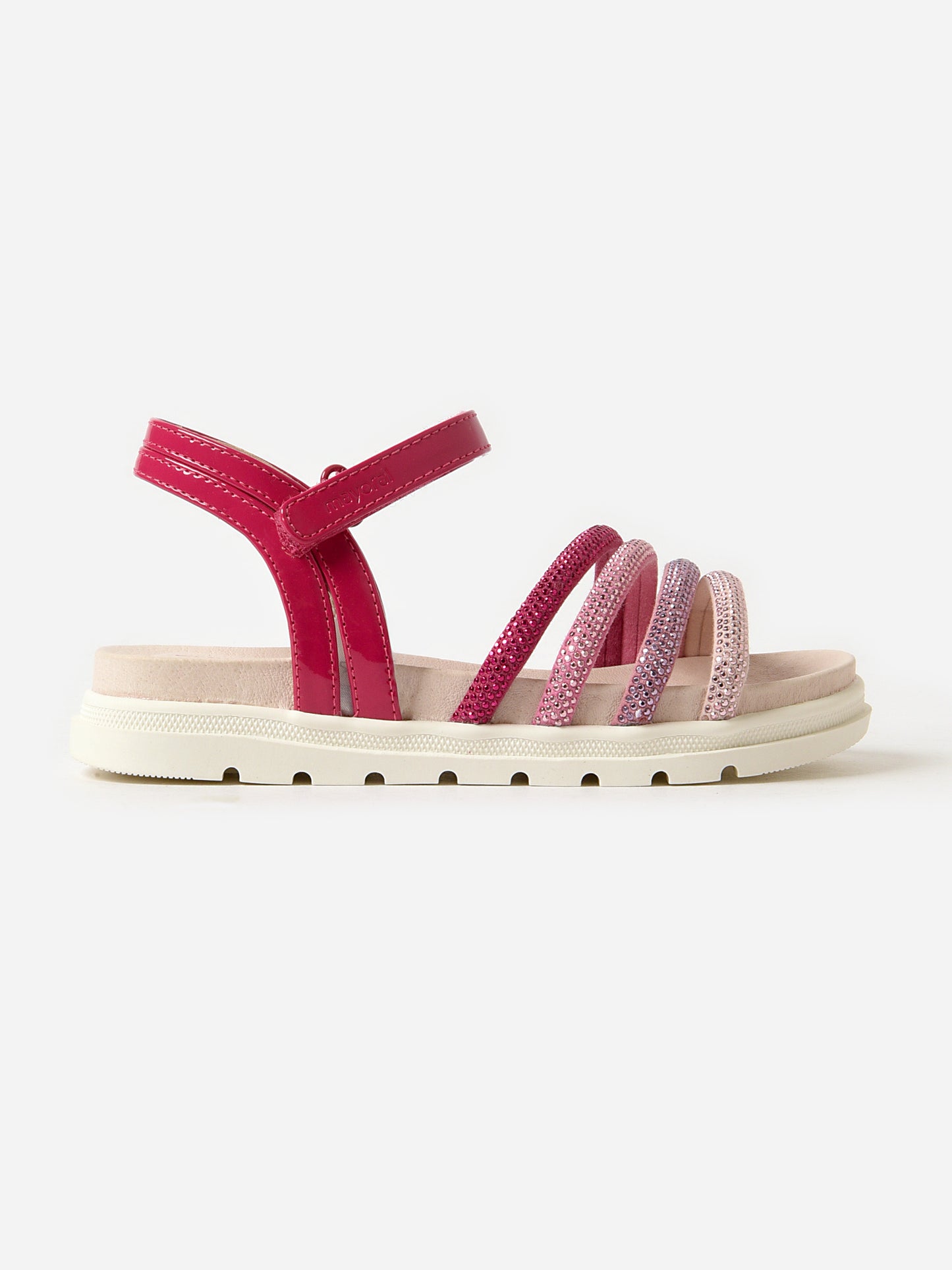A strappy sandal with rhinestone-embellished straps and an adjustable ankle strap.