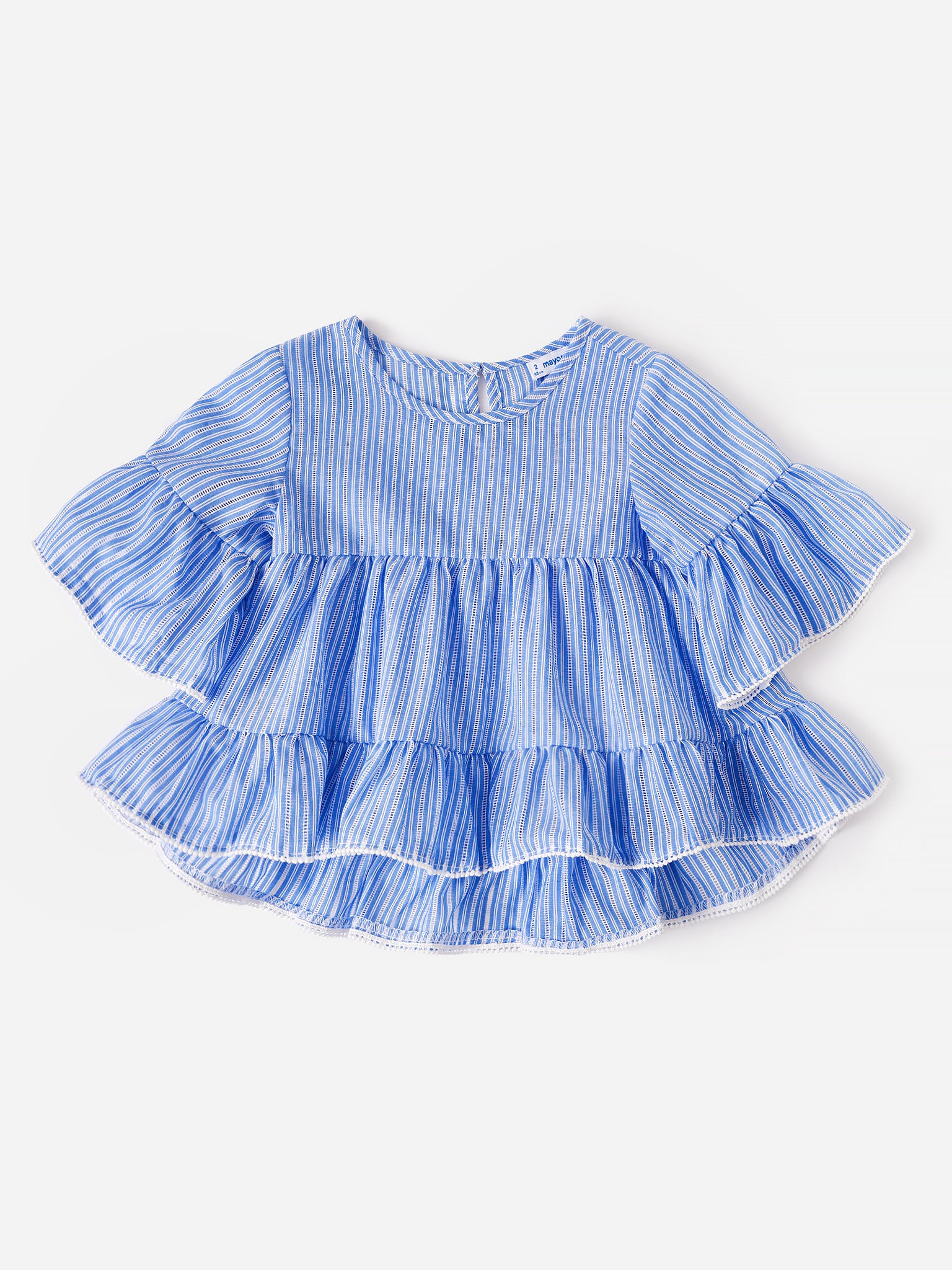 Striped blouse with decorative ruffle trims.