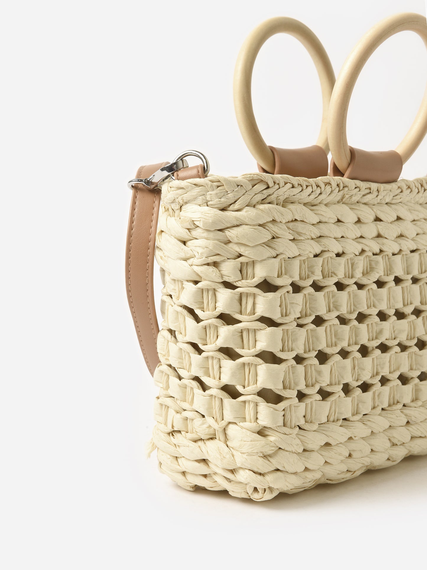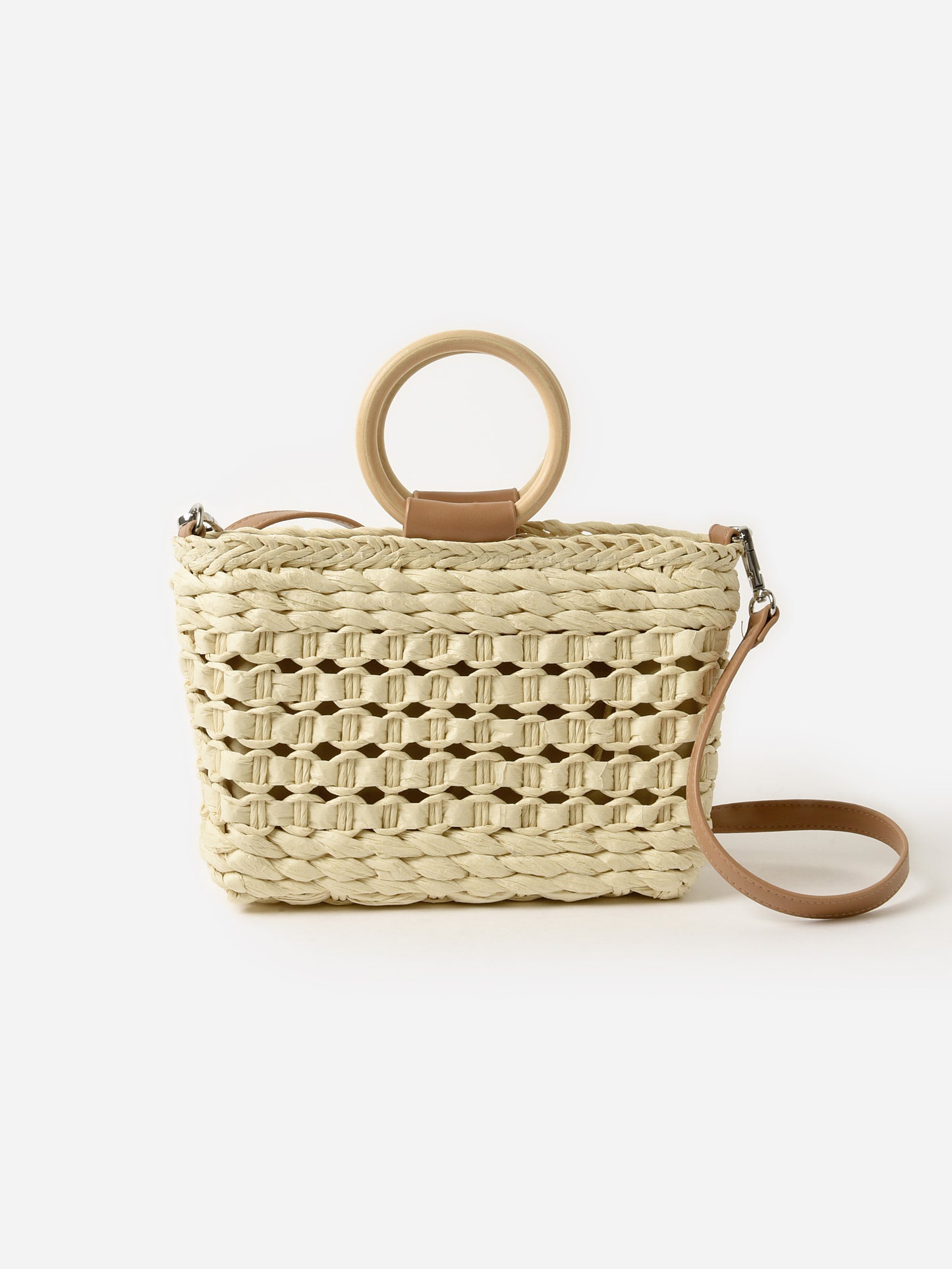 A boho-inspired handbag with a woven exterior and optional strap.