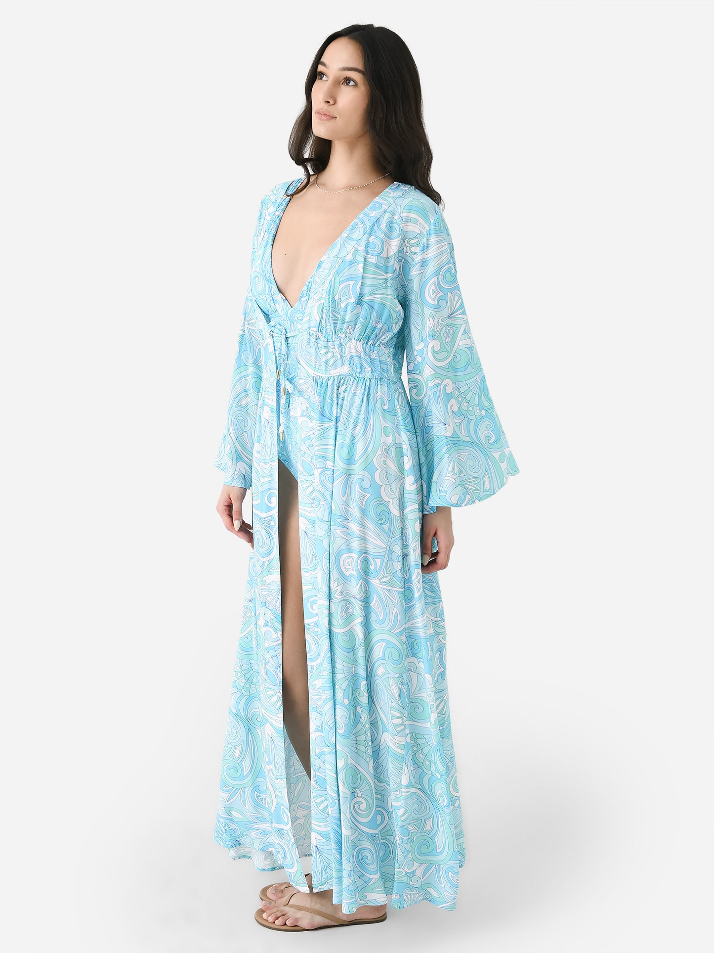 A glamorous, maxi-length cover-up featuring a plunging neckline and open-back detail.
