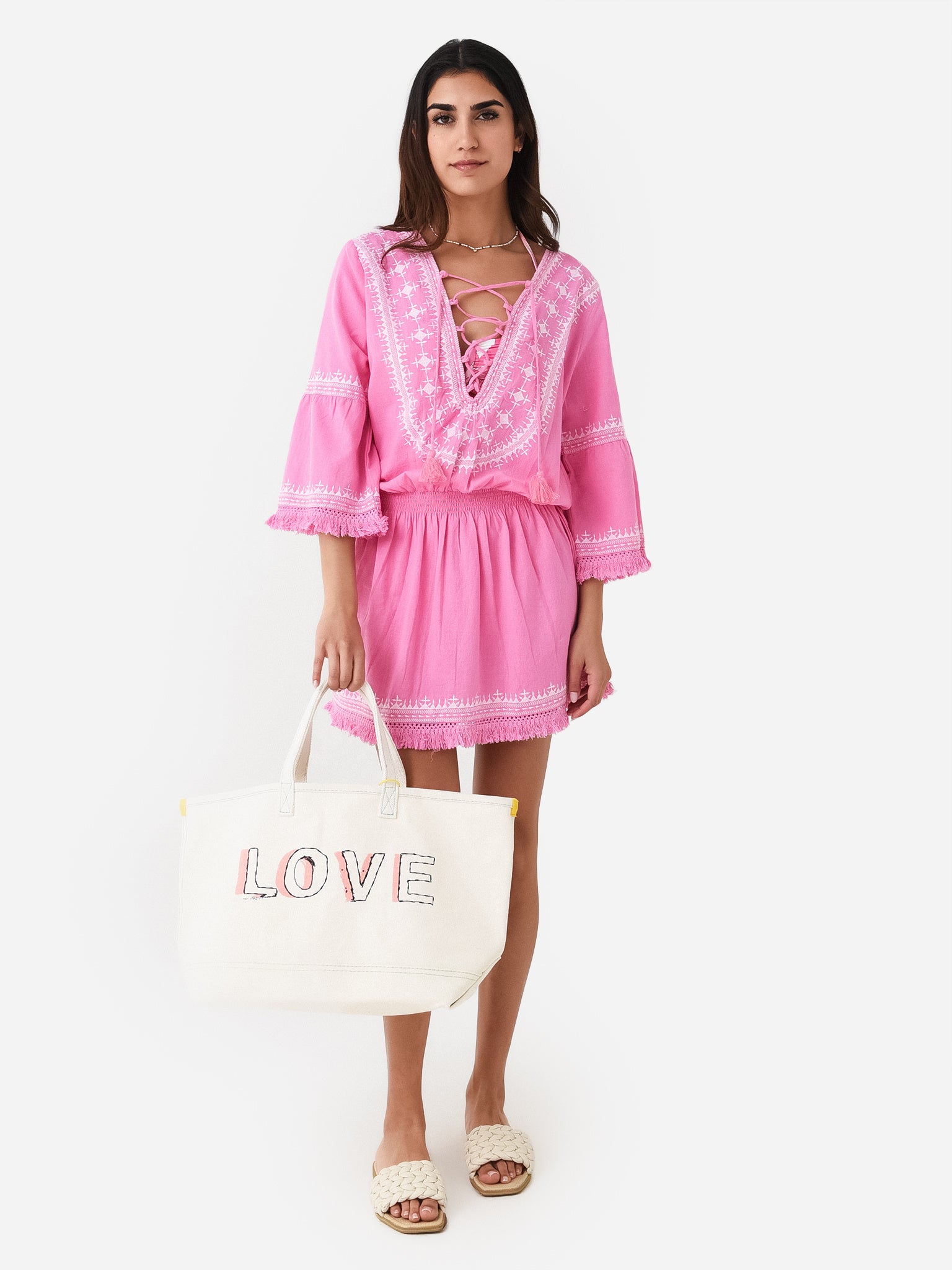 Lightweight cover-up with fluted sleeves, fringe trim, and embroidered details.
