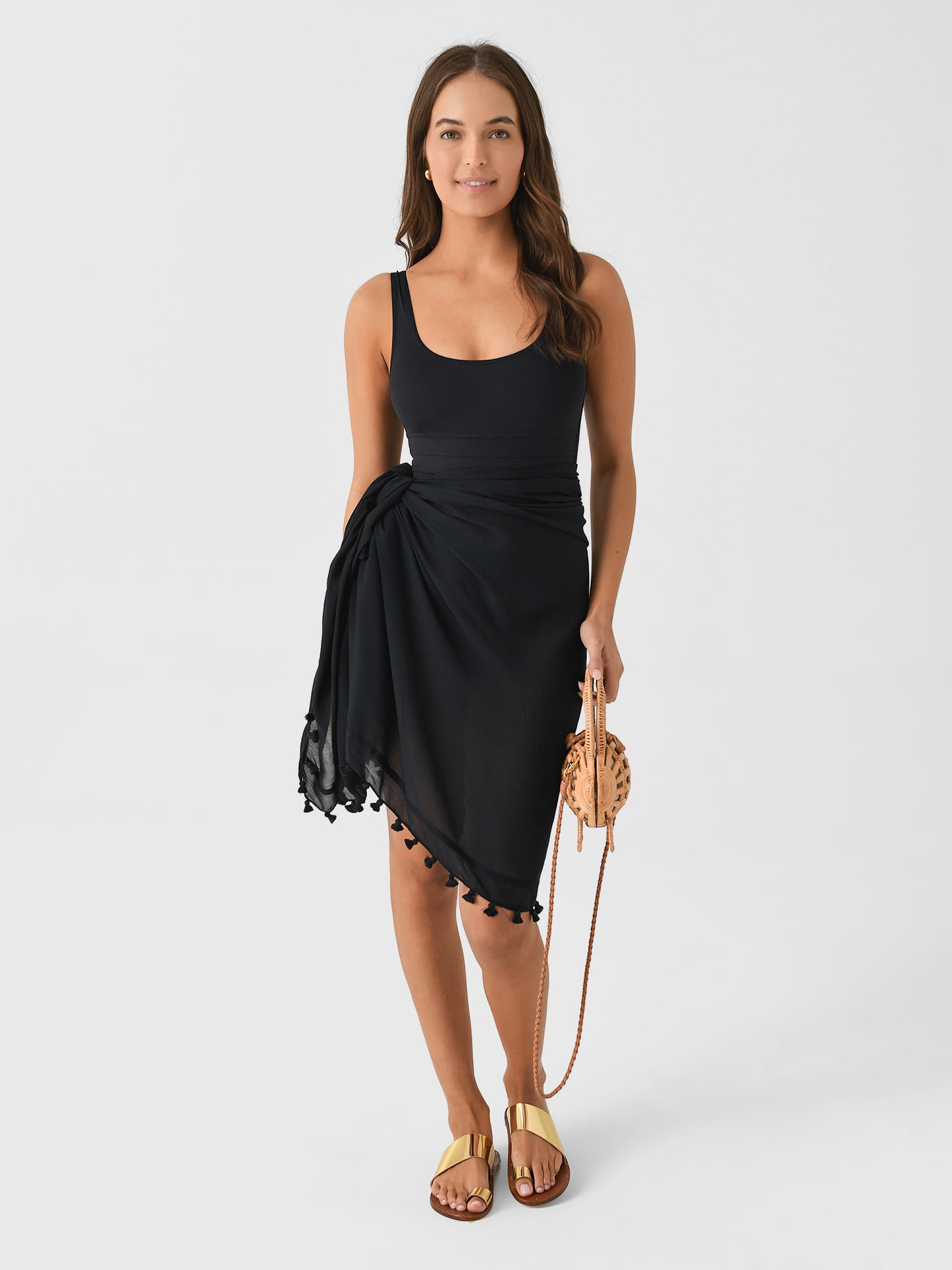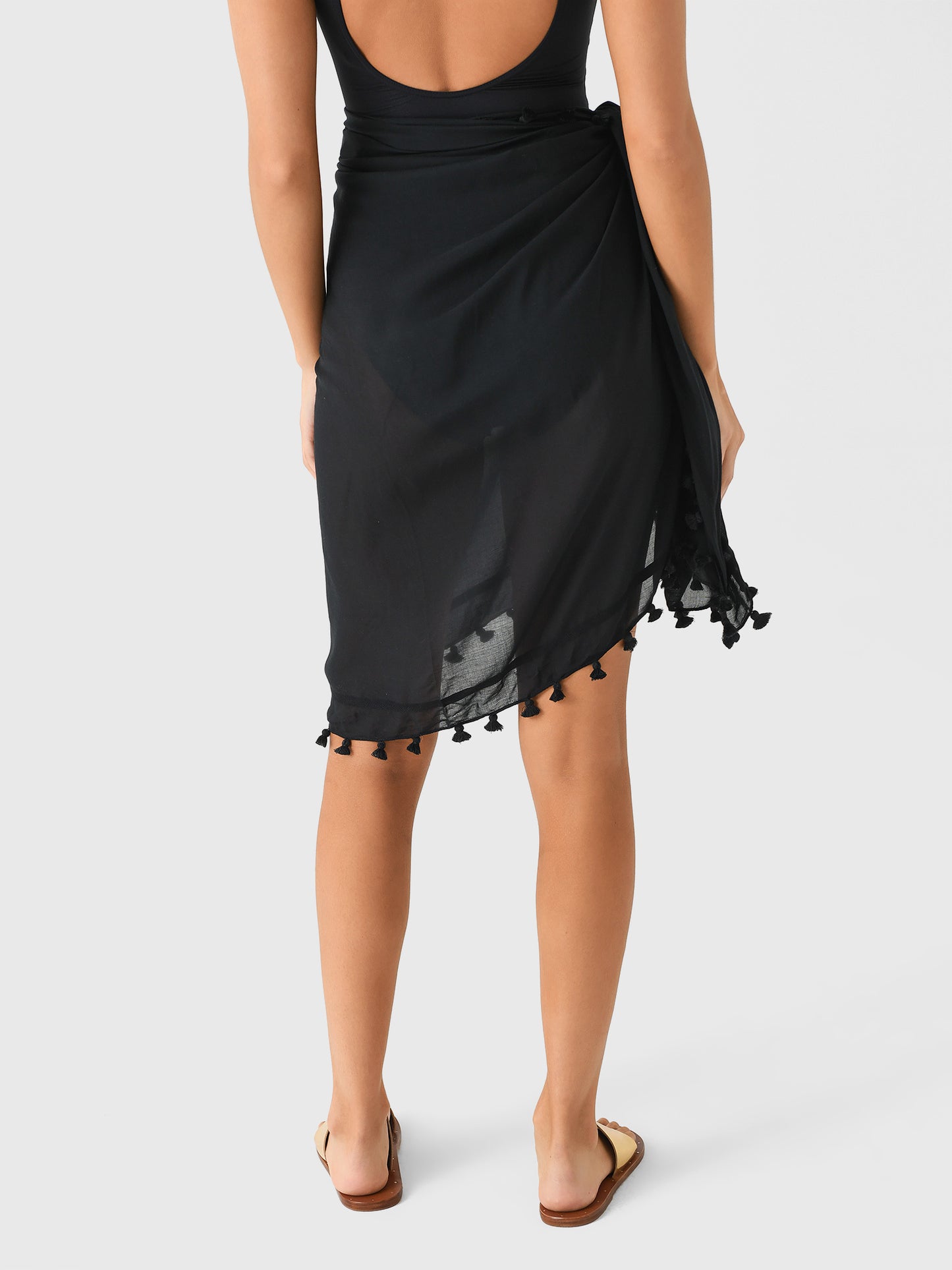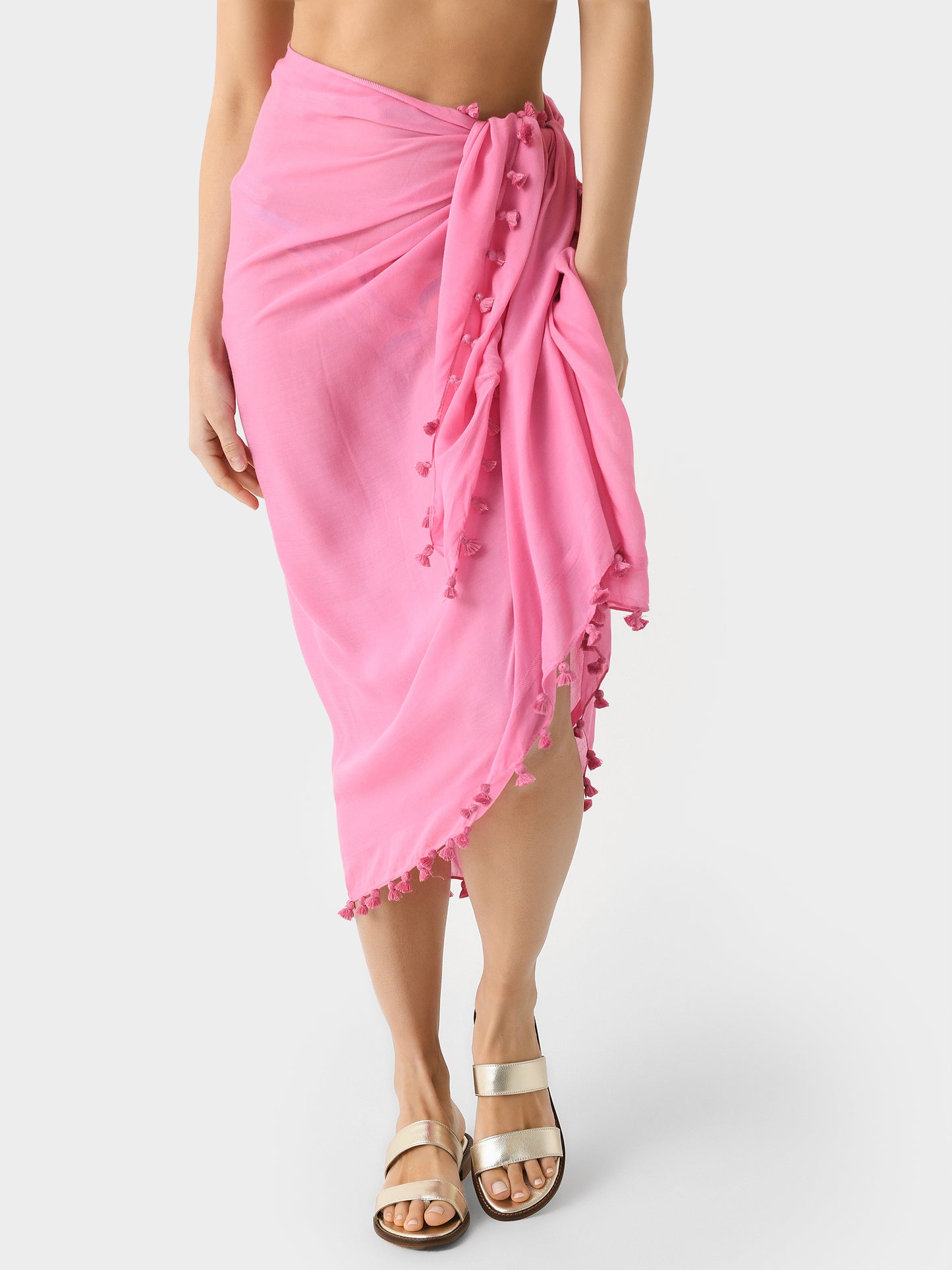 A versatile cover-up made from soft rayon fabric with tonal tassel trim detailing.
