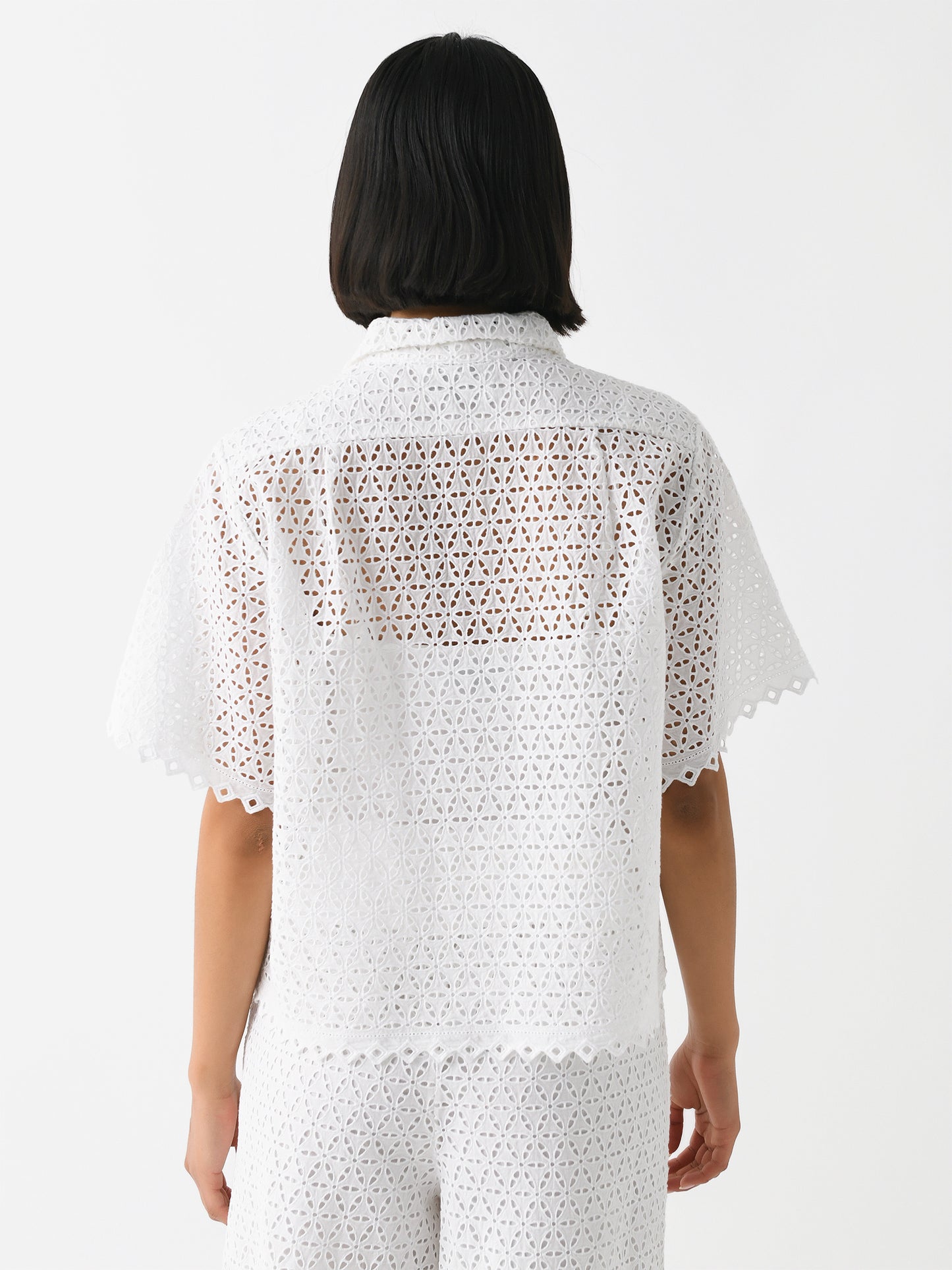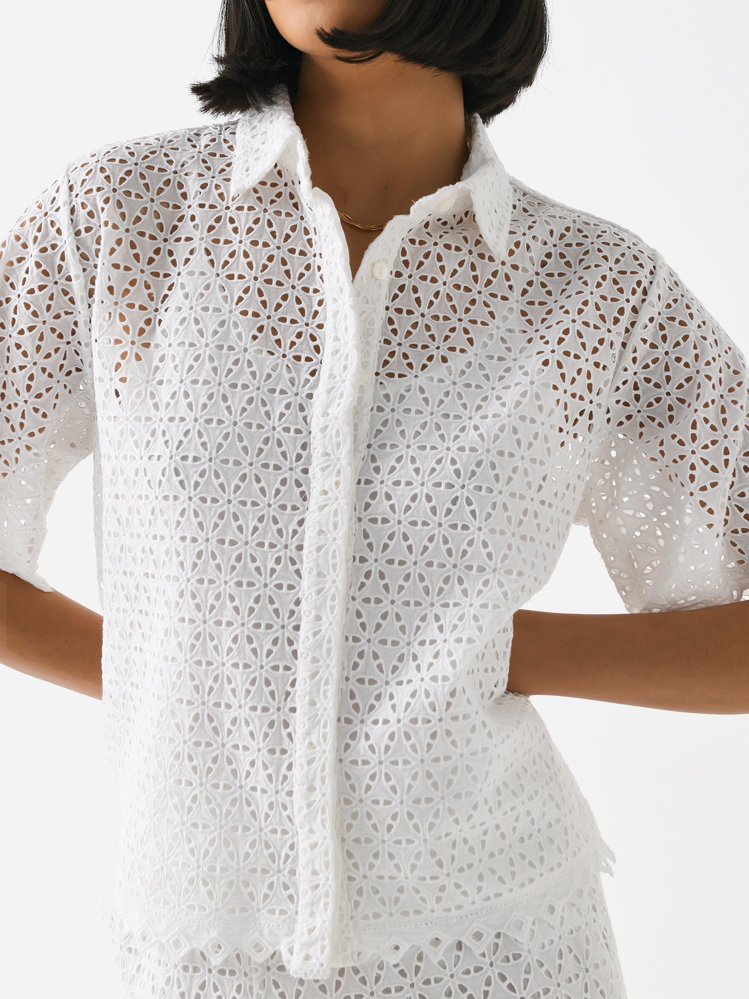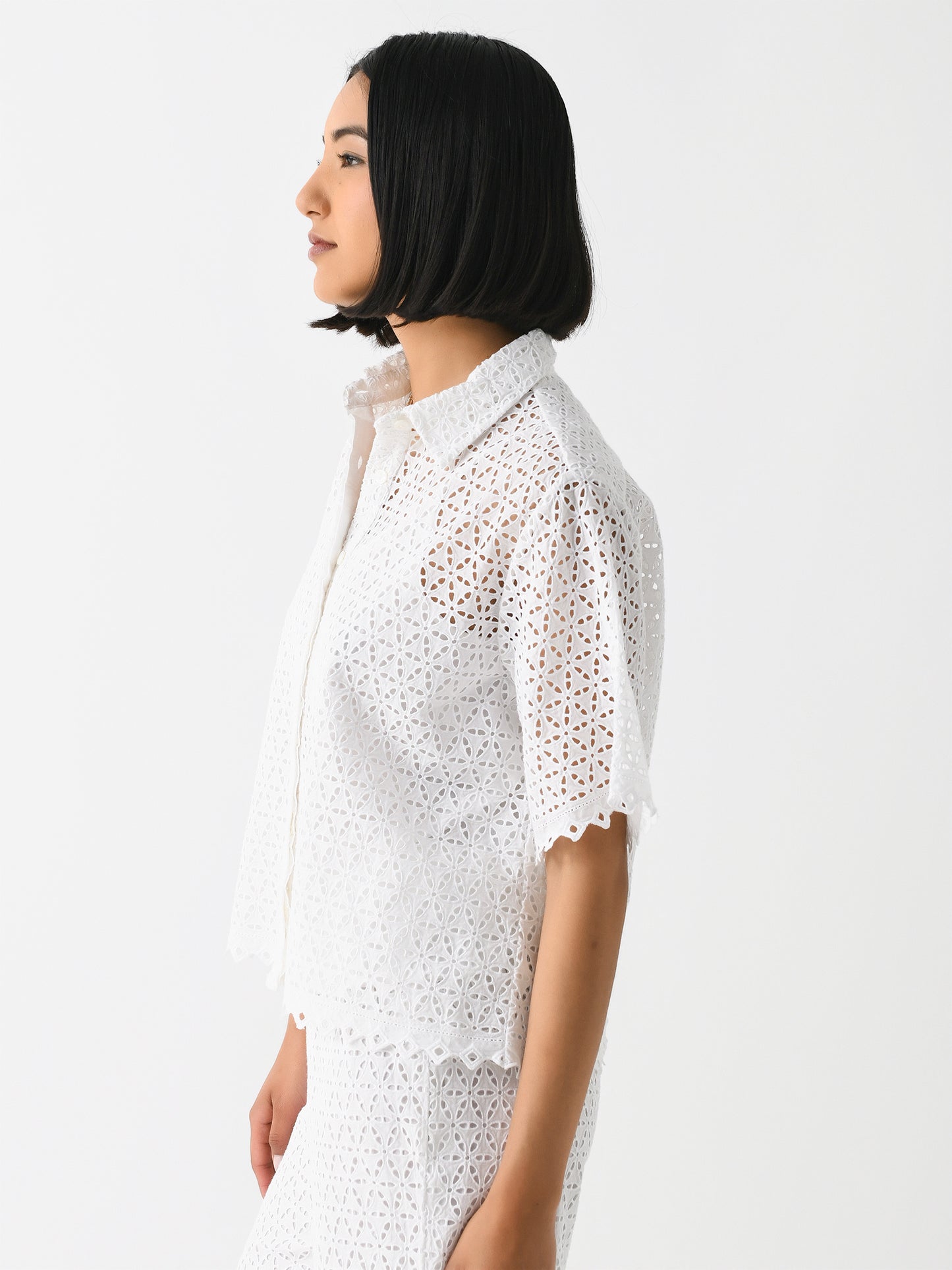 A short-sleeve blouse constructed from eyelet embroidery fabric with a hidden button-down placket.