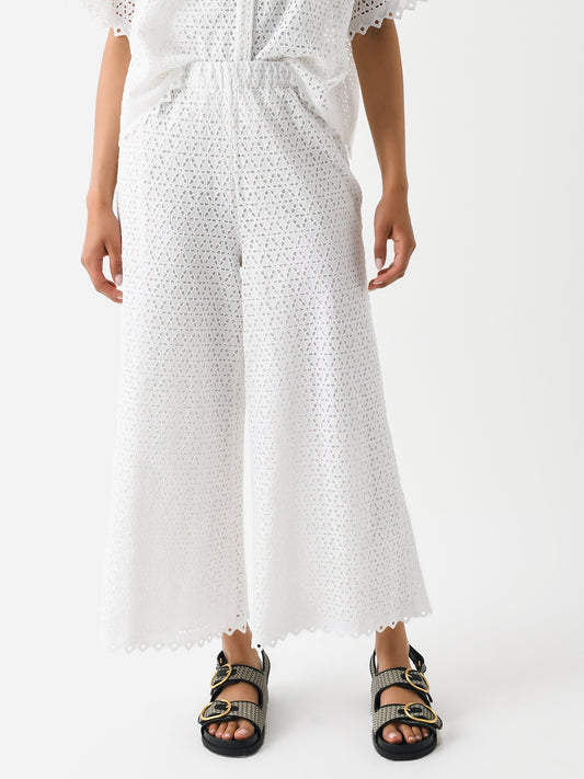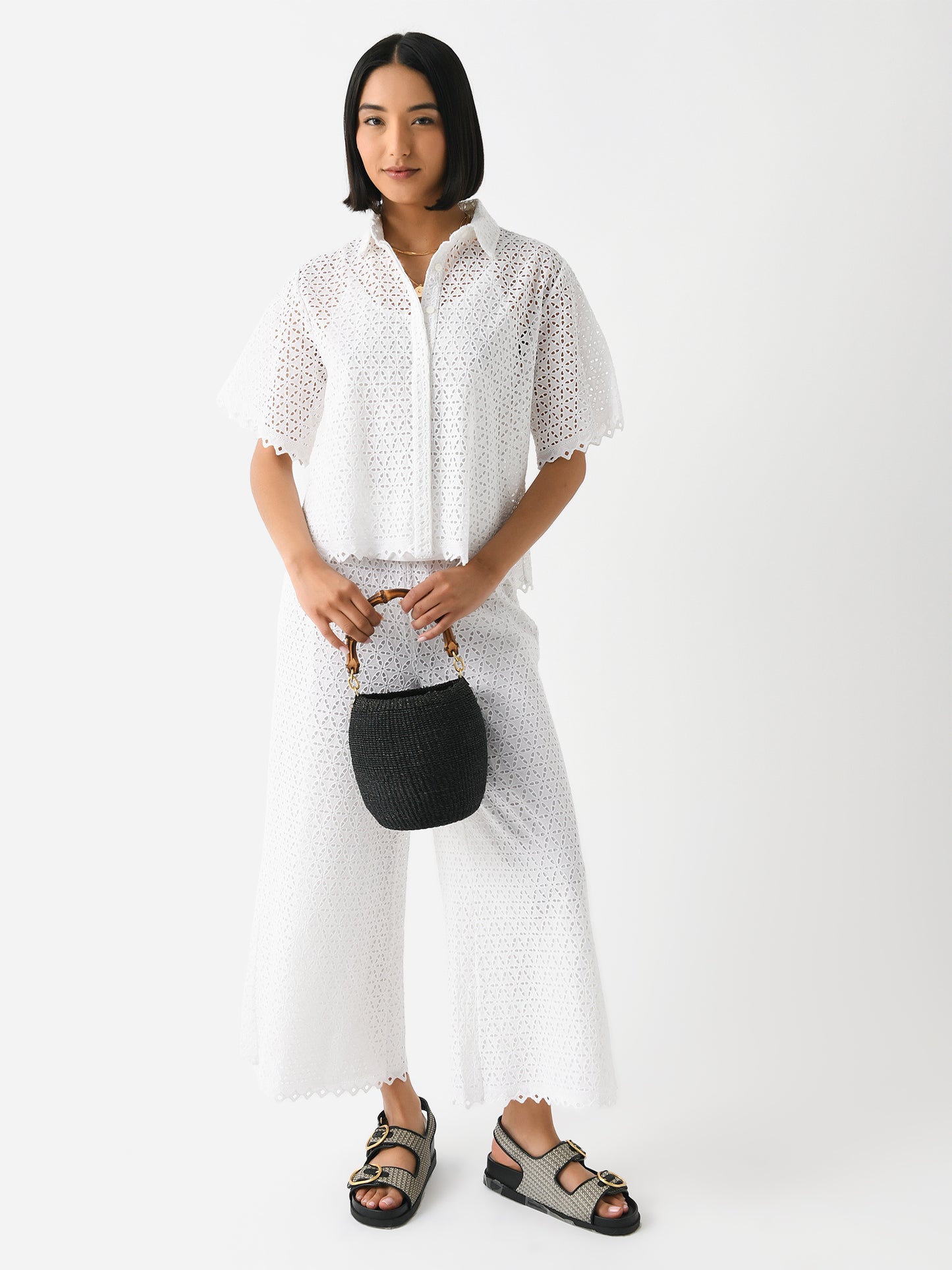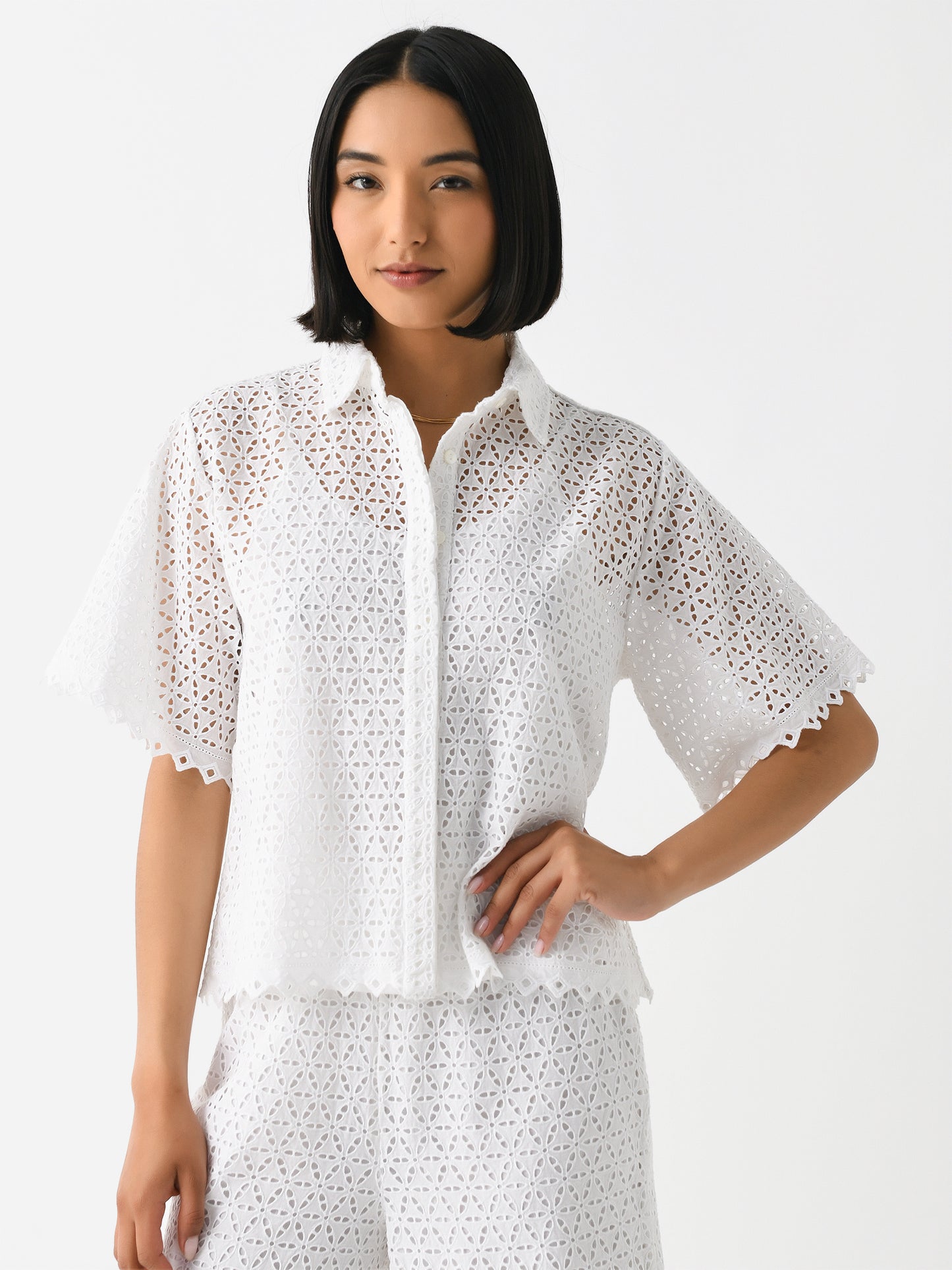 A short-sleeve blouse constructed from eyelet embroidery fabric with a hidden button-down placket.