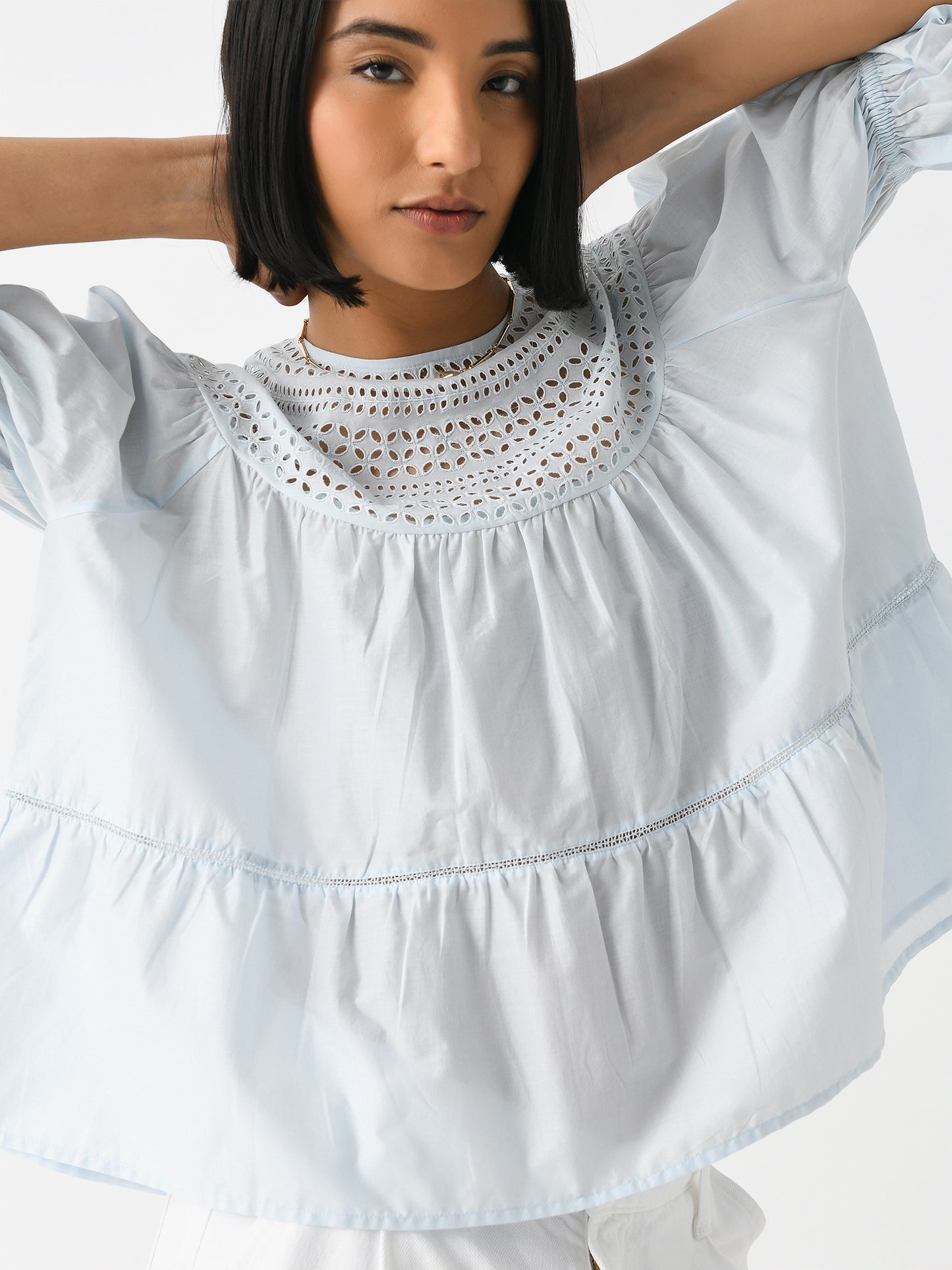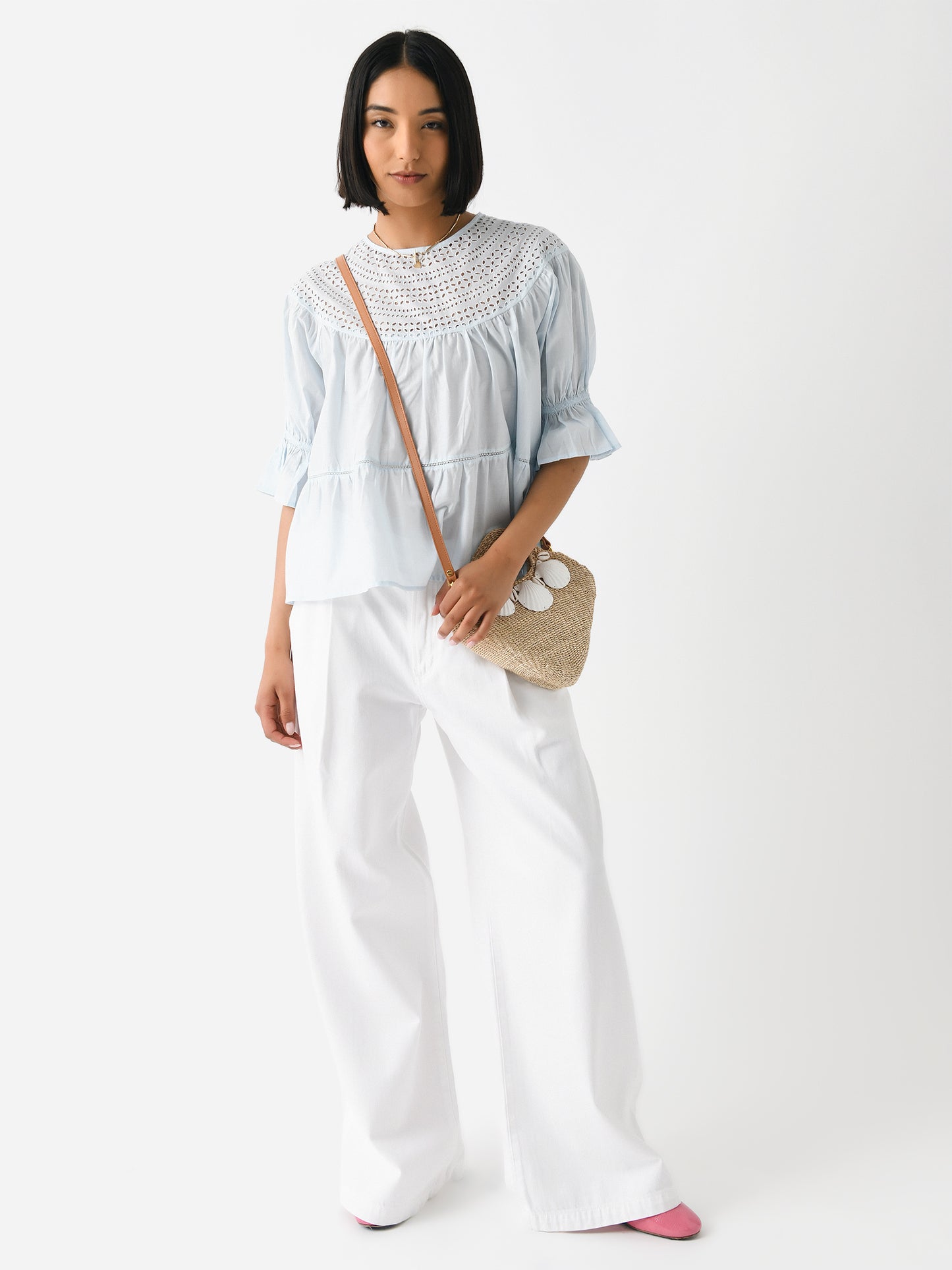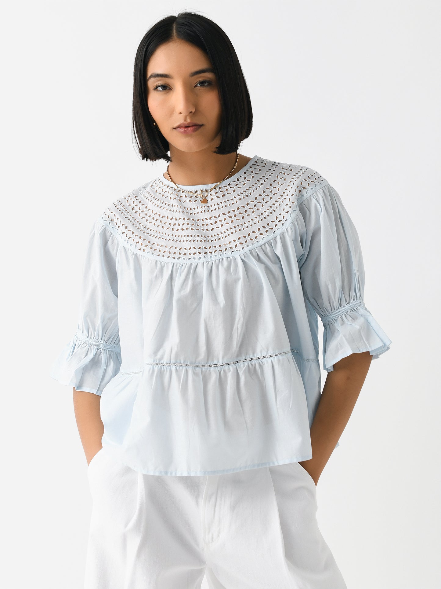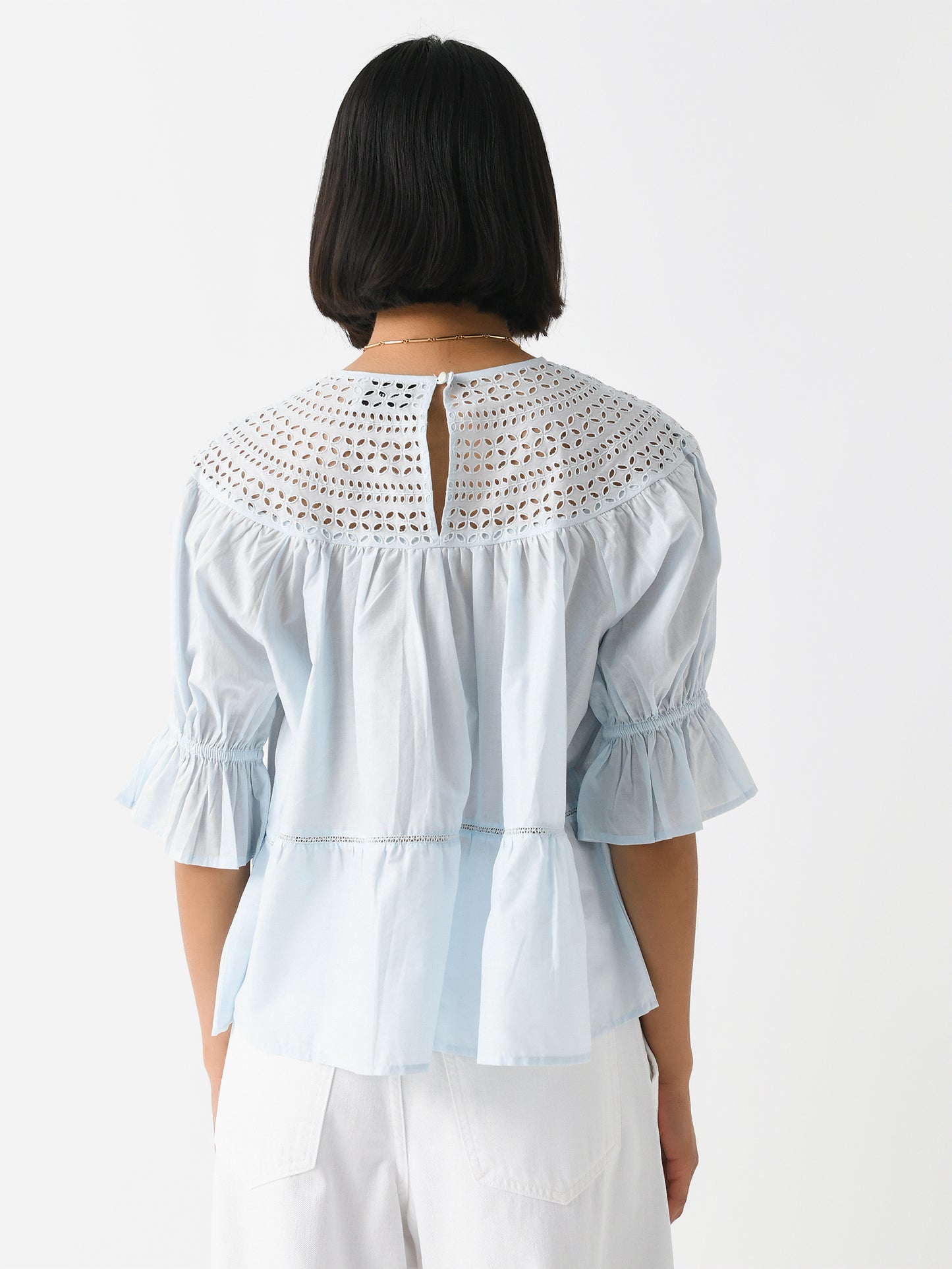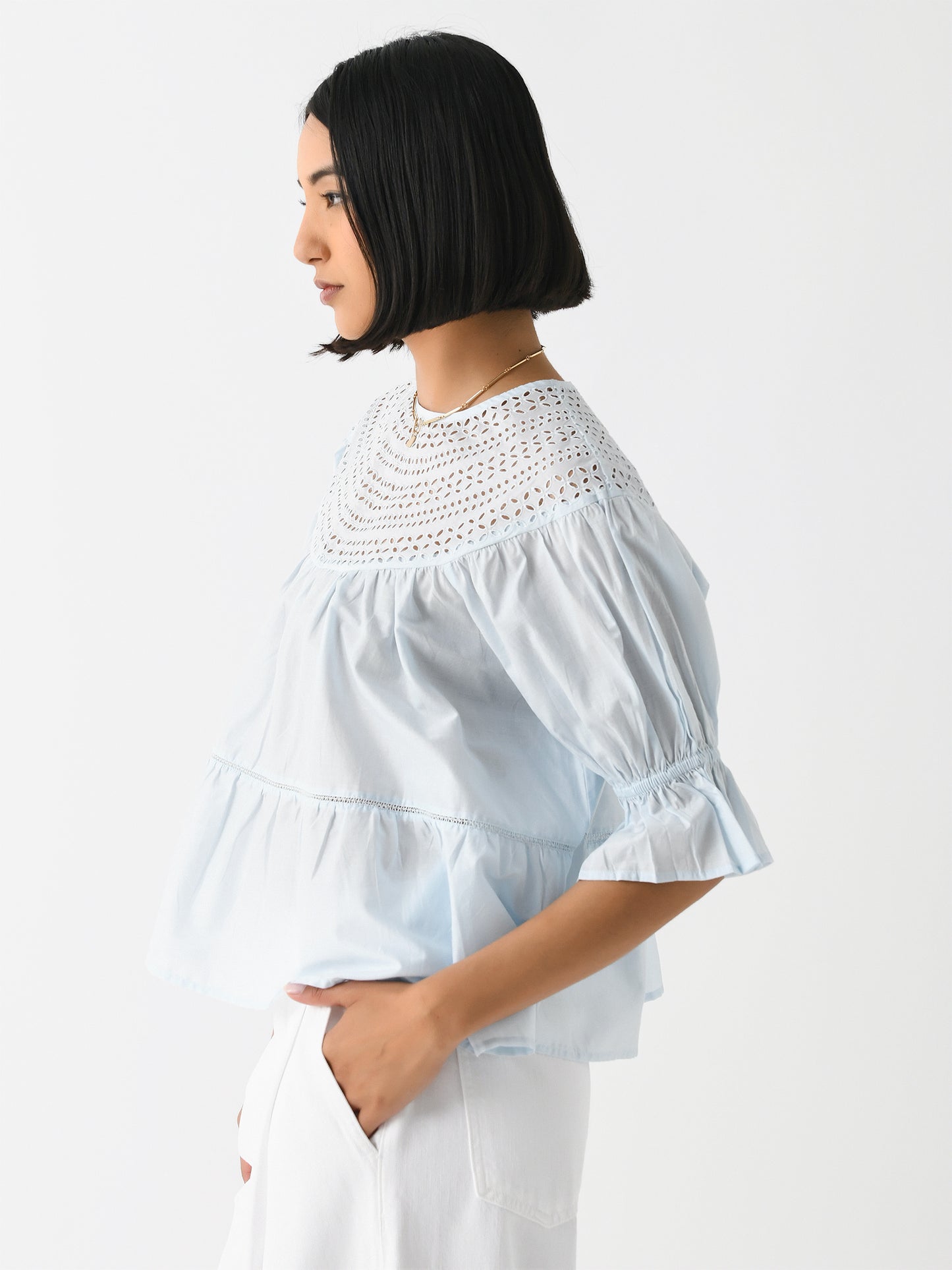 A voluminous blouse featuring an engineered eyelet lace yoke with a crochet-tiered body.