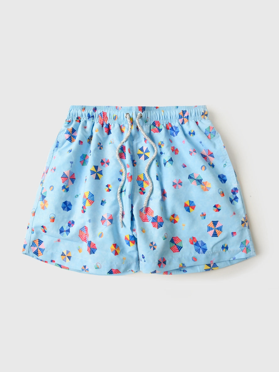 Designed for active comfort, this swim trunk offers superior breathability and a quick-drying finish. It features an interior cyclist liner for added support, set against a playful beach umbrella print.