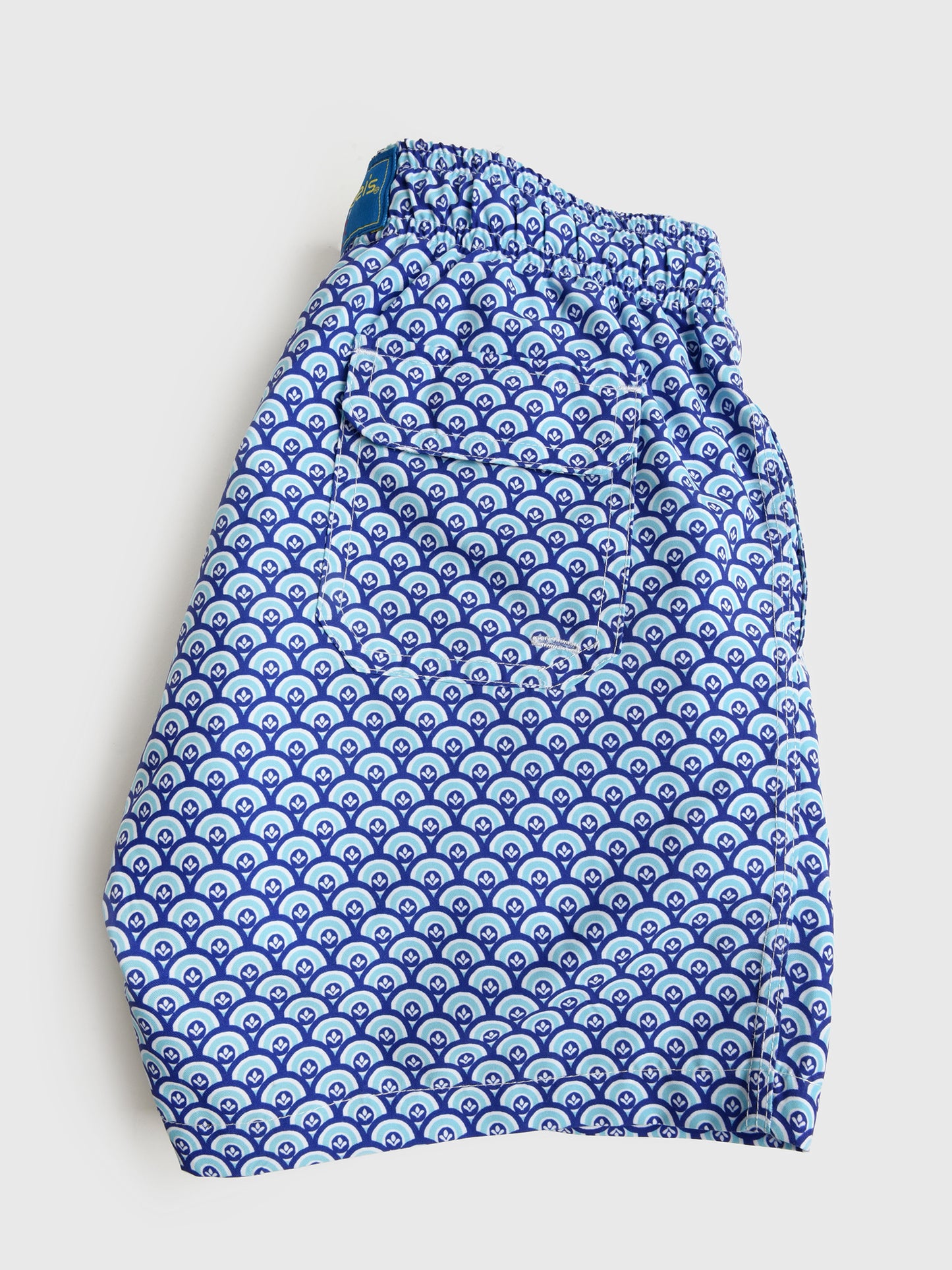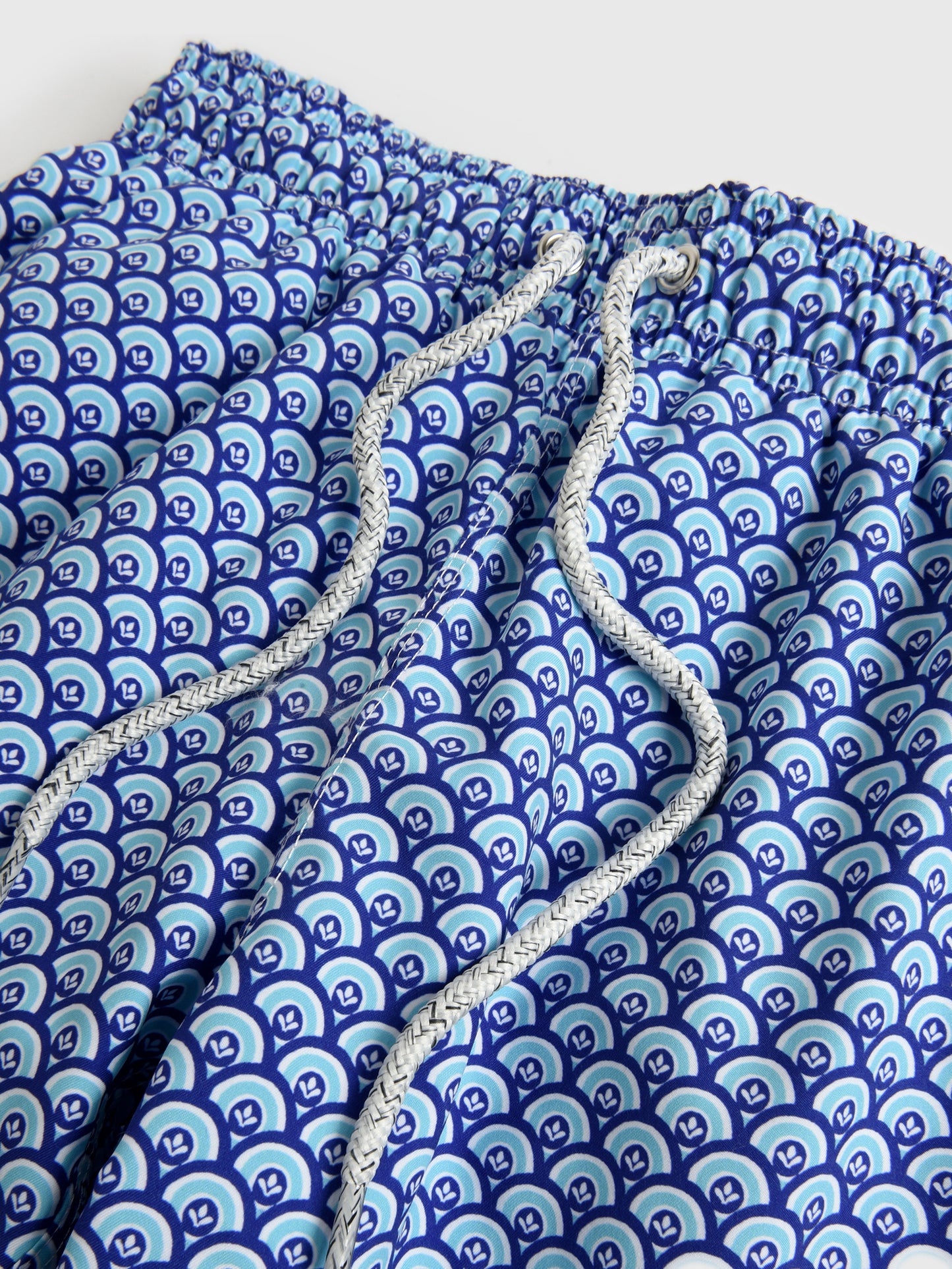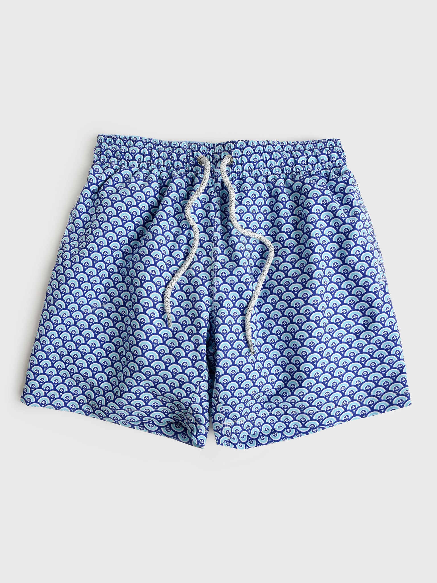 This lightweight swim trunk is crafted from quick-drying fabric and features a custom half-moon print.