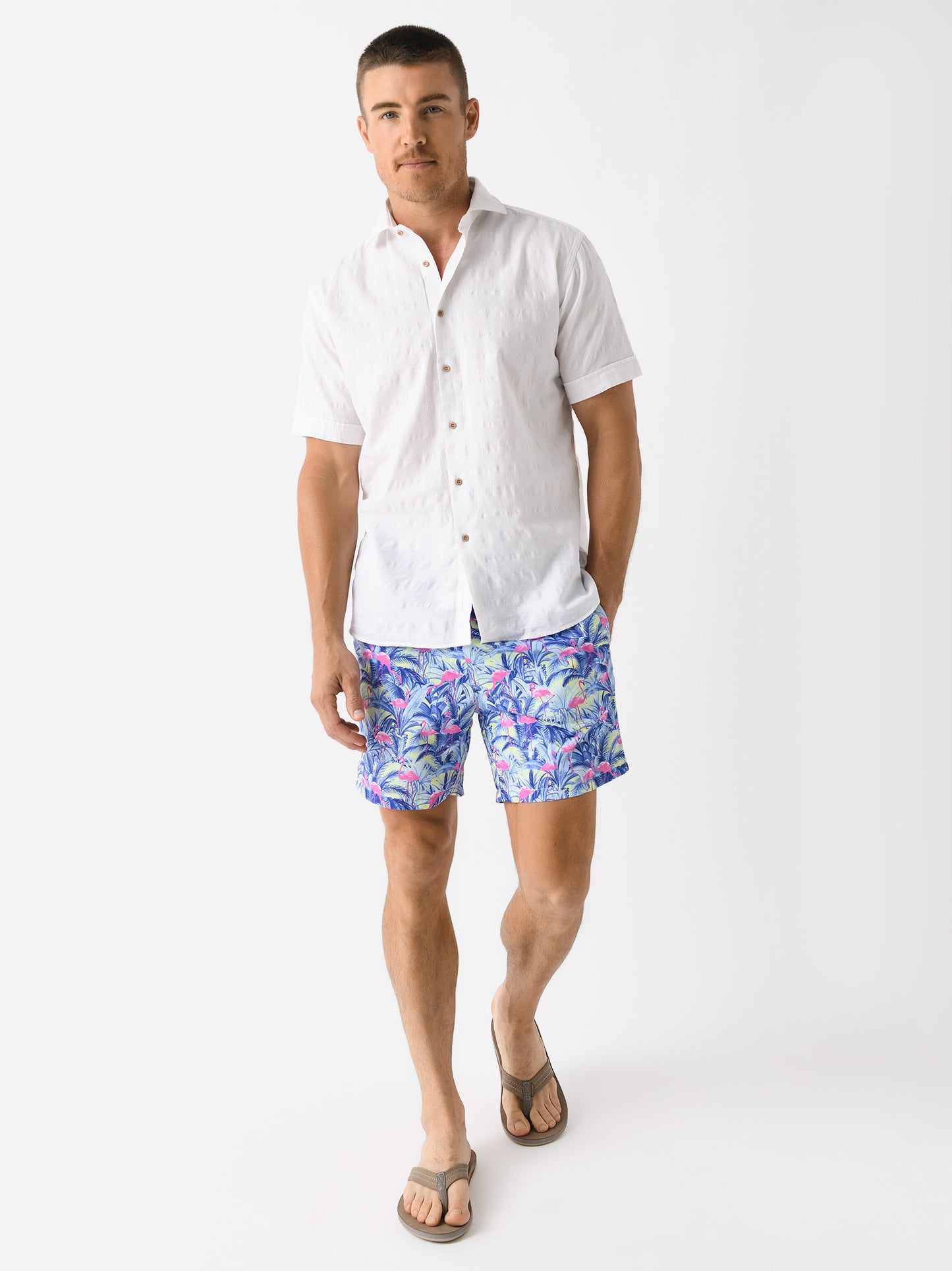 A soft peached swim trunk with a mesh cyclist liner and colorful flamingo-inspired print.