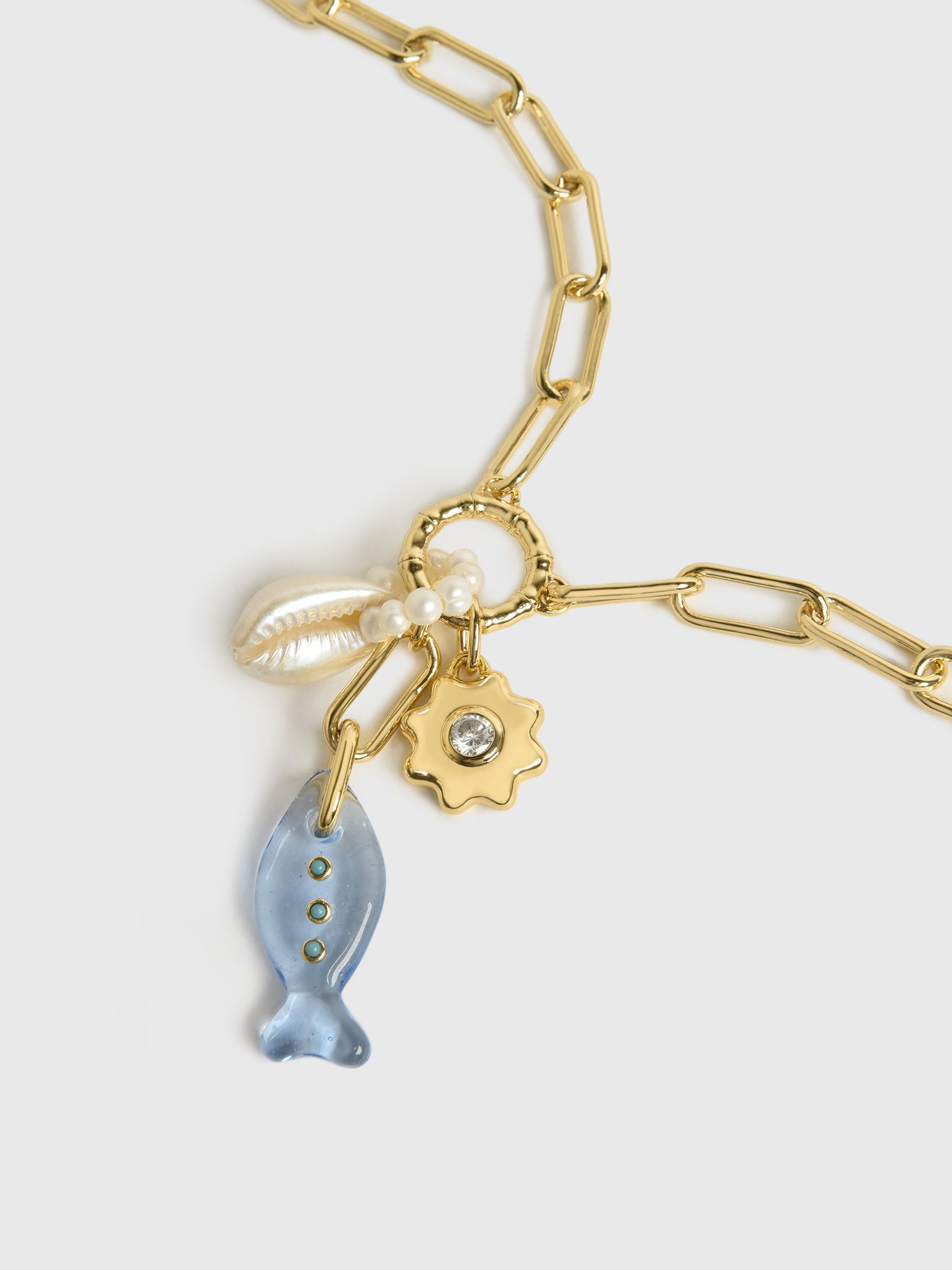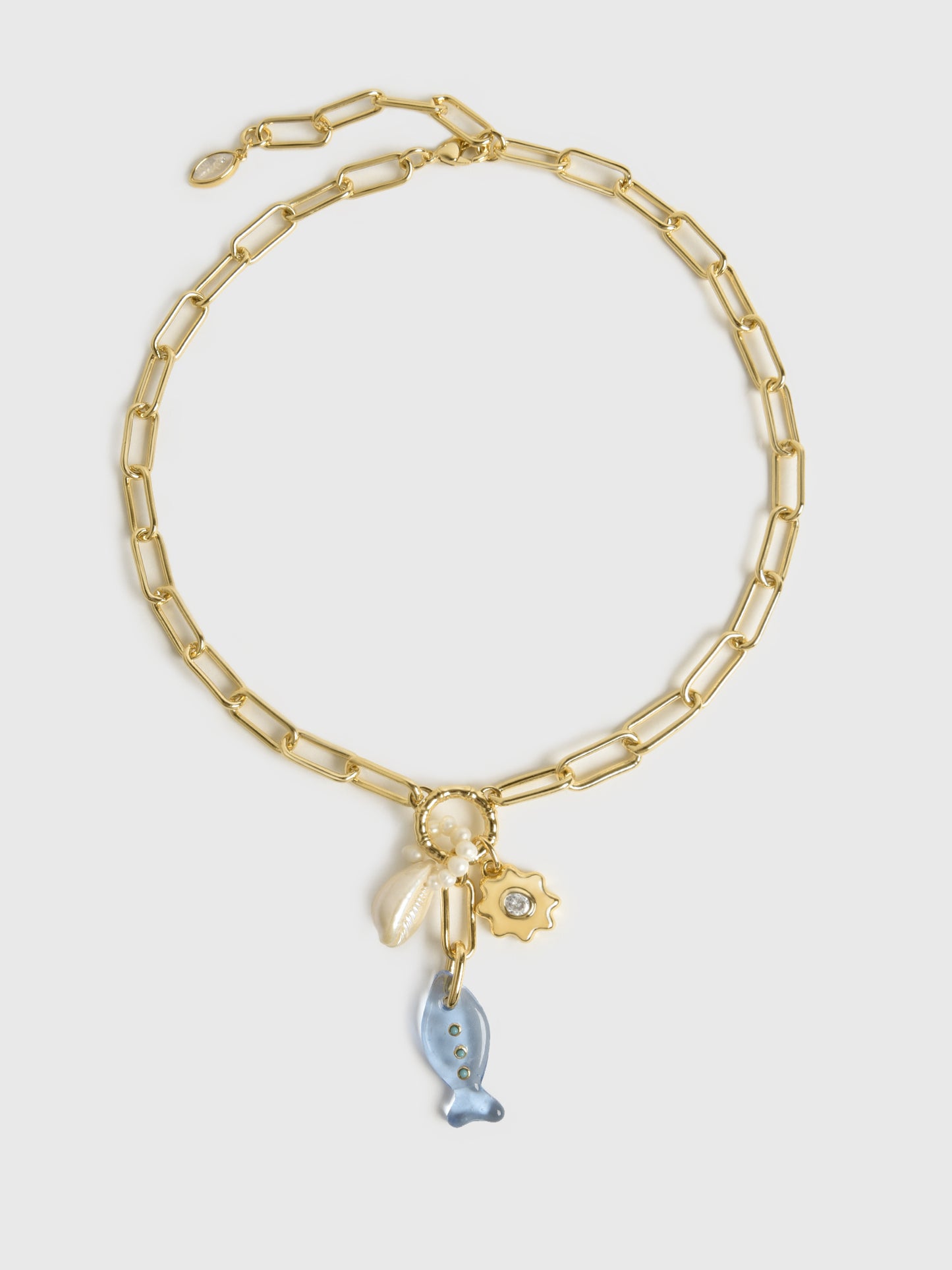 Your essential charm necklace for any occasion. Three delicate, sea-inspired charms dangle from a mini paperclip chain, offering a minimalist tropical touch that complements any style.