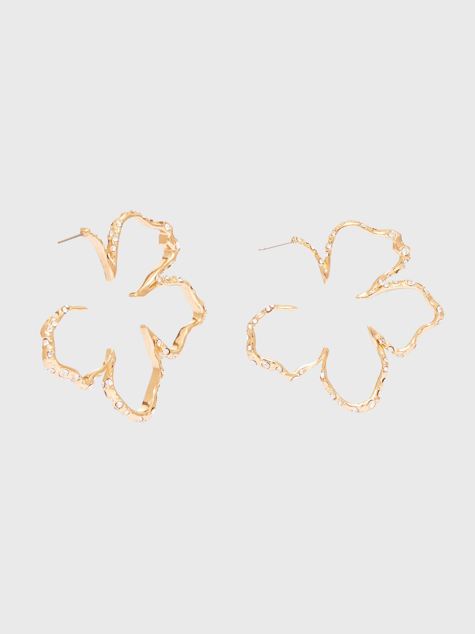 Encrusted pave crystals set in floral pave hoops create a versatile wearable piece without compromising glimmer in the Mignonne Gavigan Mini Simone Sculptural Floral Hoop Earring.
