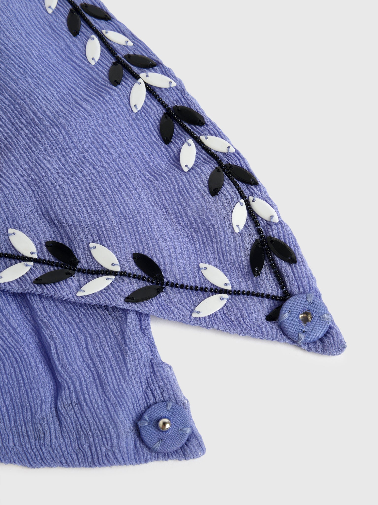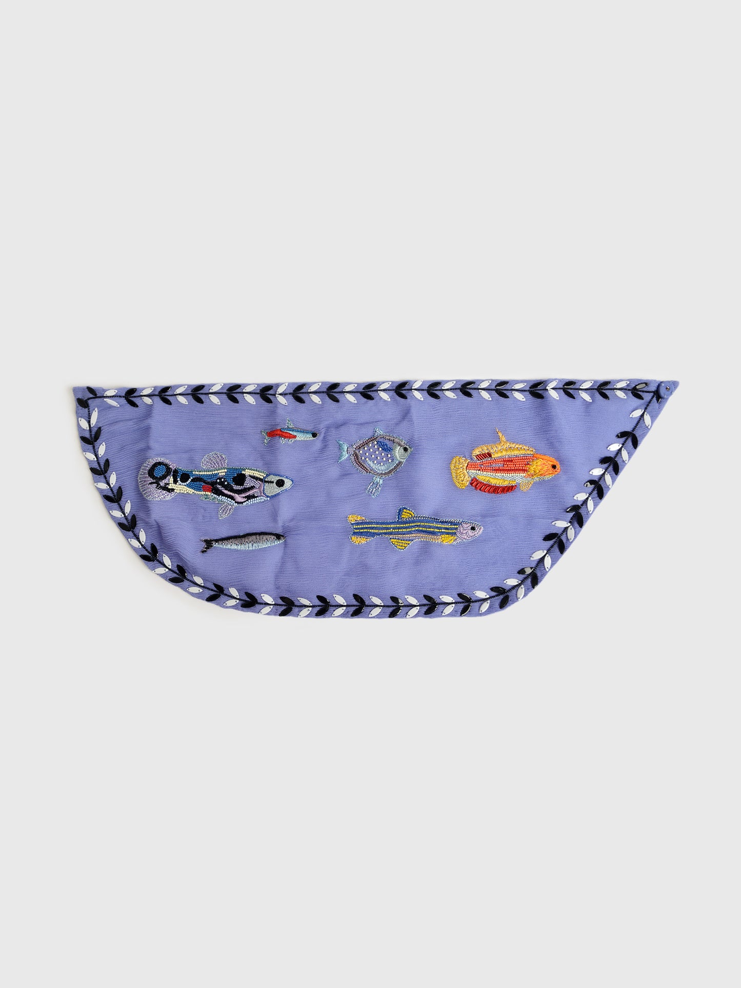 This intricate scarf features a vibrant school of beaded and sequined fish, each meticulously crafted, across a canvas of cerulean blue silk.