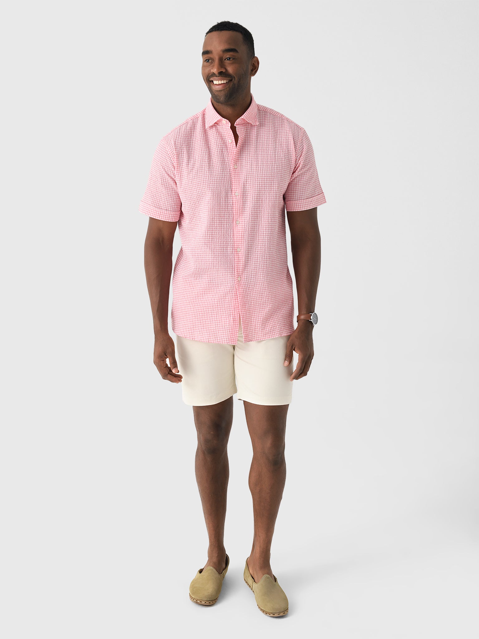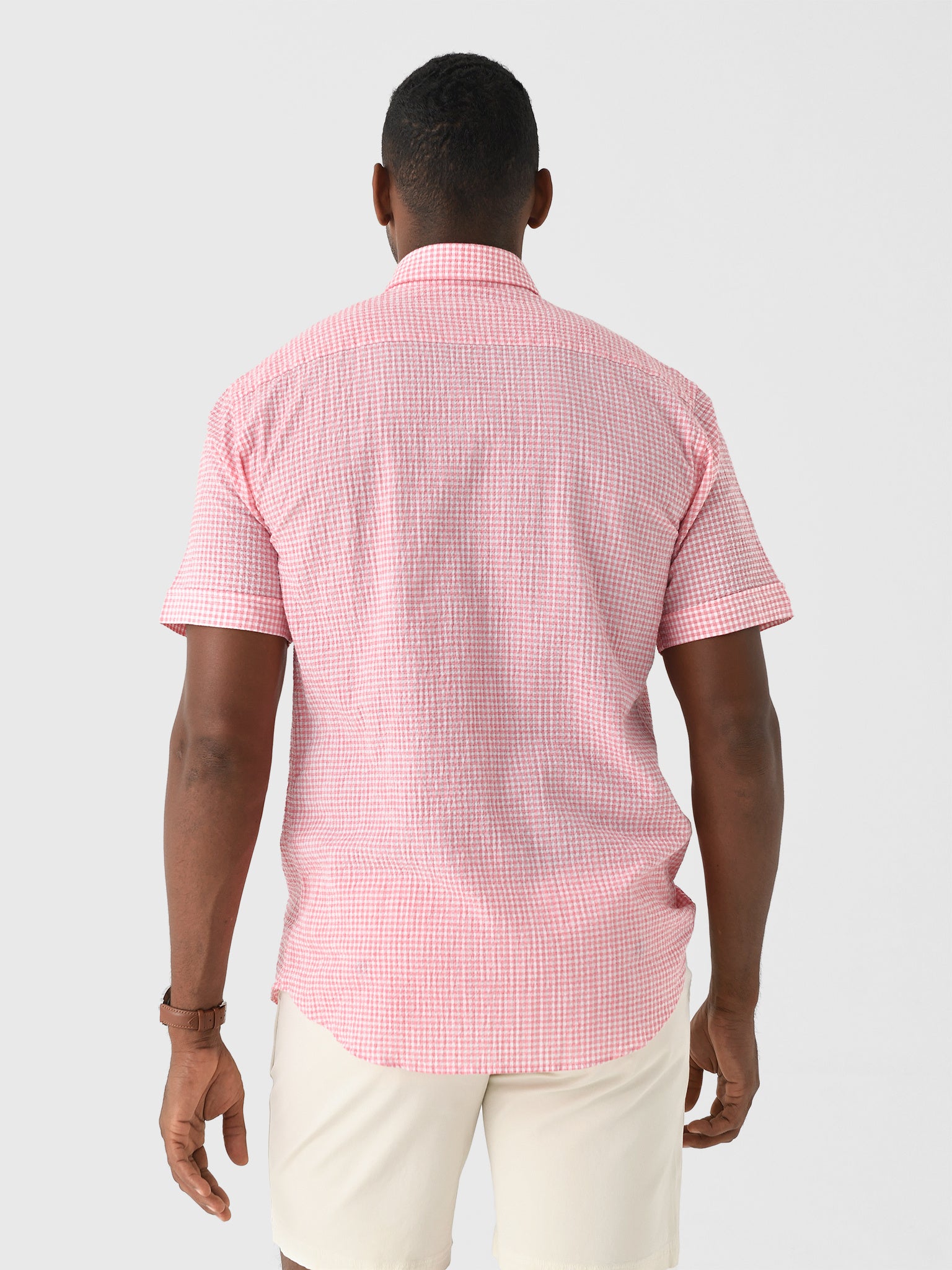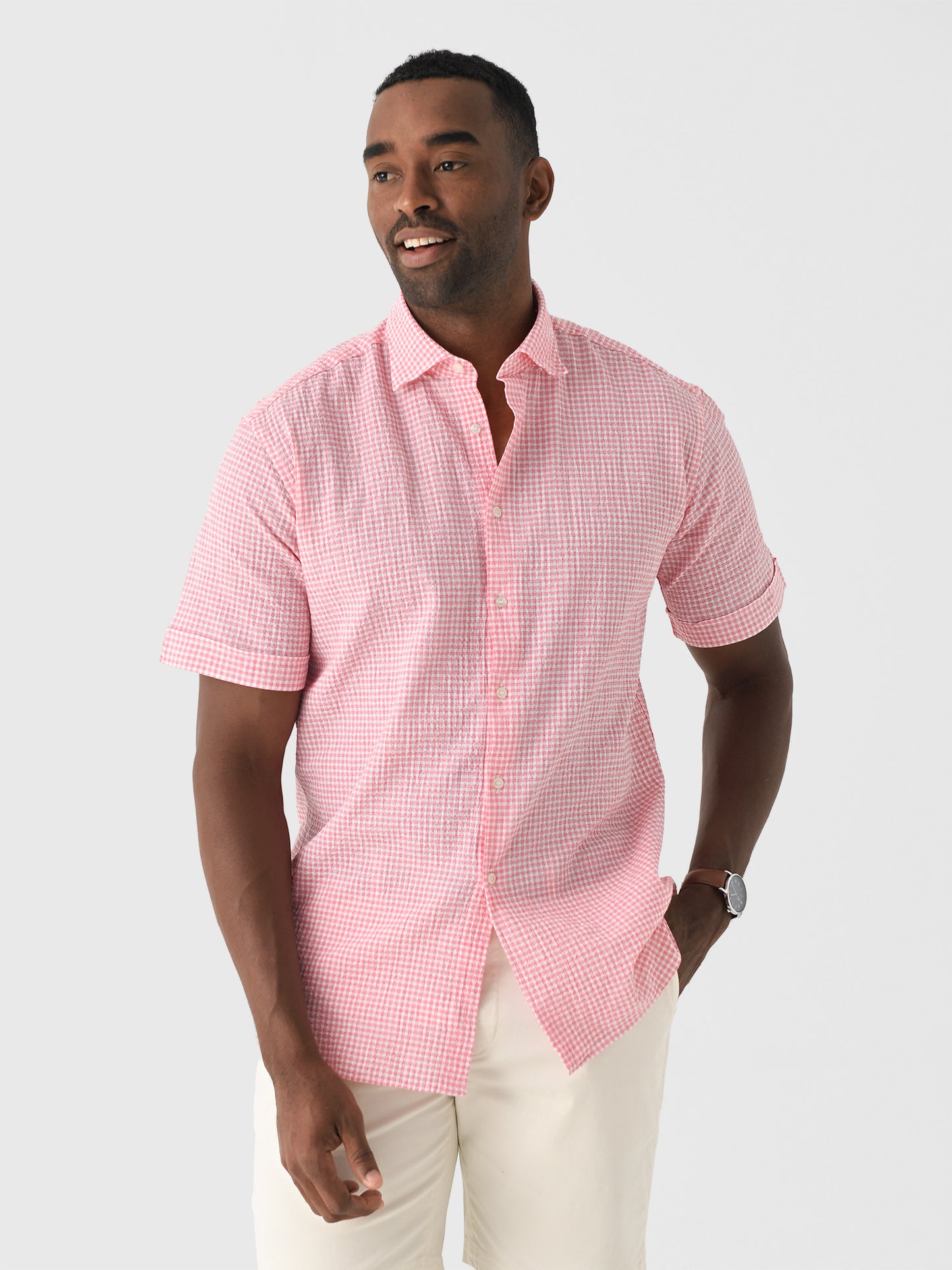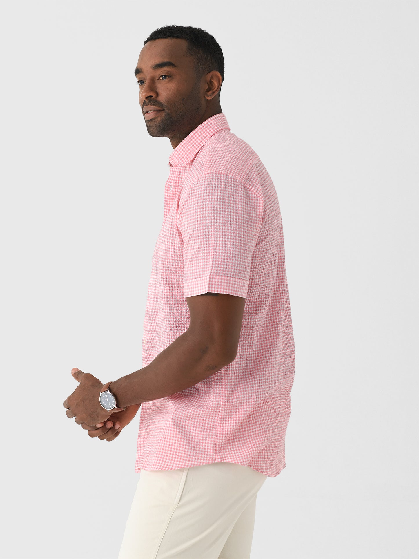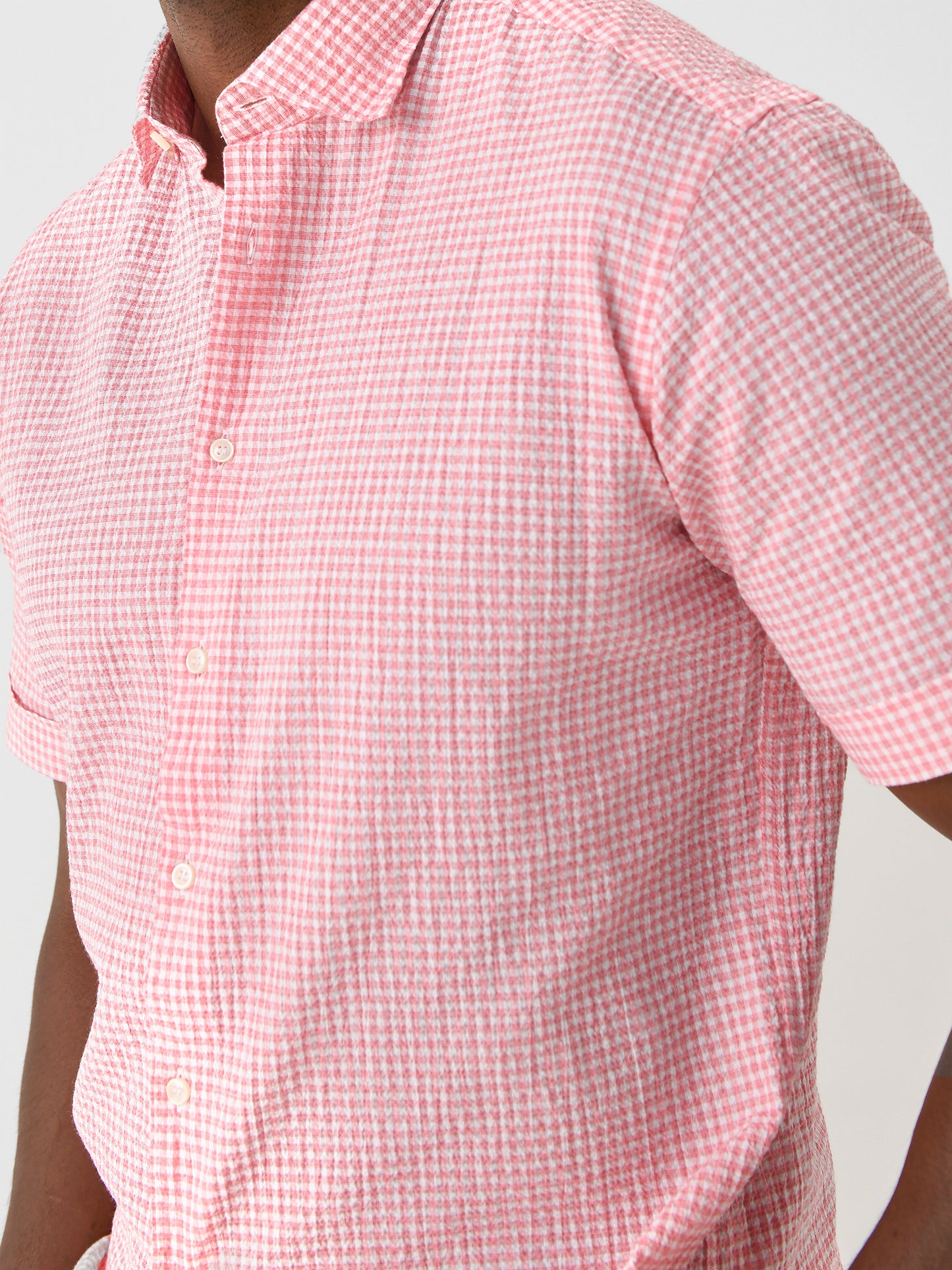 A lightweight and airy button-down shirt made from gingham-printed seersucker fabric with cuffed sleeves and a button-down collar.