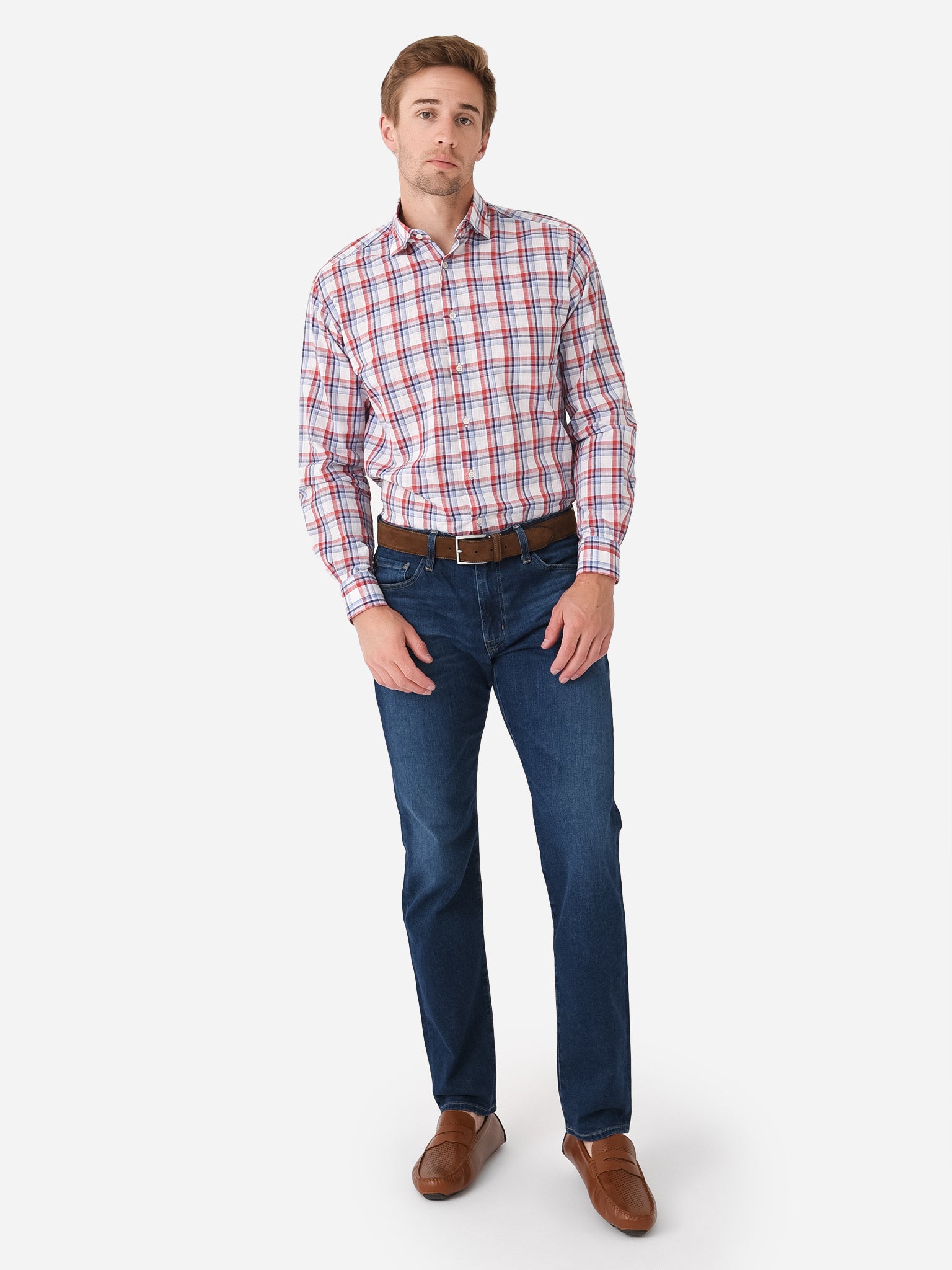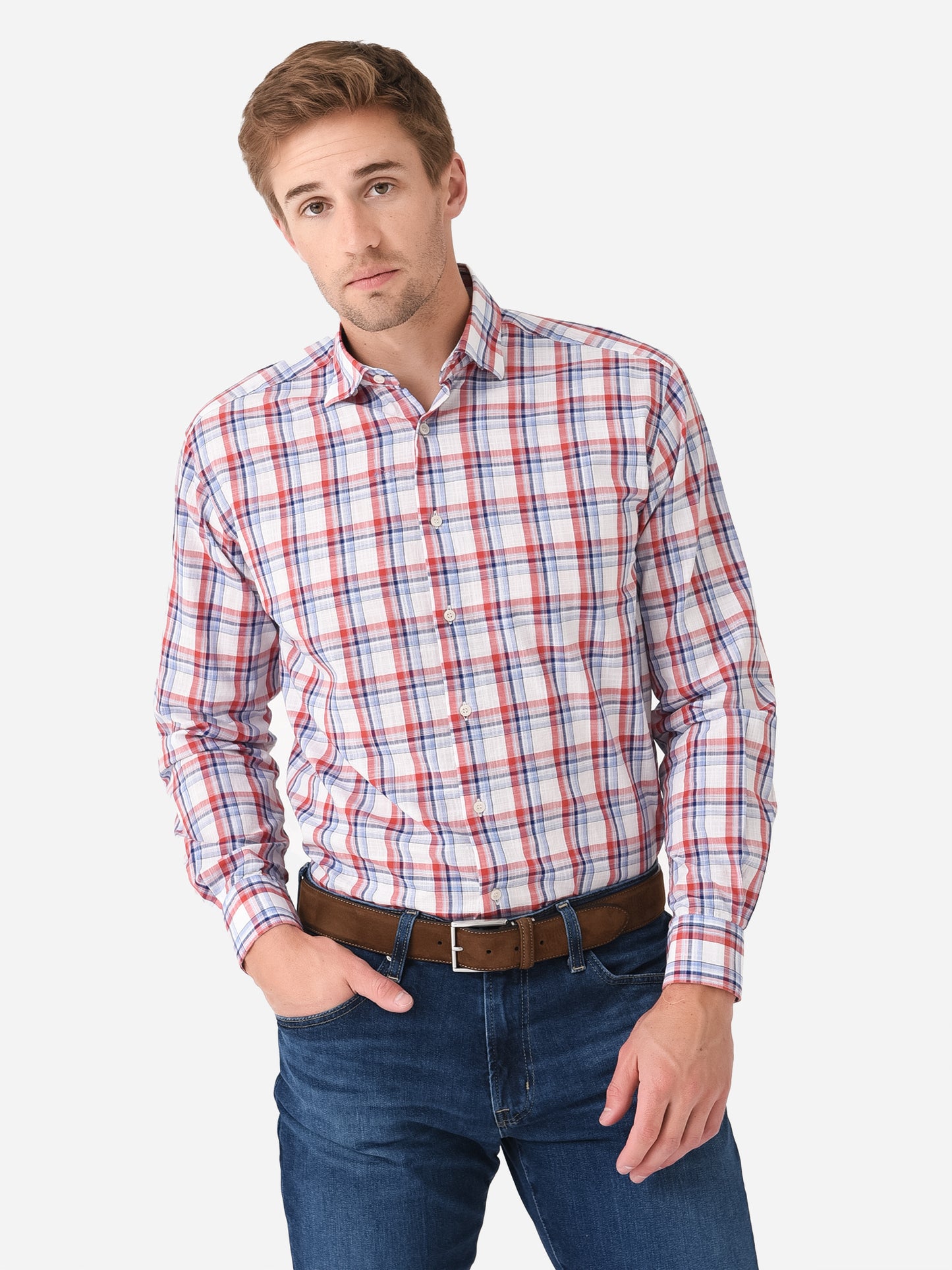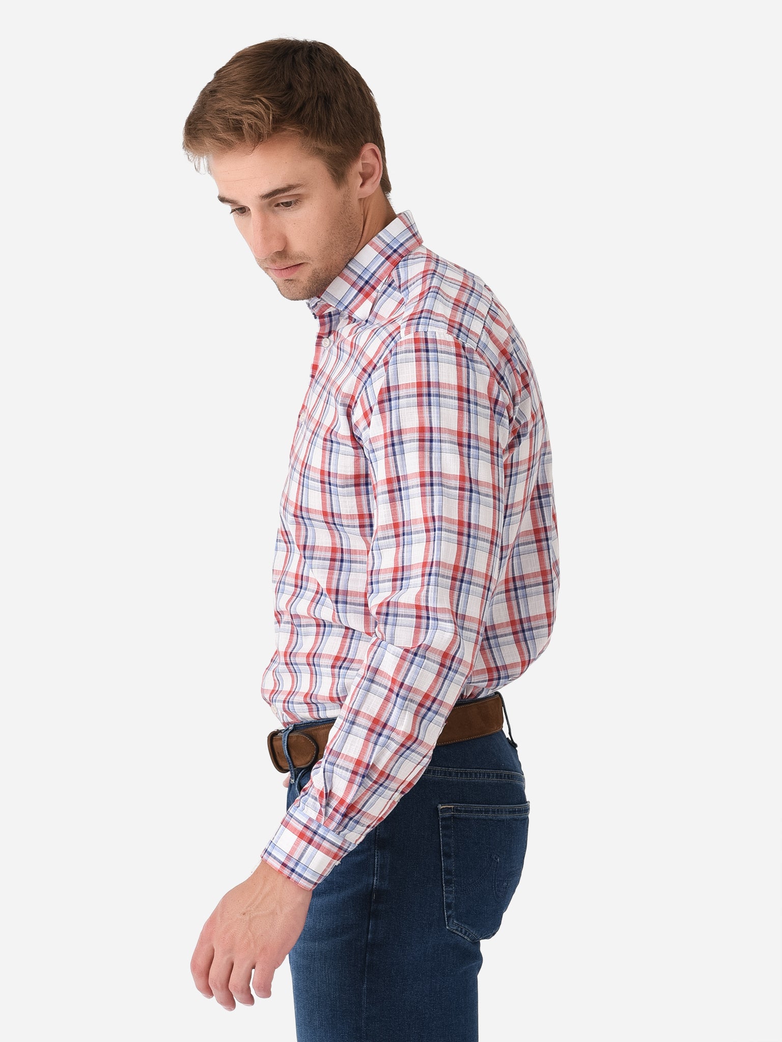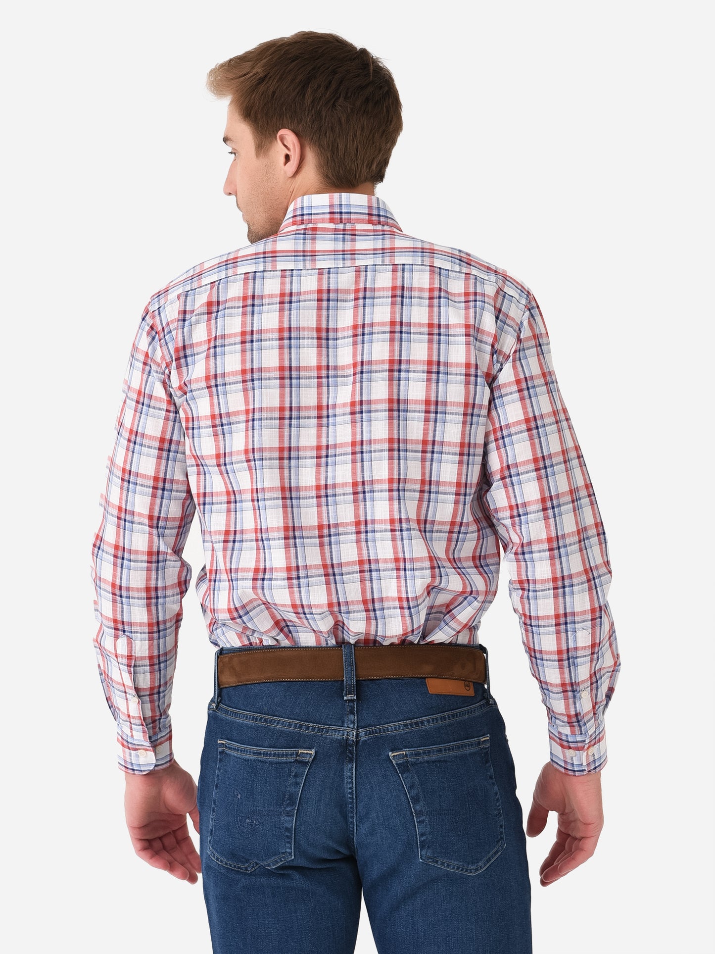 Woven cotton button-down shirt with a red, white, and blue plaid print.