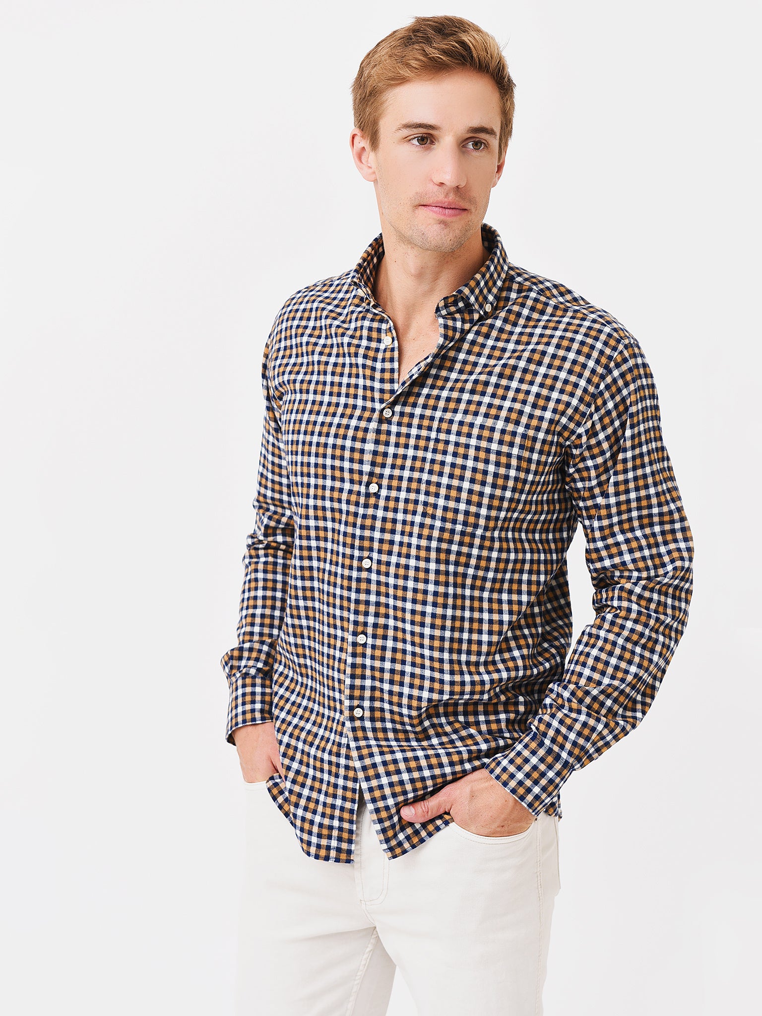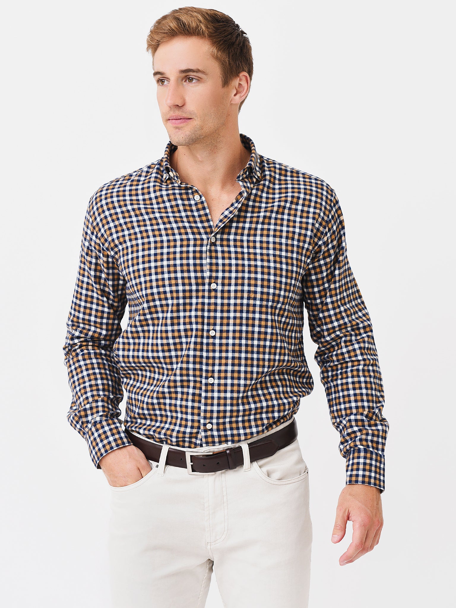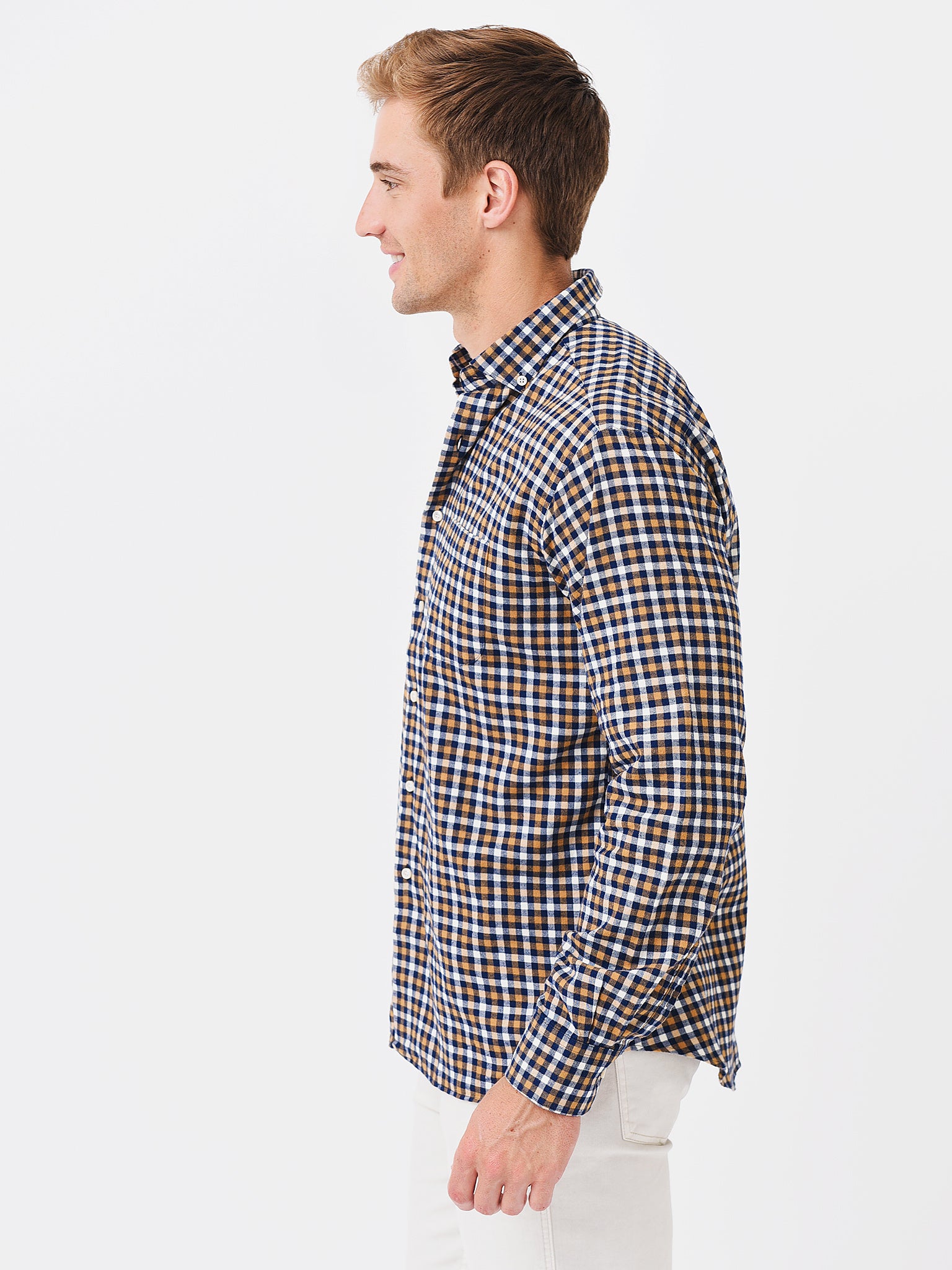 Soft cotton button-down shirt with a button-down collar.