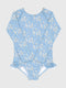 This rash guard style one-piece swimsuit is made with Liberty Fabrics and features a back grosgrain ribbon detail.