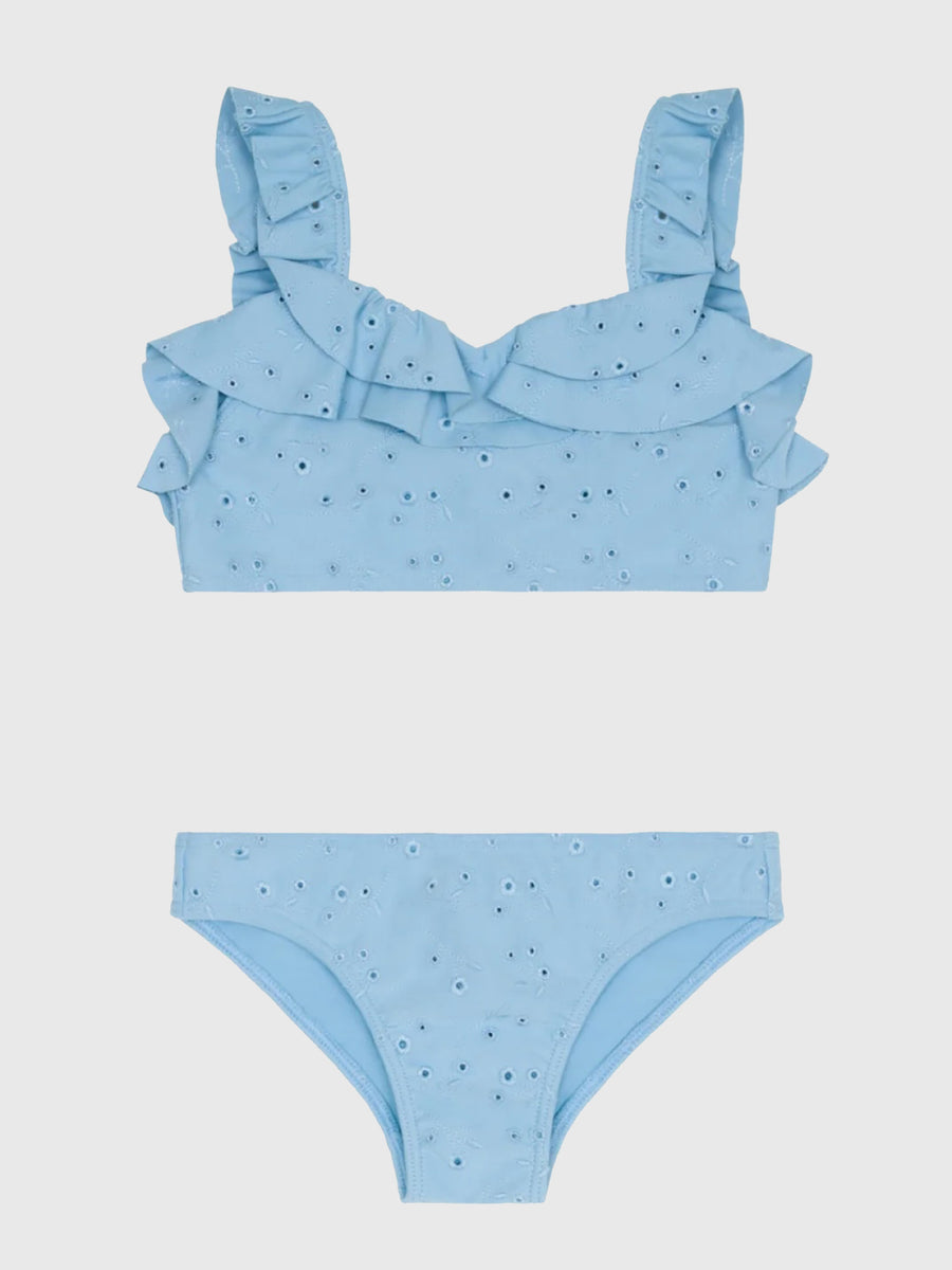 Sweet and functional, this two-piece swimsuit is designed for all-day play. The top features a V-neck paired with delicate ruffle detailing. Made for unrestricted movement, this set is ideal for non-stop water fun.