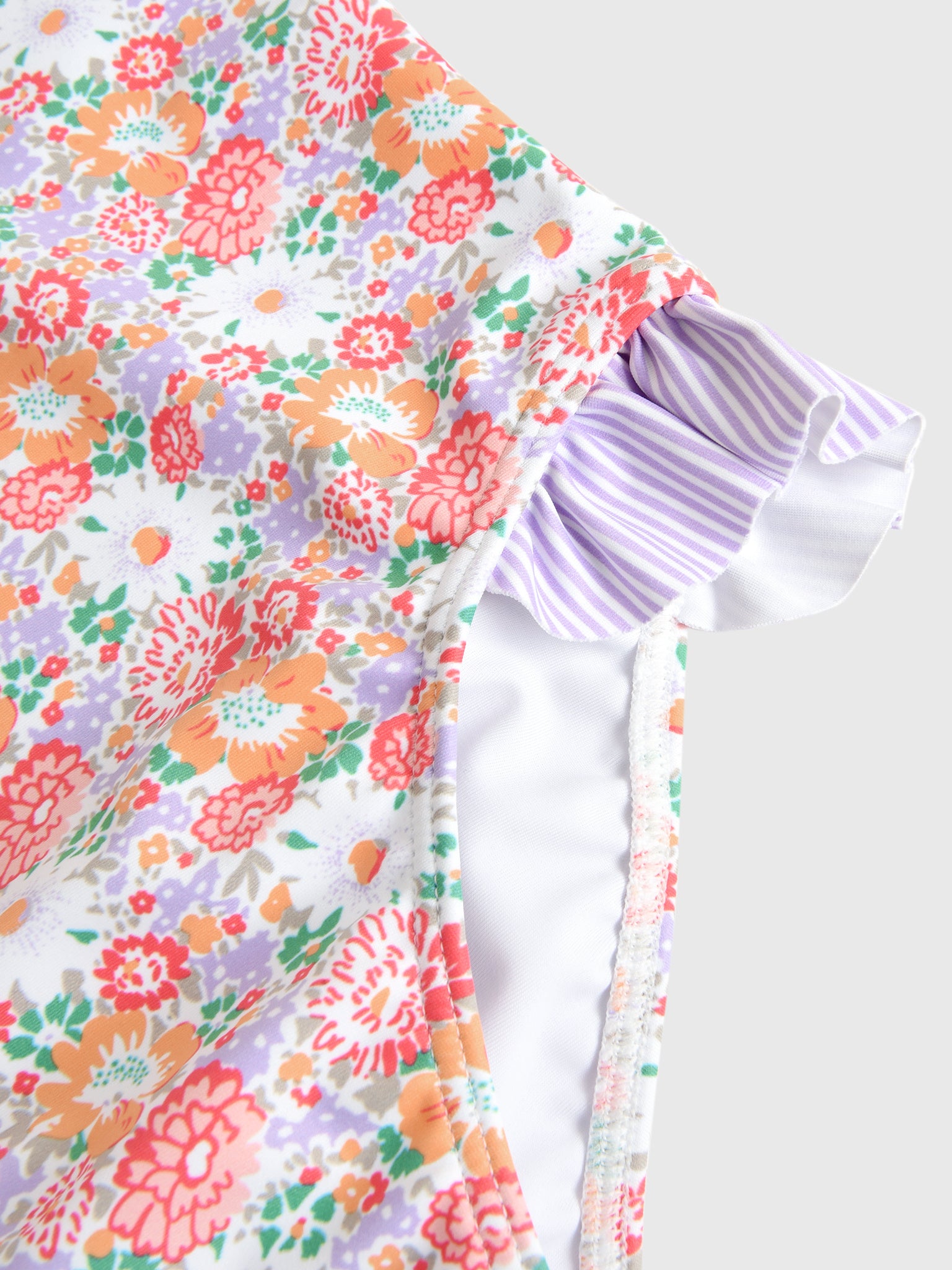 A signature rash guard one-piece swimsuit with a full-coverage design, a ditsy floral print, and contrast ruffle leg trims.