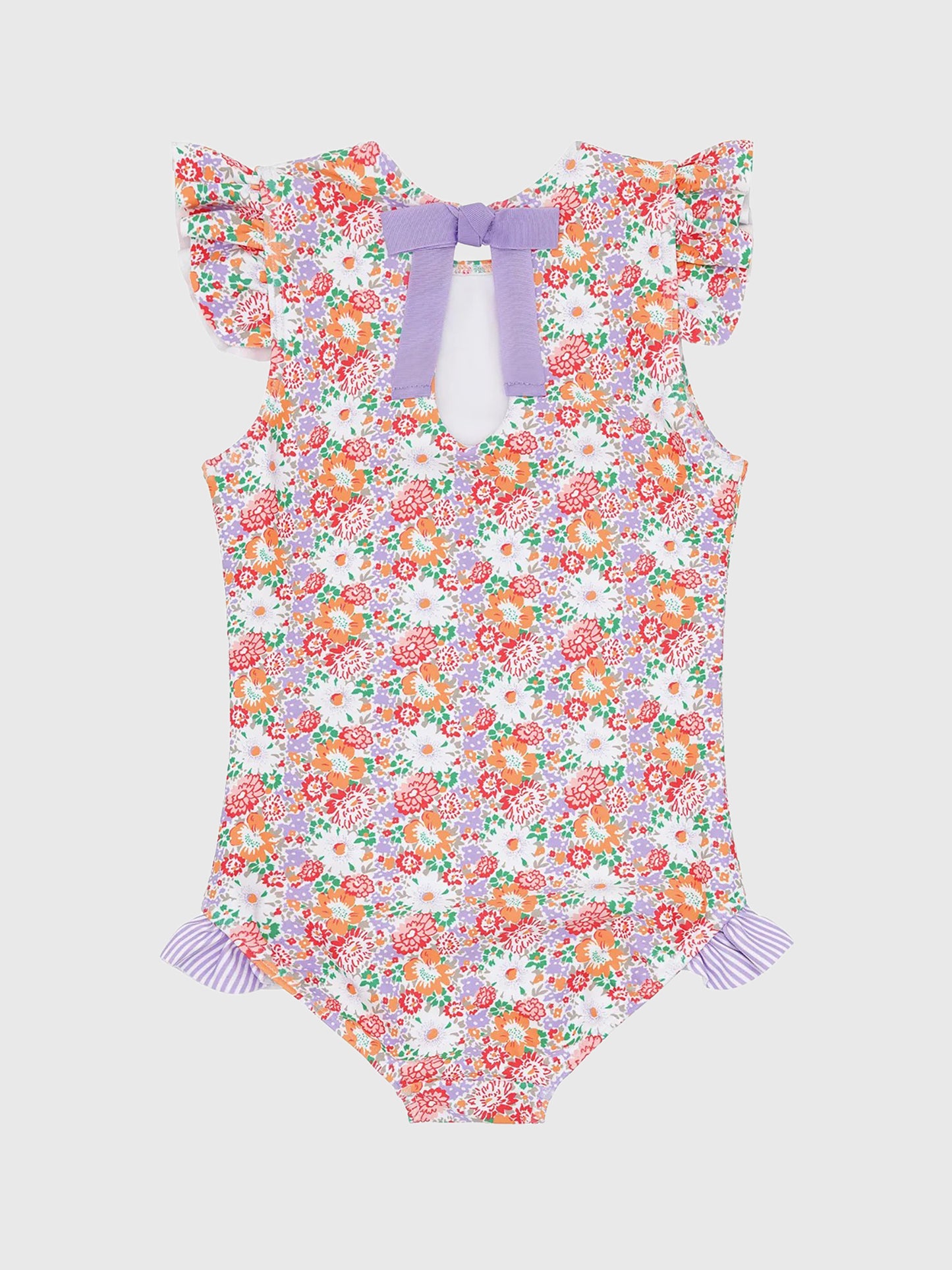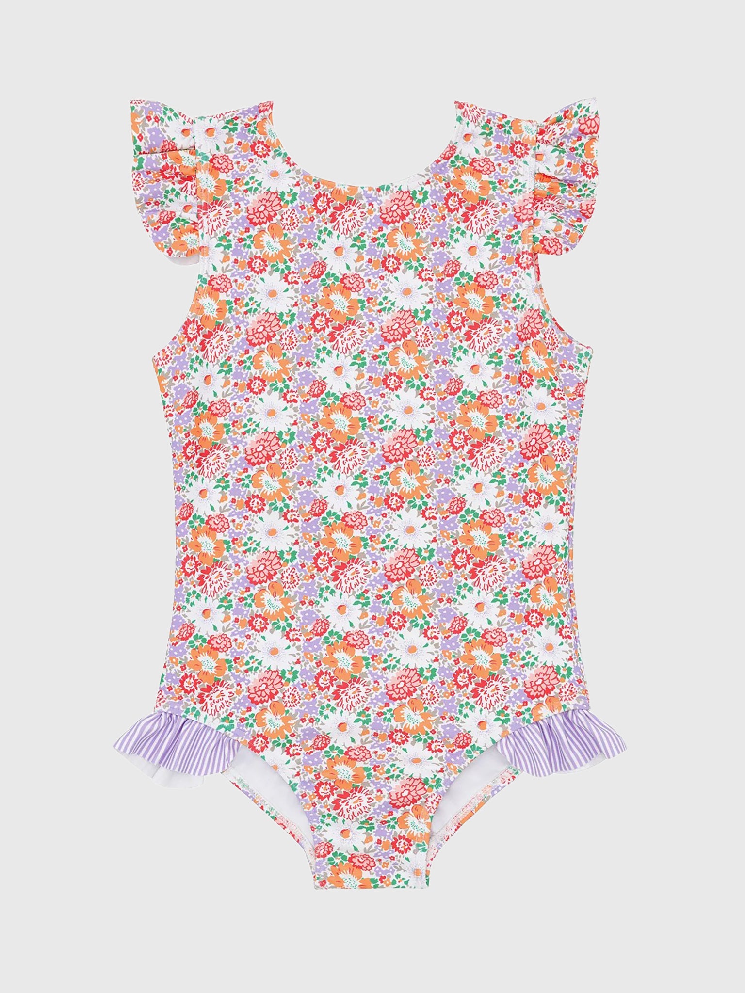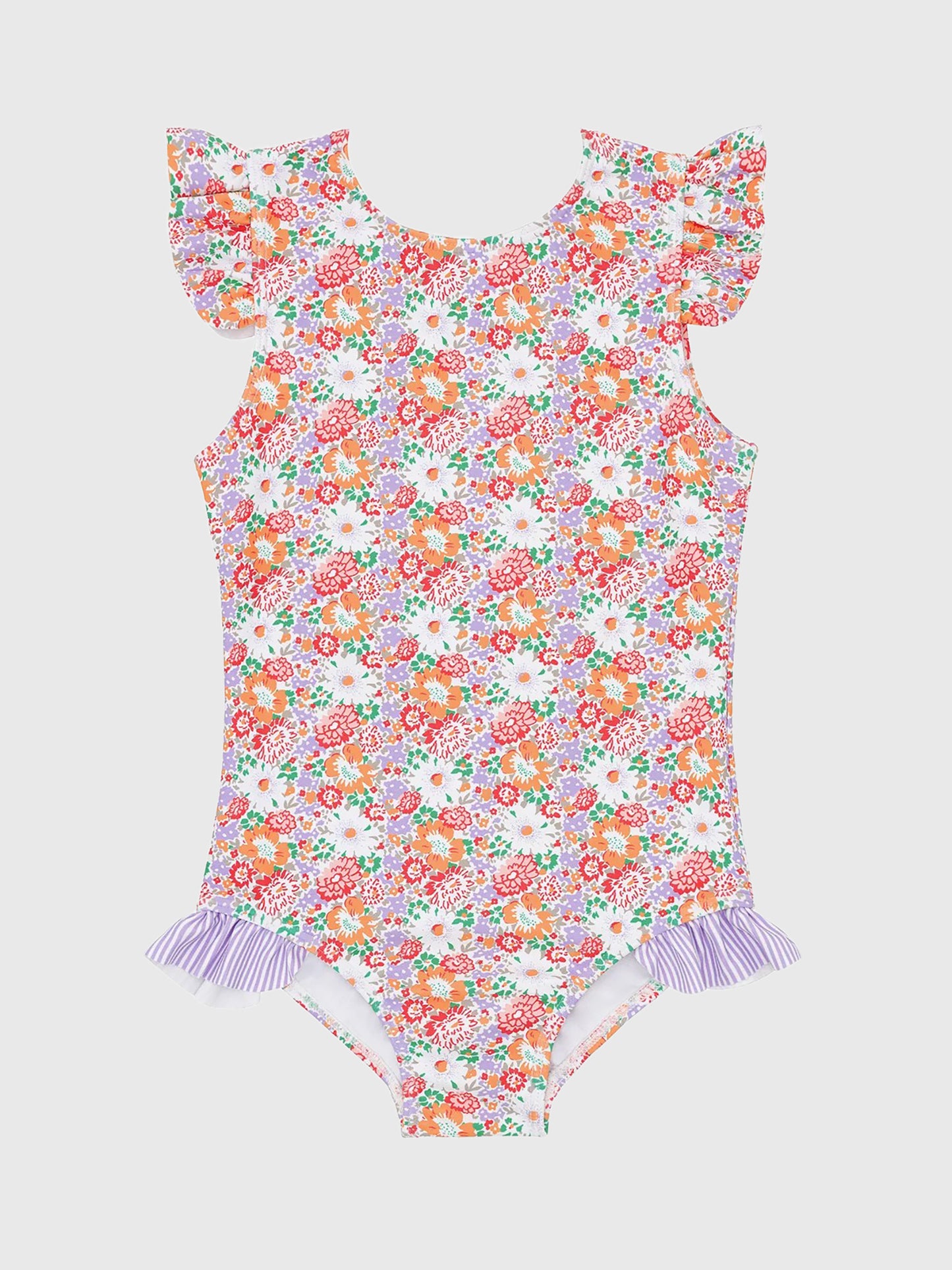 A charming rash guard one-piece swimsuit with sweet ruffle cap sleeves and a colorful floral print.