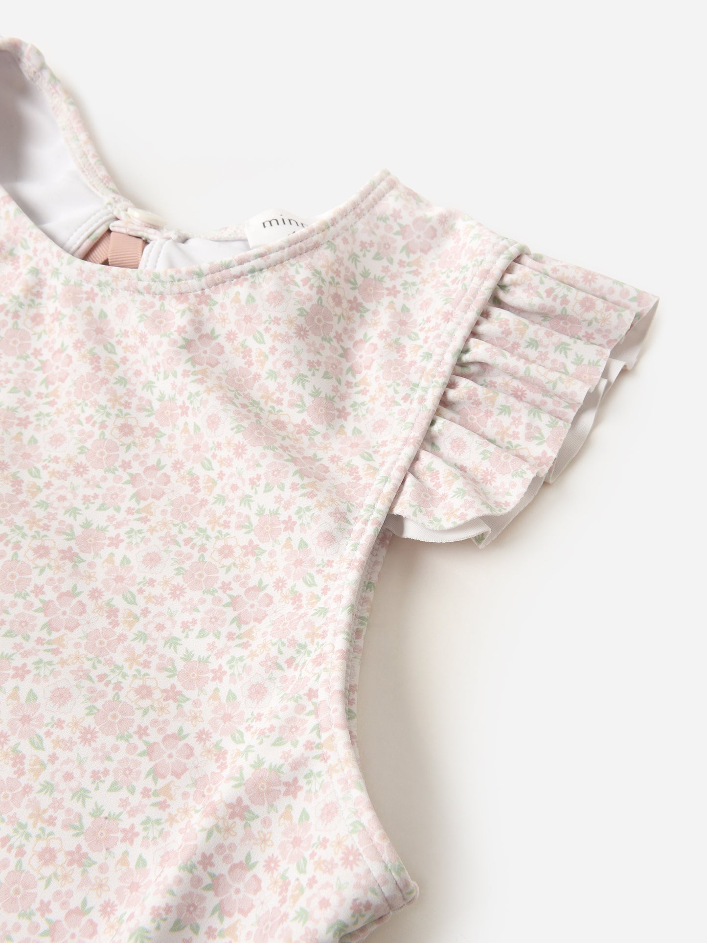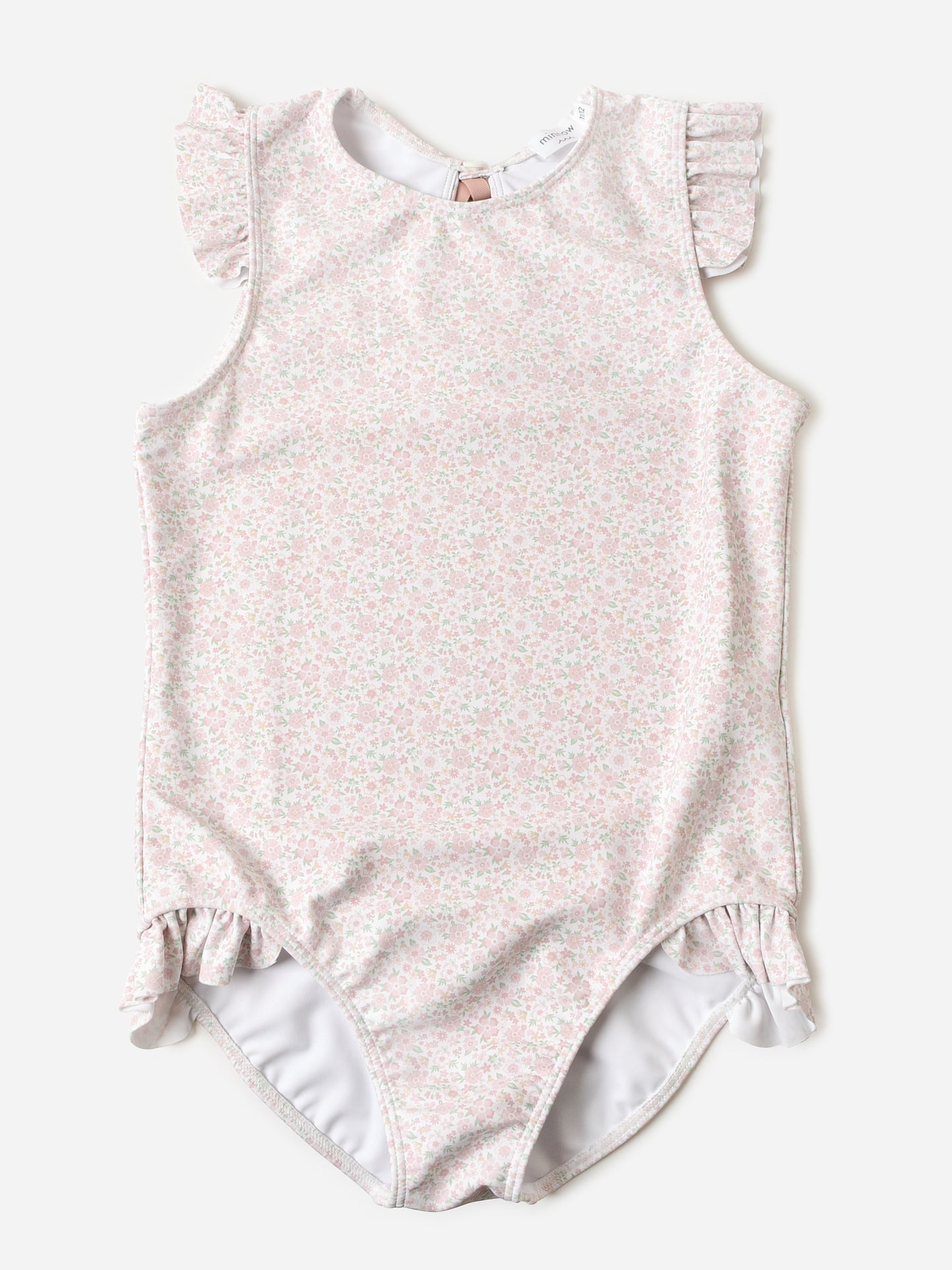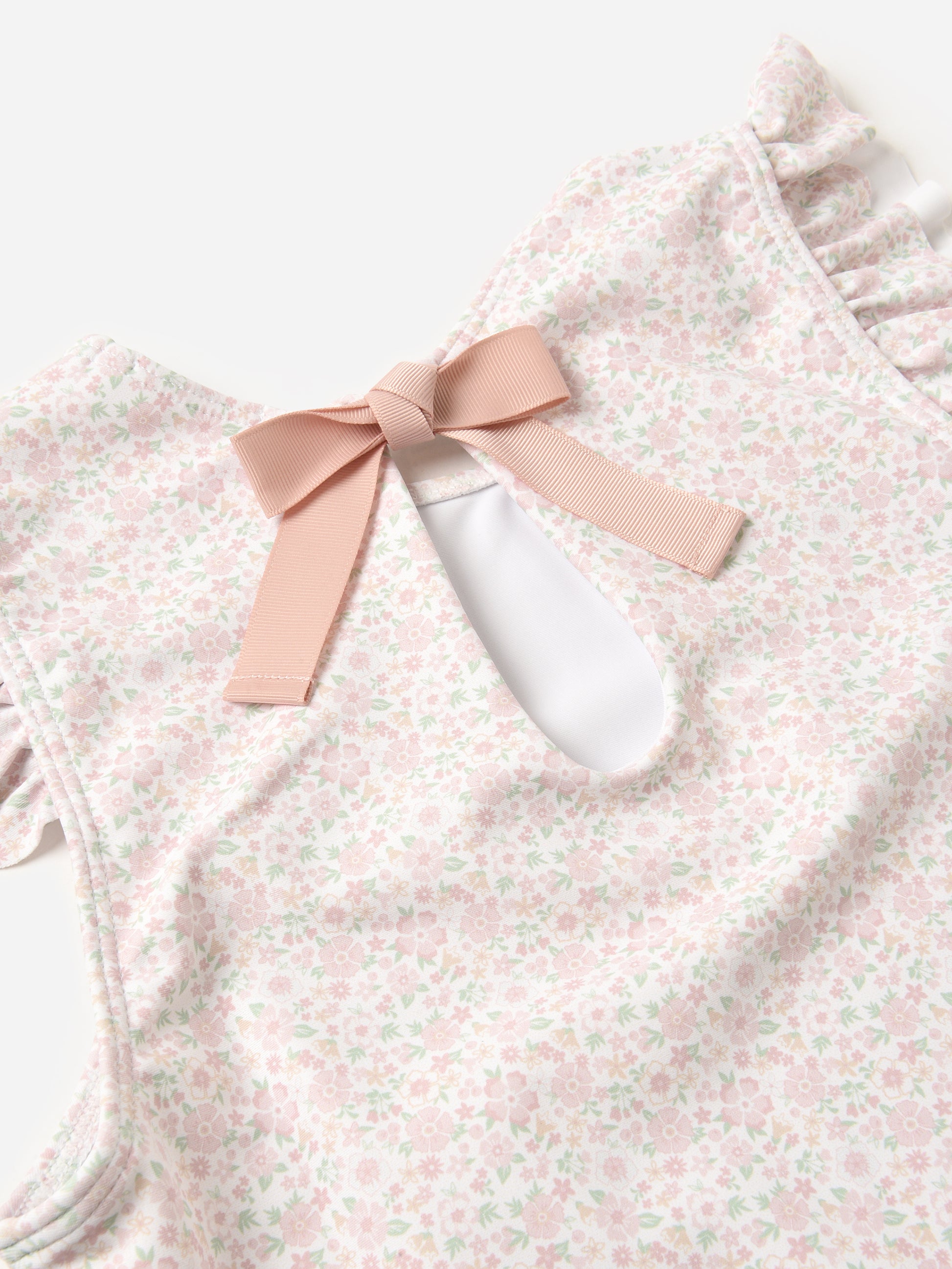 A ruffle-trimmed one-piece swimsuit with a dainty floral print and back grosgrain bow detail.