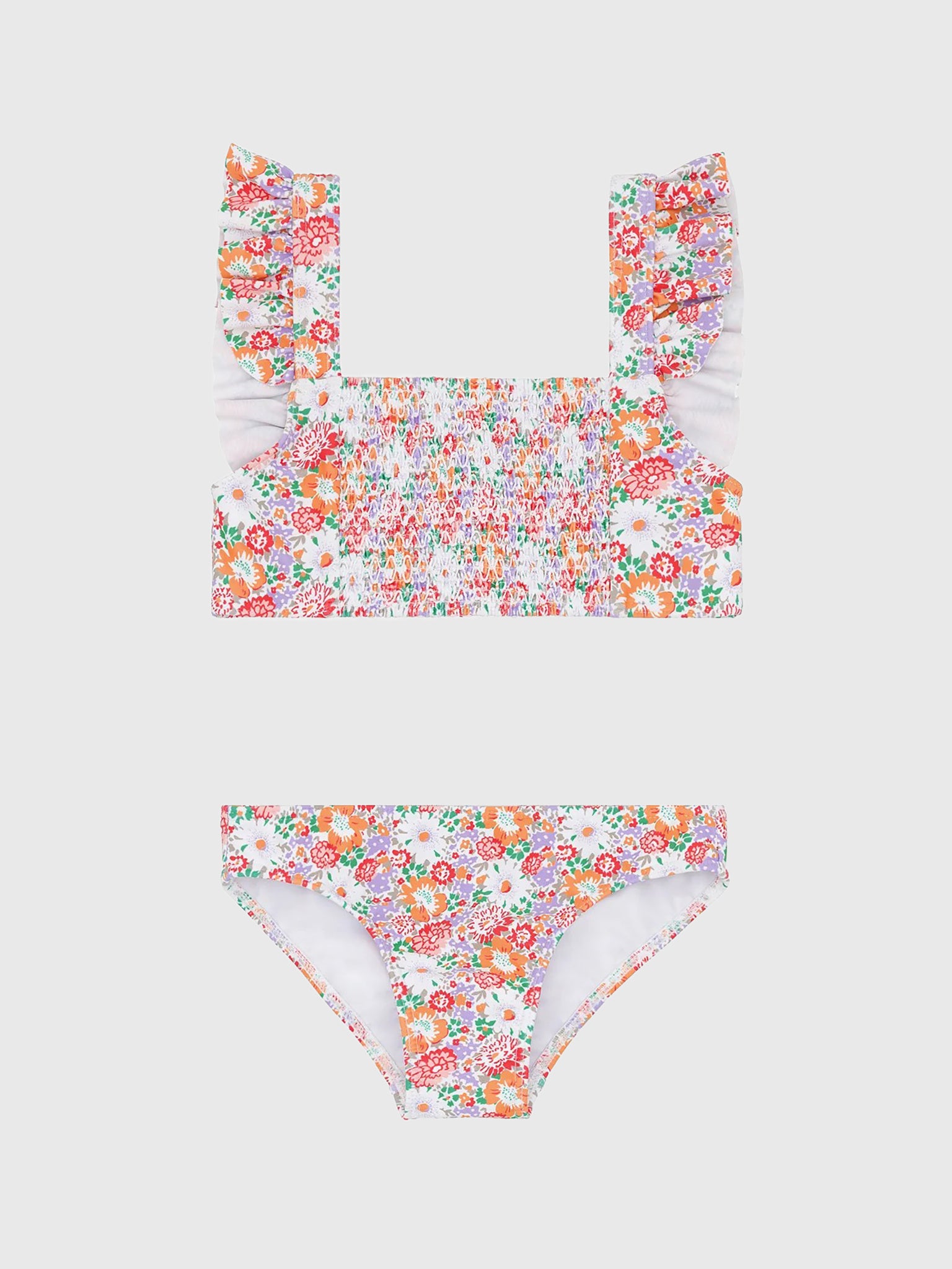 A charming bikini set with playful ruffle straps, delicate smocked detailing, and a vibrant floral print.