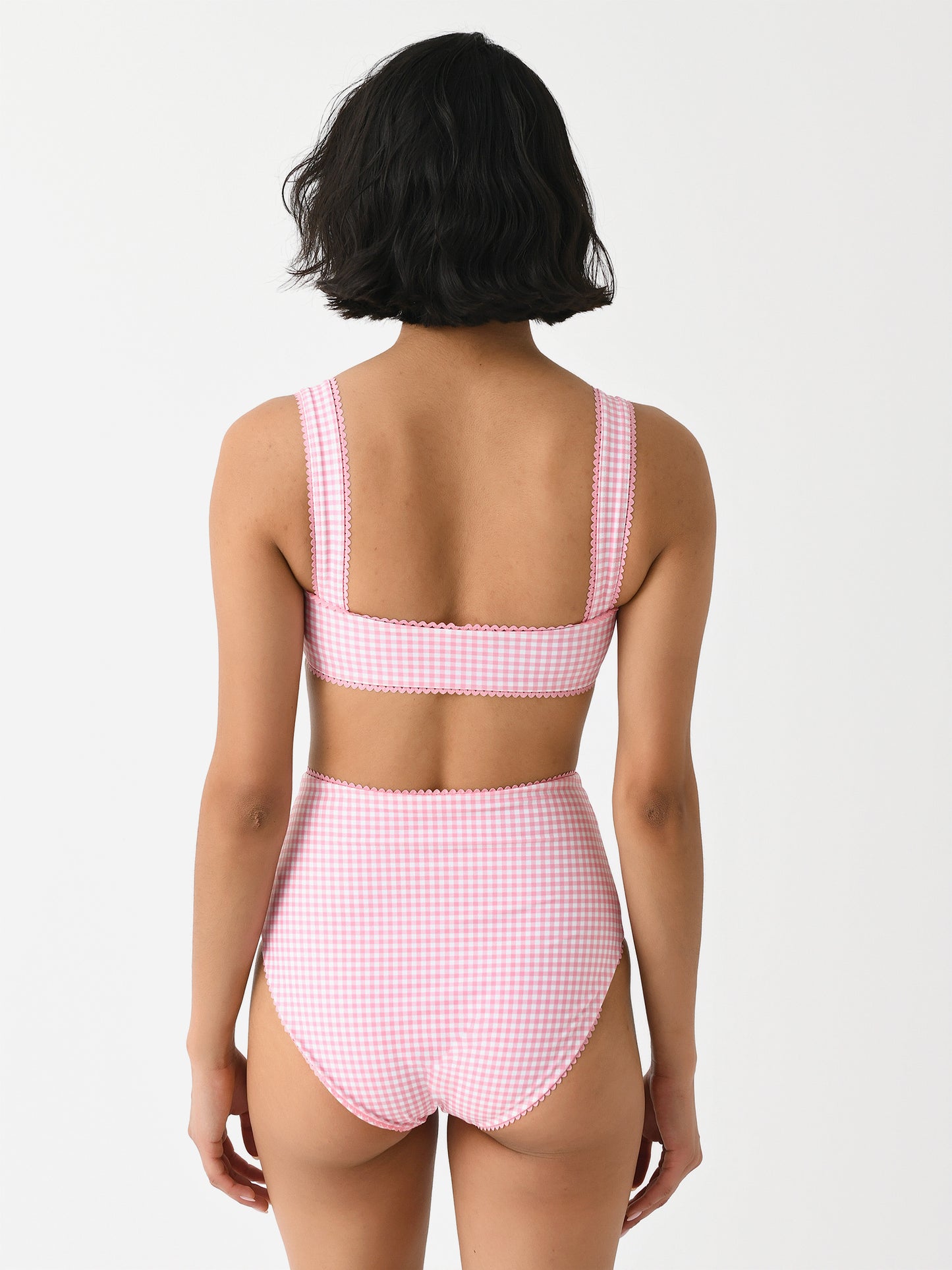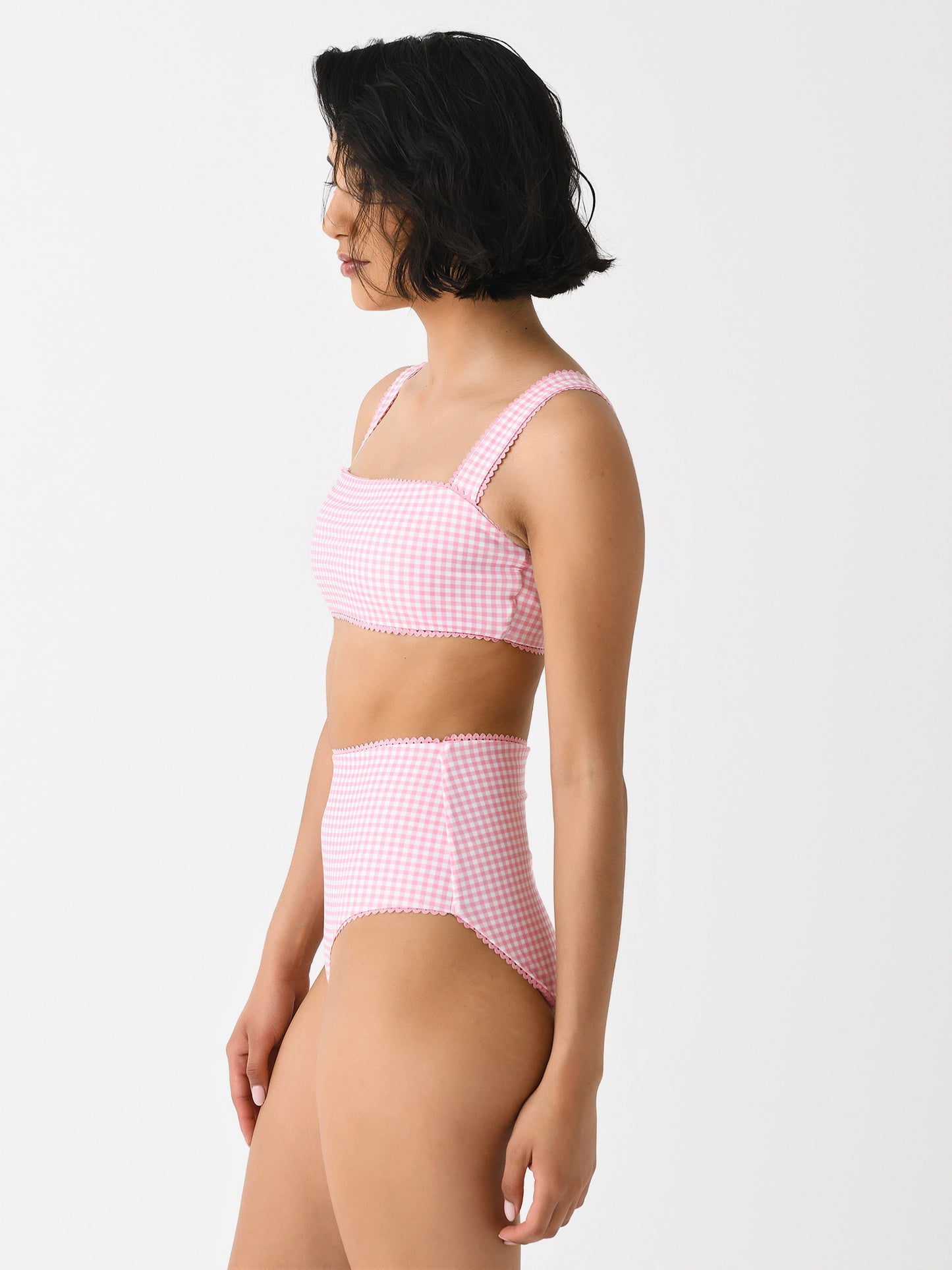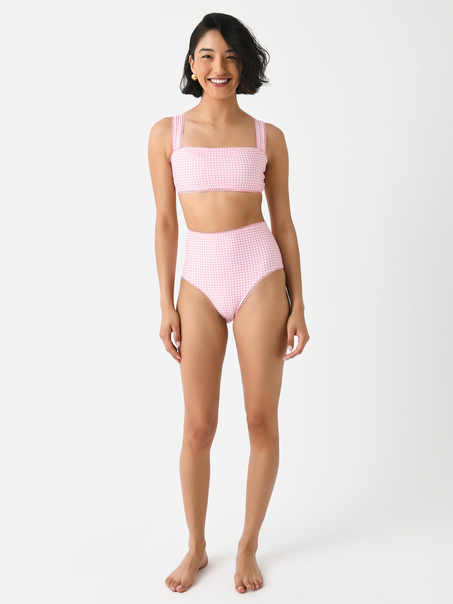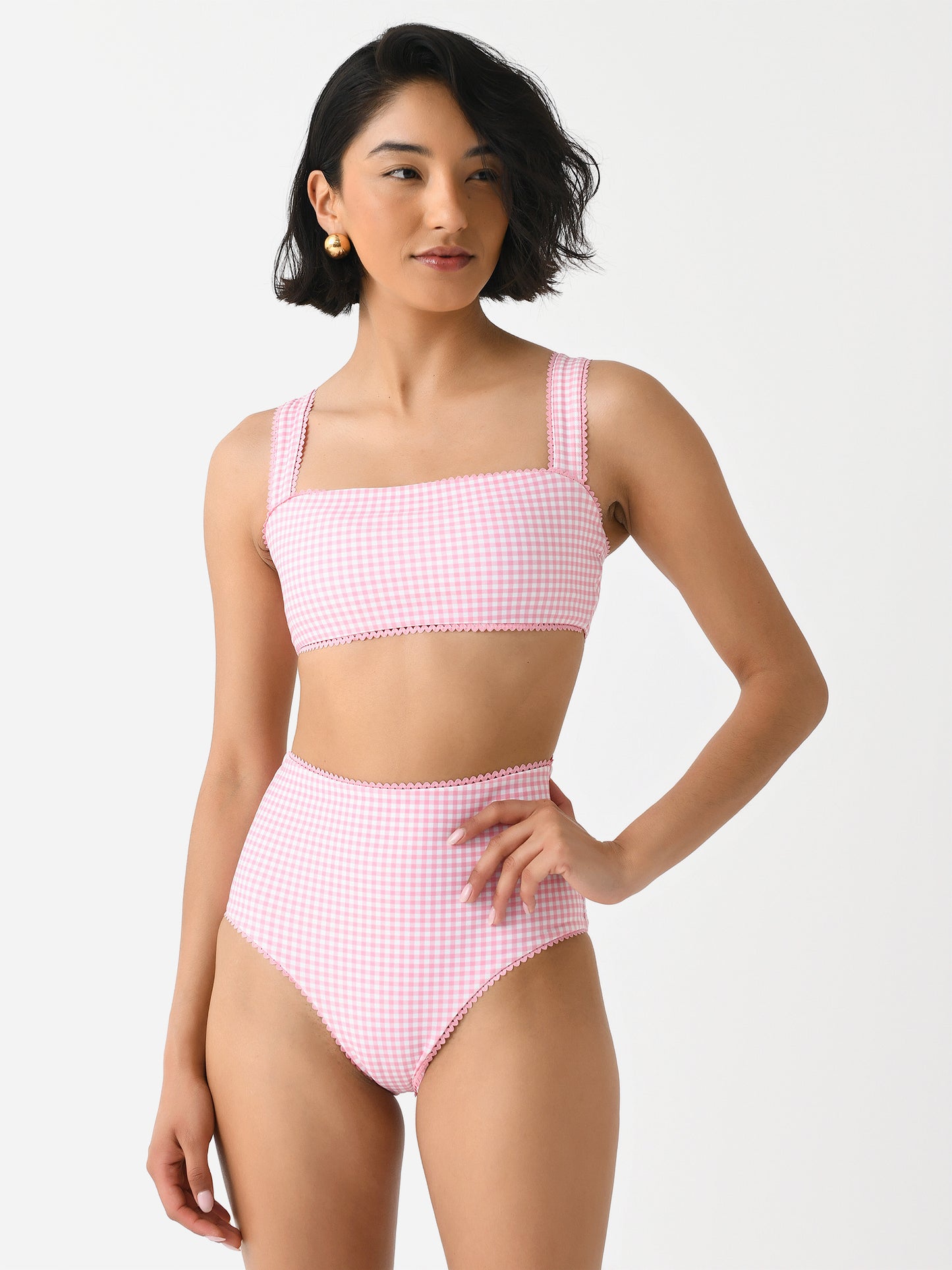 A lightly padded bandeau bikini top featuring a gingham print and dainty ric-rac trim.