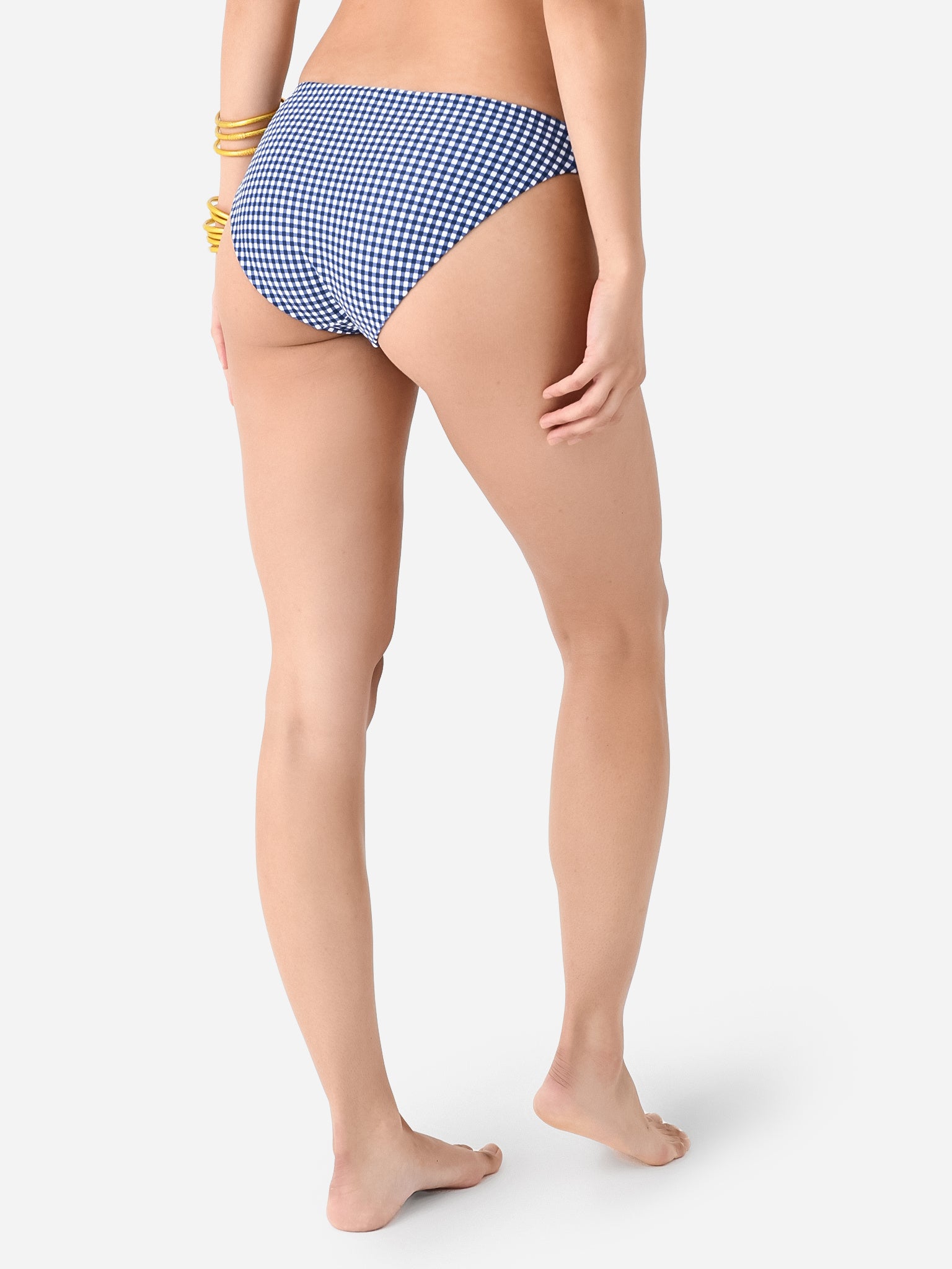 Navy gingham printed bikini bottom in a timeless silhouette.