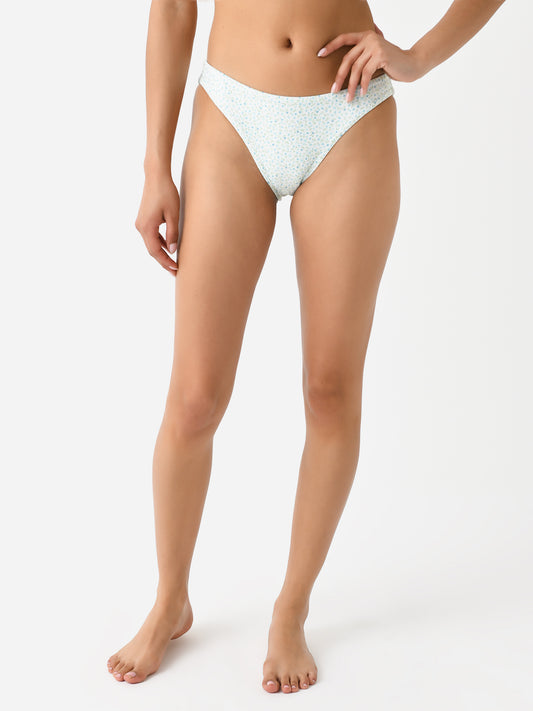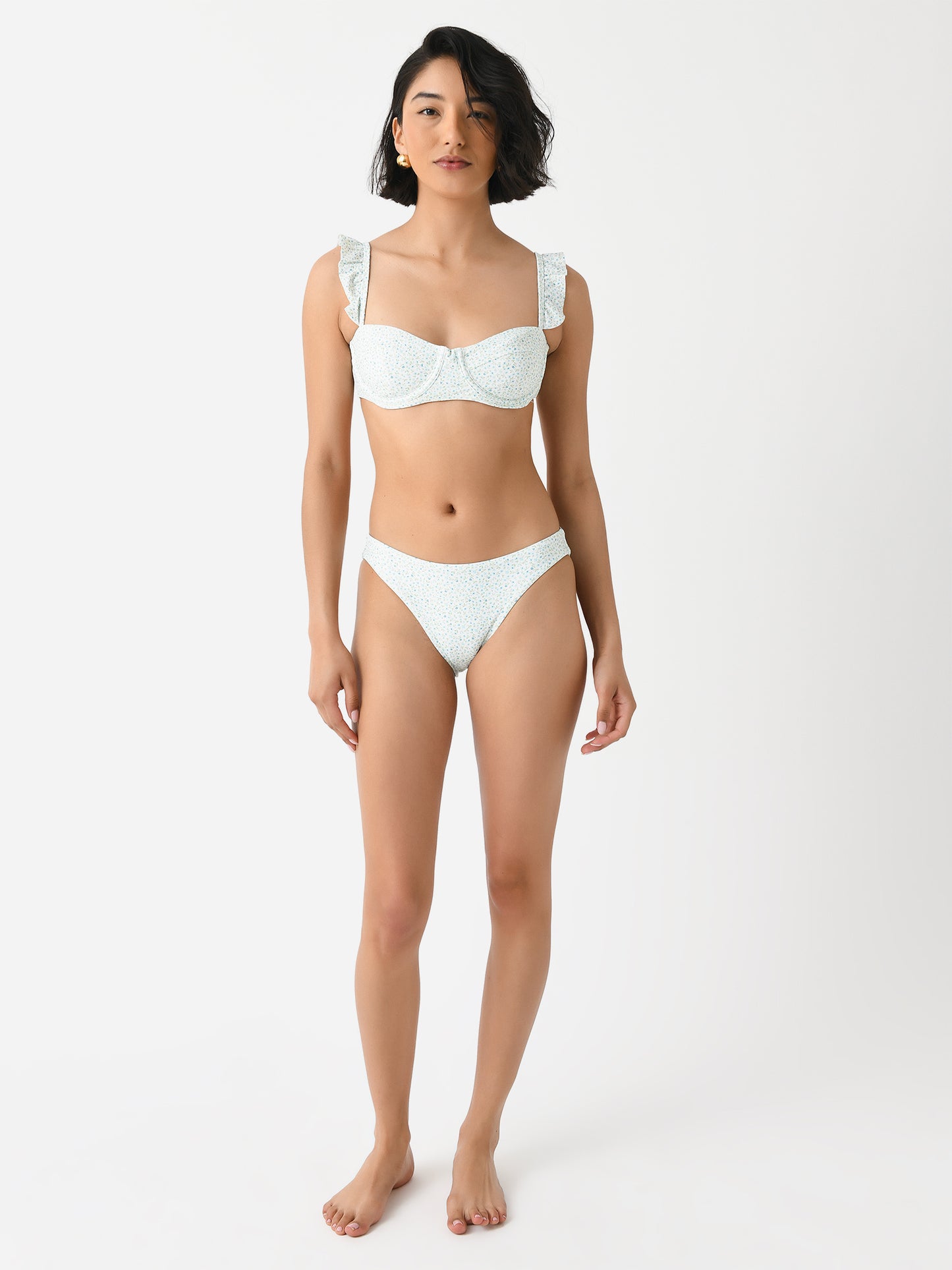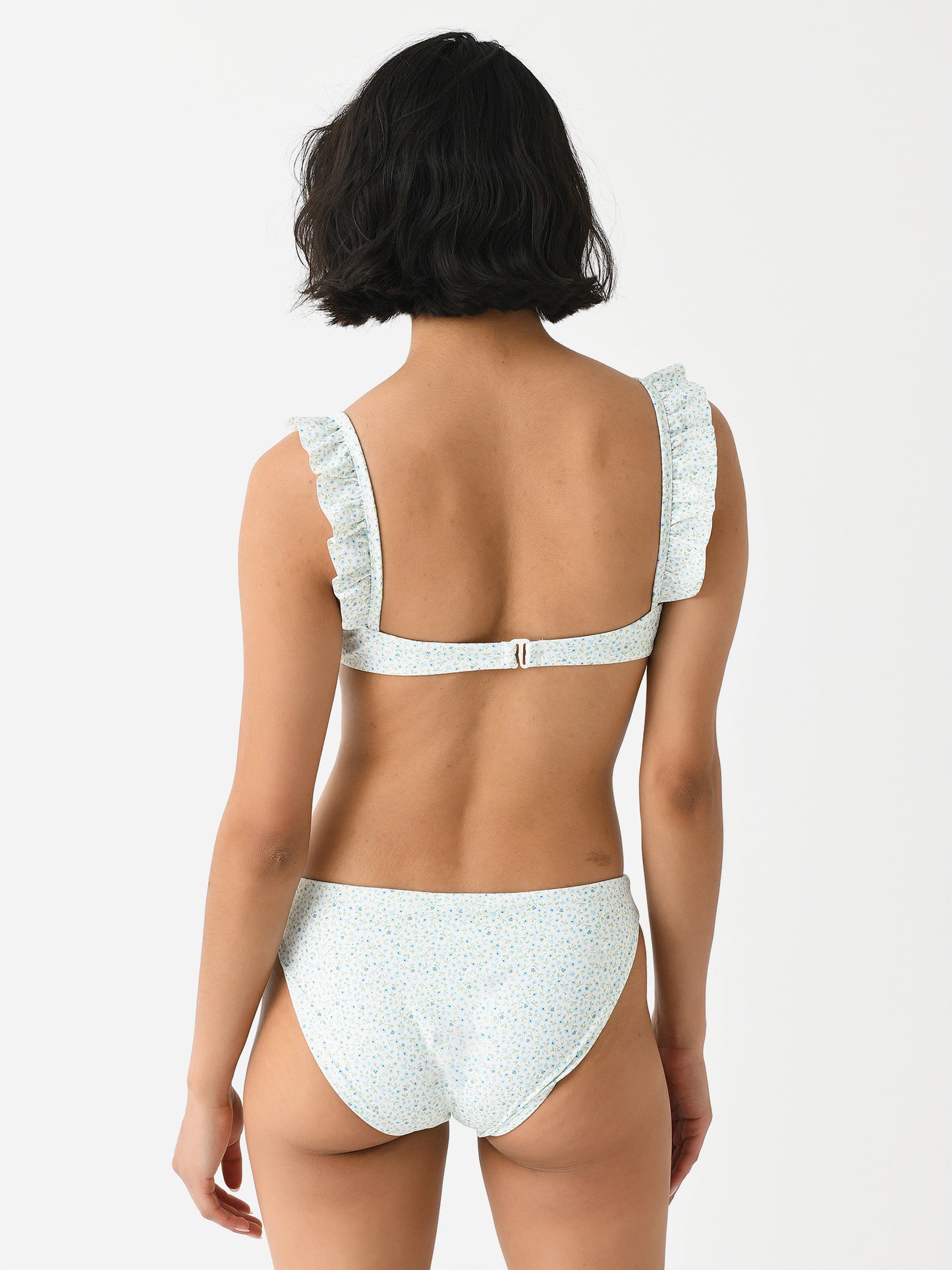 A ditsy floral bikini top with ruffle-trimmed straps and supportive molded cups.