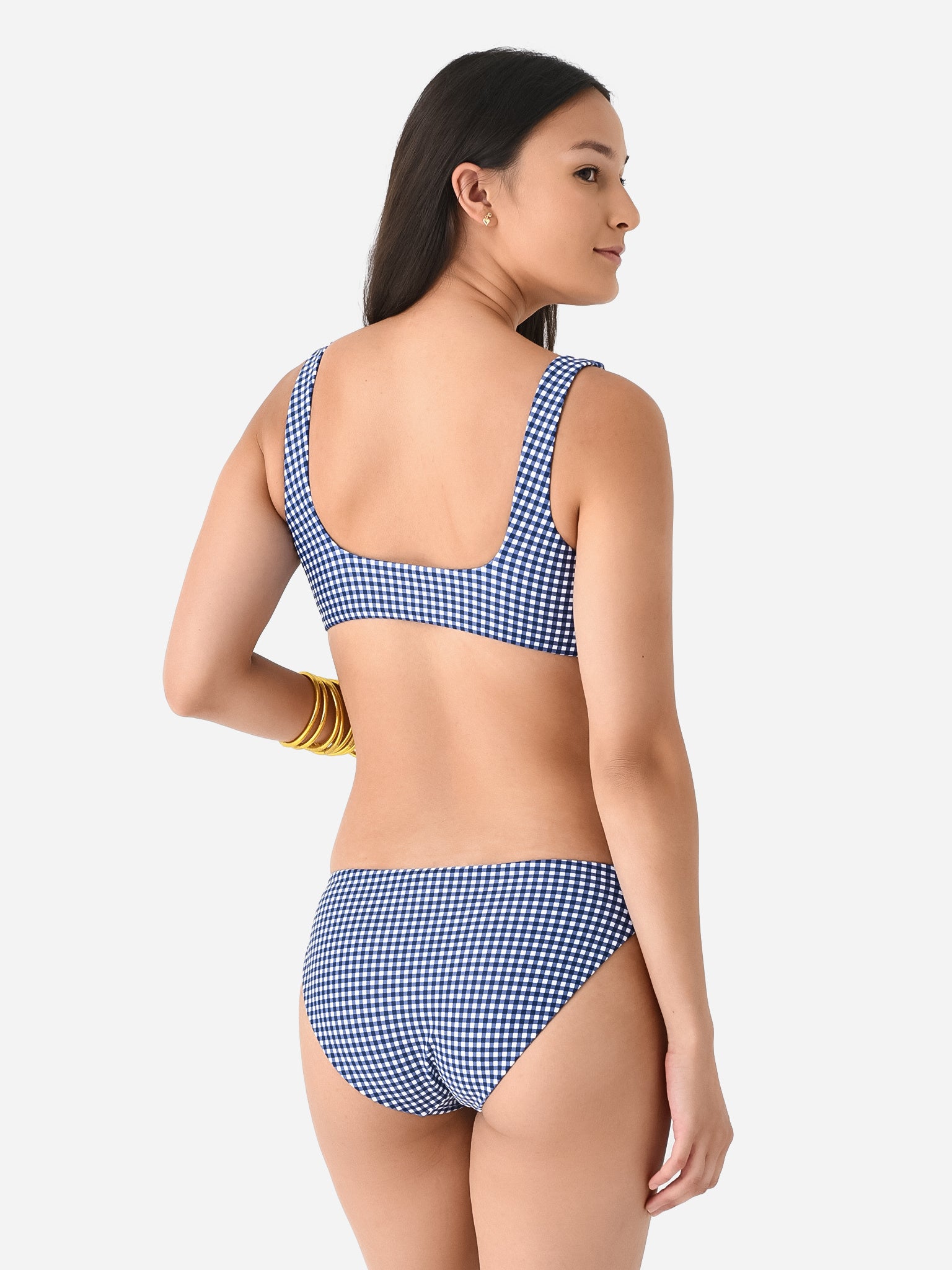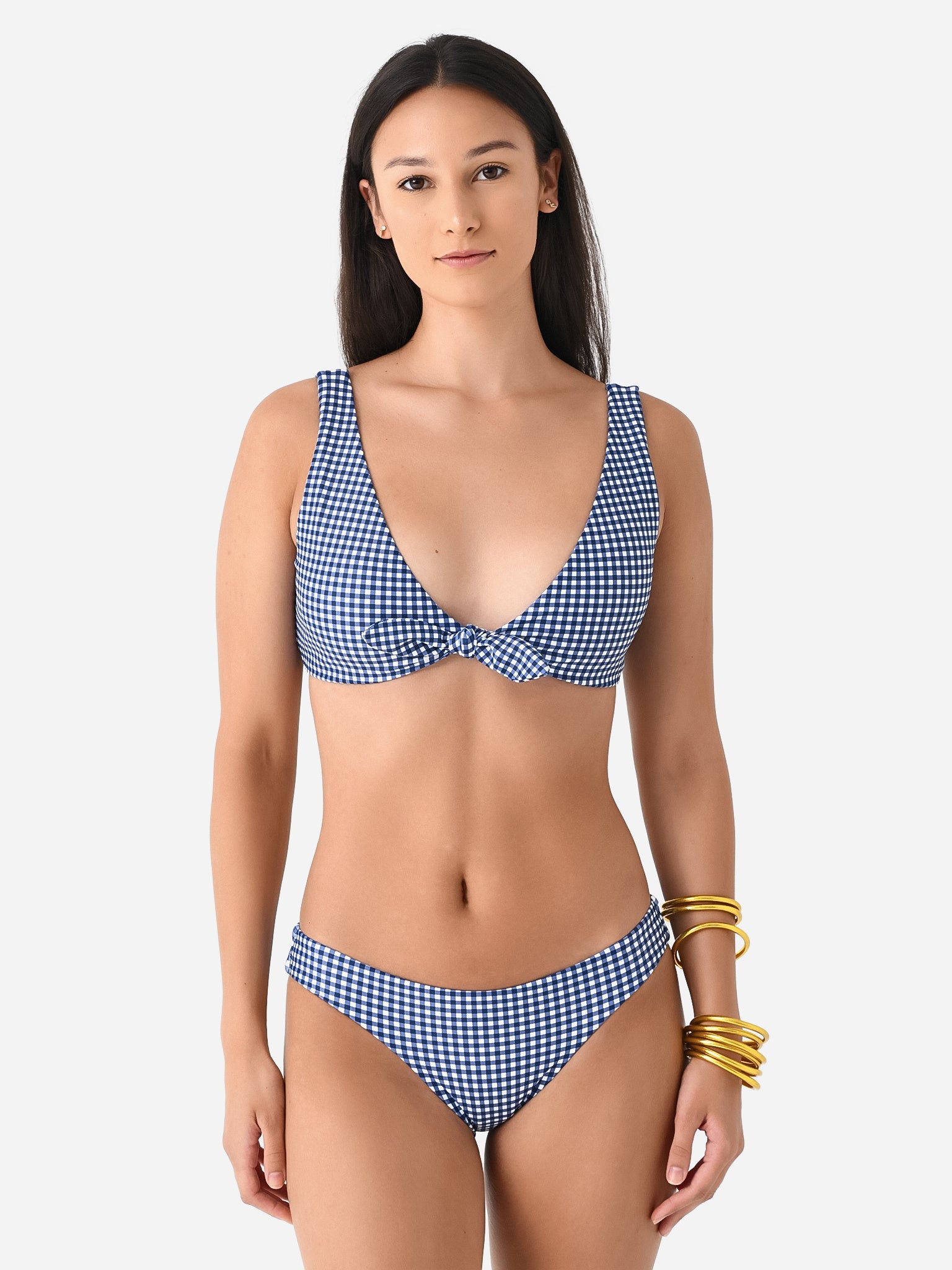 Gingham-printed bikini top with molded cups and an adjustable center knot.