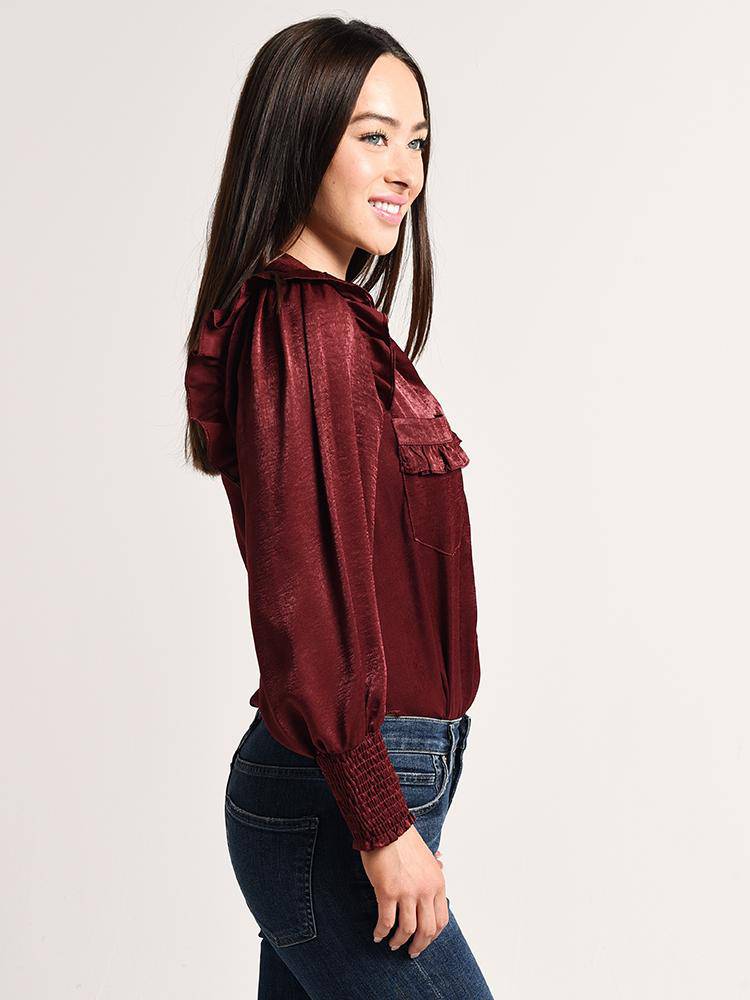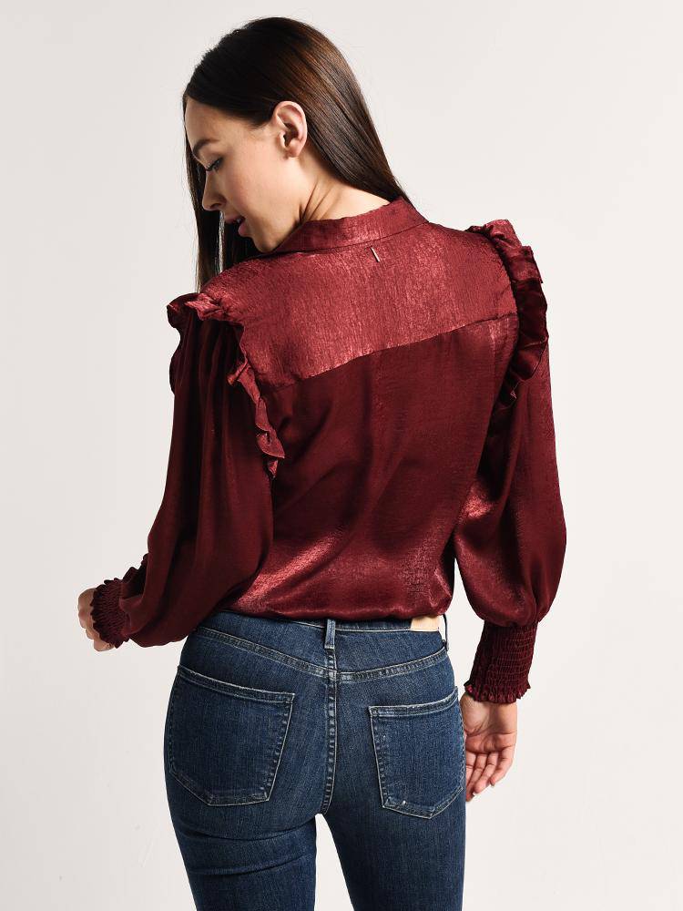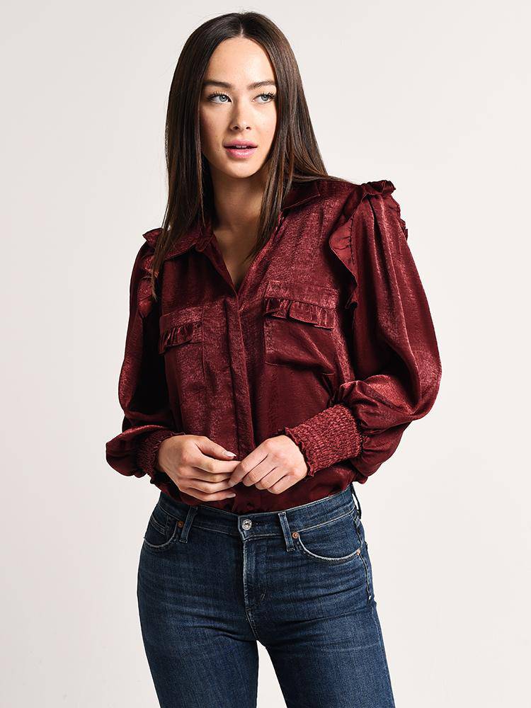 The Misa Donata Top button-up will have you party ready with it's ruffle detailing and glossy finish.