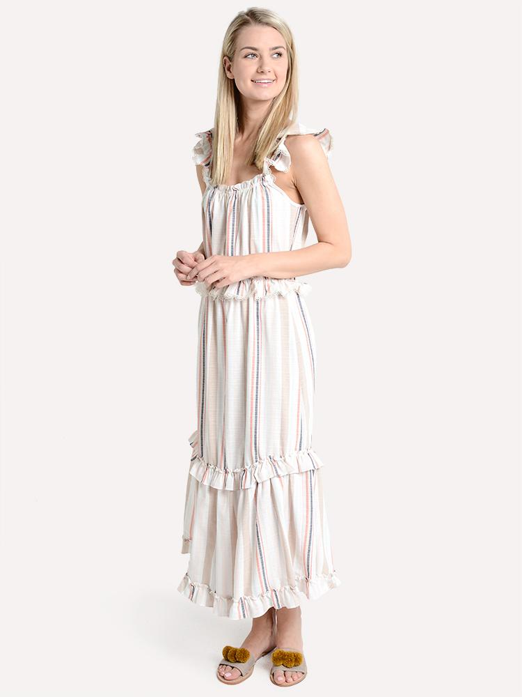 Light and breezy, meet the sophisticated day dress of the season that is ideal for outdoor plans. Cut from elegant striped chambray, this maxi dress is crafted with subtle, loose pin-tuck pleats that compliment the vertical stripes down the a-line skirt as flutter sleeves and ruffles give this Idonia dress a little extra feminine flair. Can be worn on or off-the-shoulder.