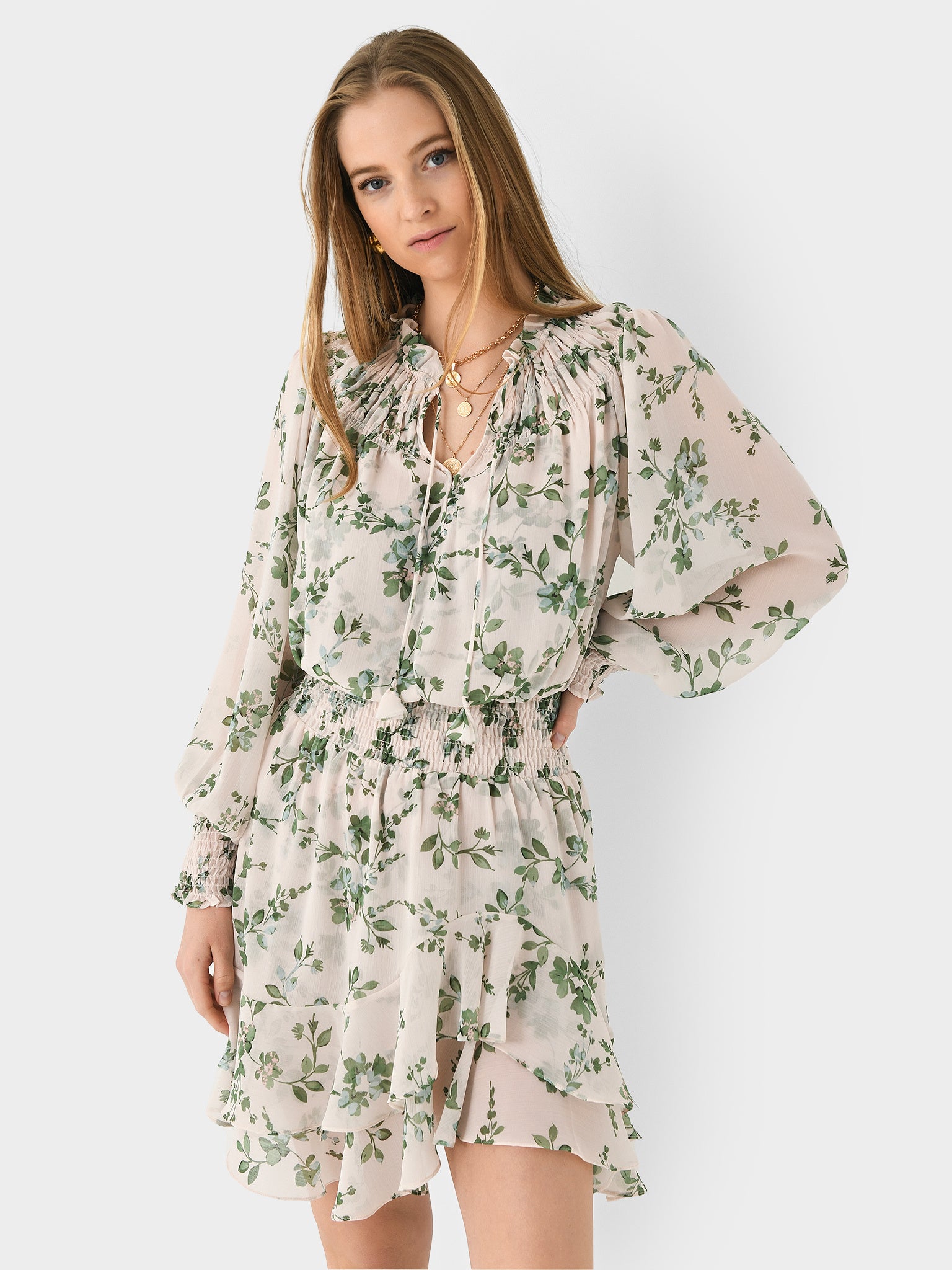 A lovely mini dress cut from botanical-printed polyester chiffon with smocked elements and an asymmetrical ruffle hem.