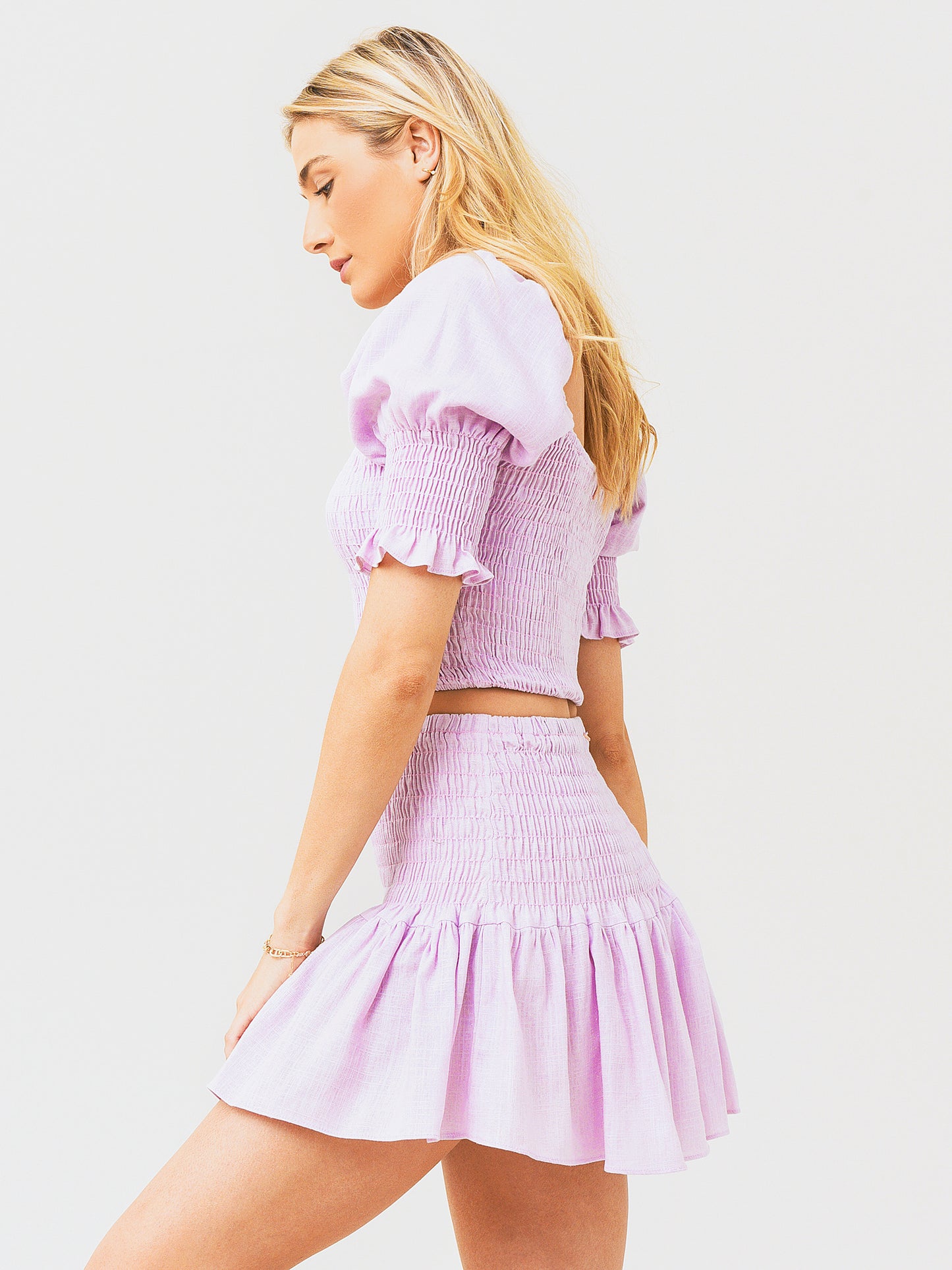 Cropped top with a smocked bodice and short puff sleeves.