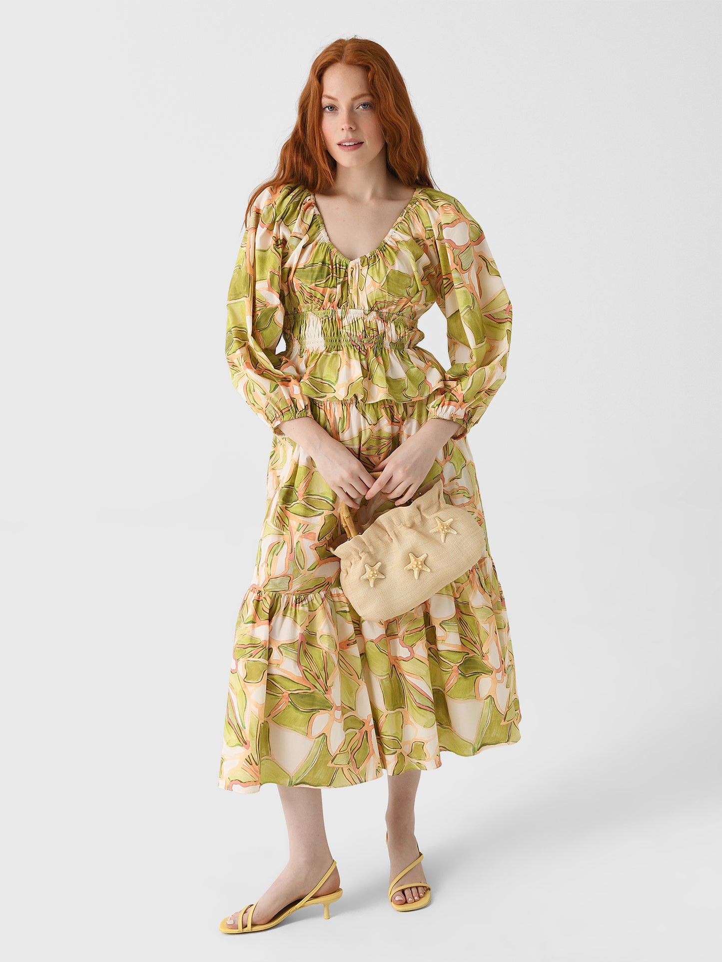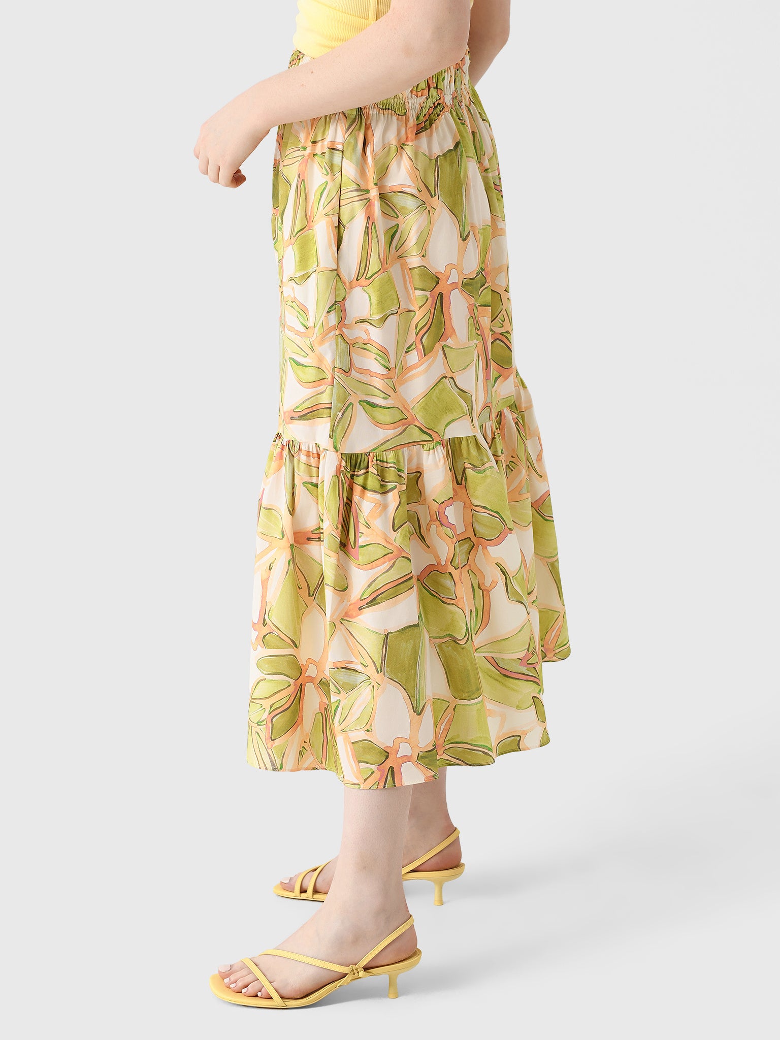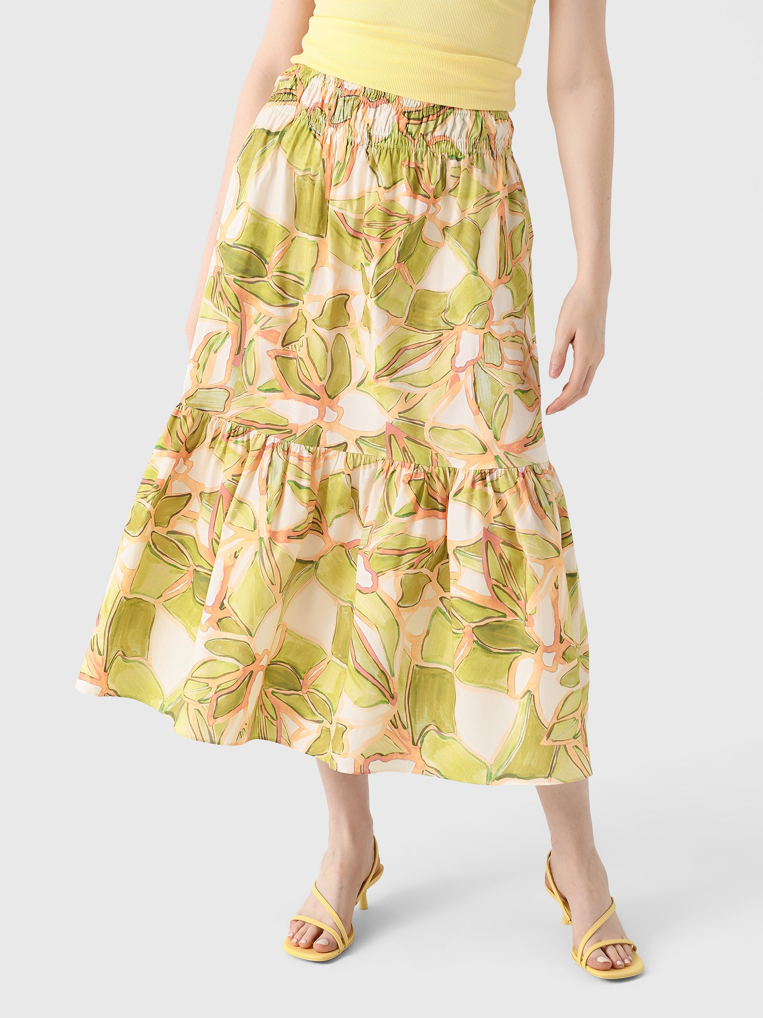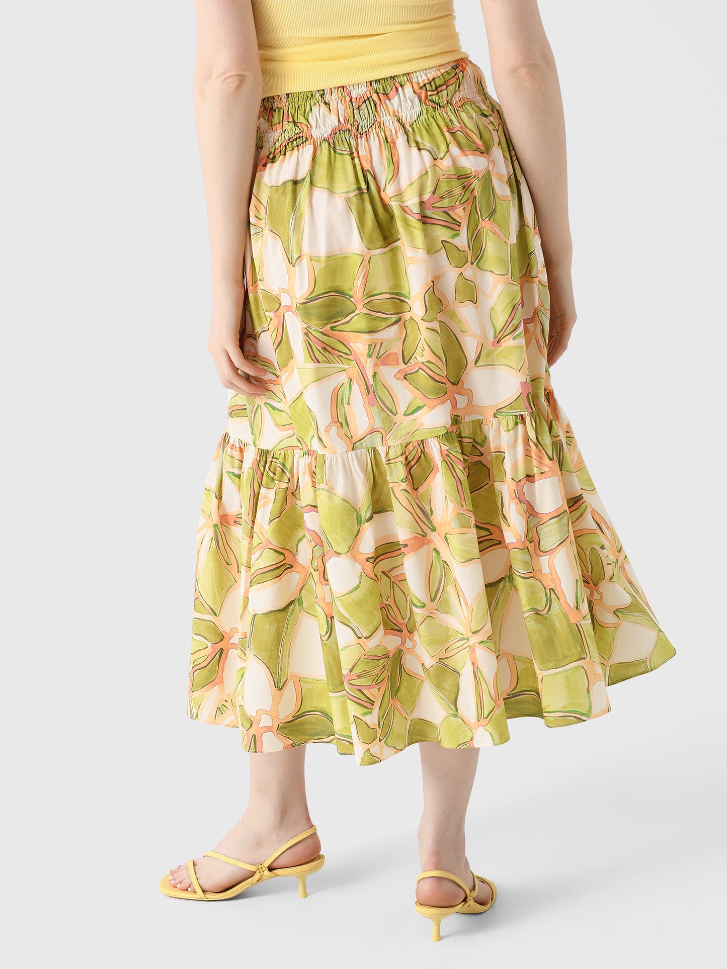A timeless maxi skirt made from lightweight cotton with a ruched waist, side pockets, and a tiered design.