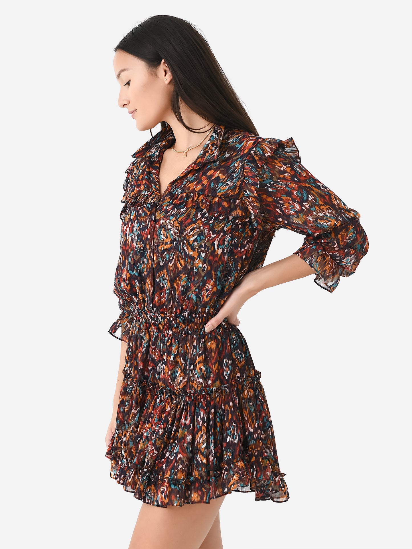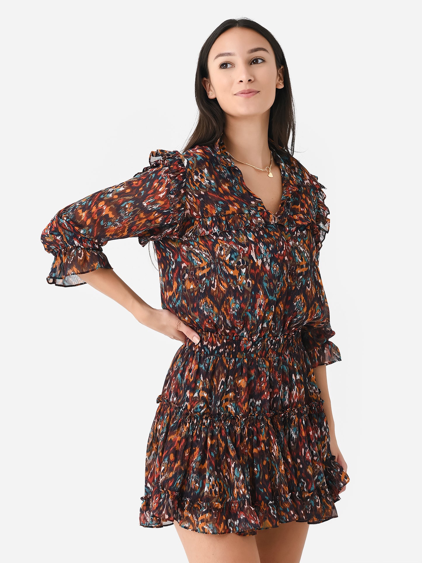 A printed chiffon dress with ruffle details and a mini silhouette.