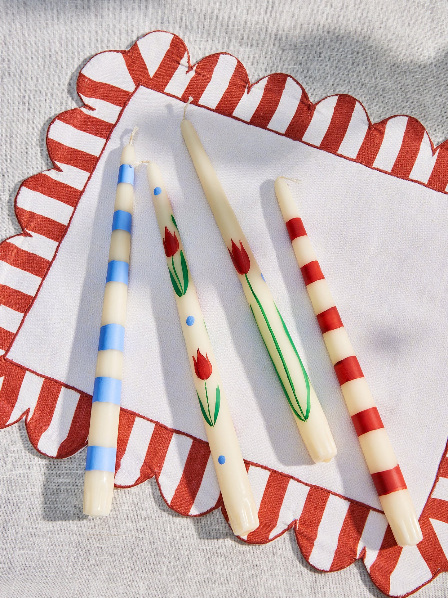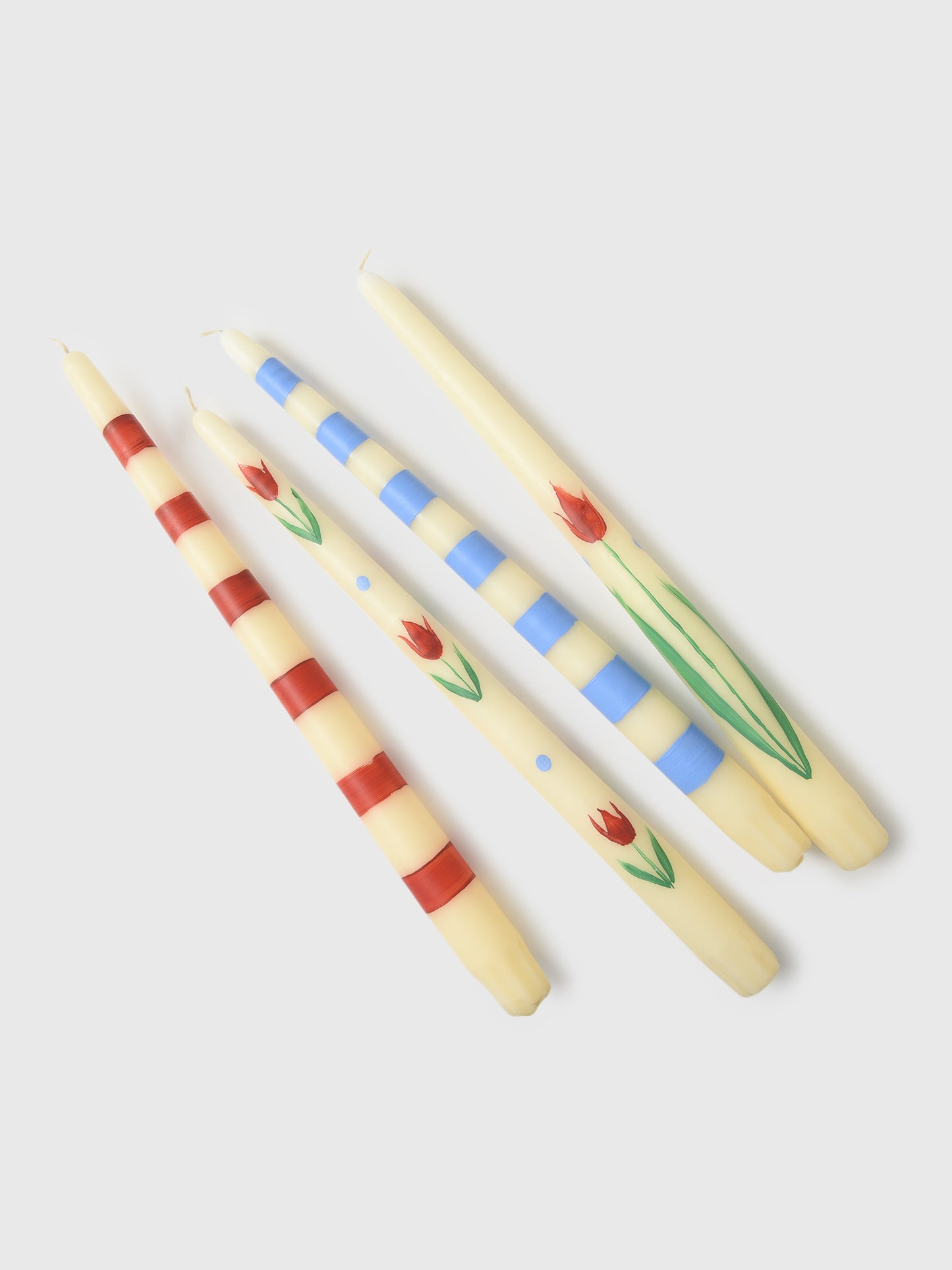 A set of four paraffin wax taper candles adorned with floral hand-painted designs.