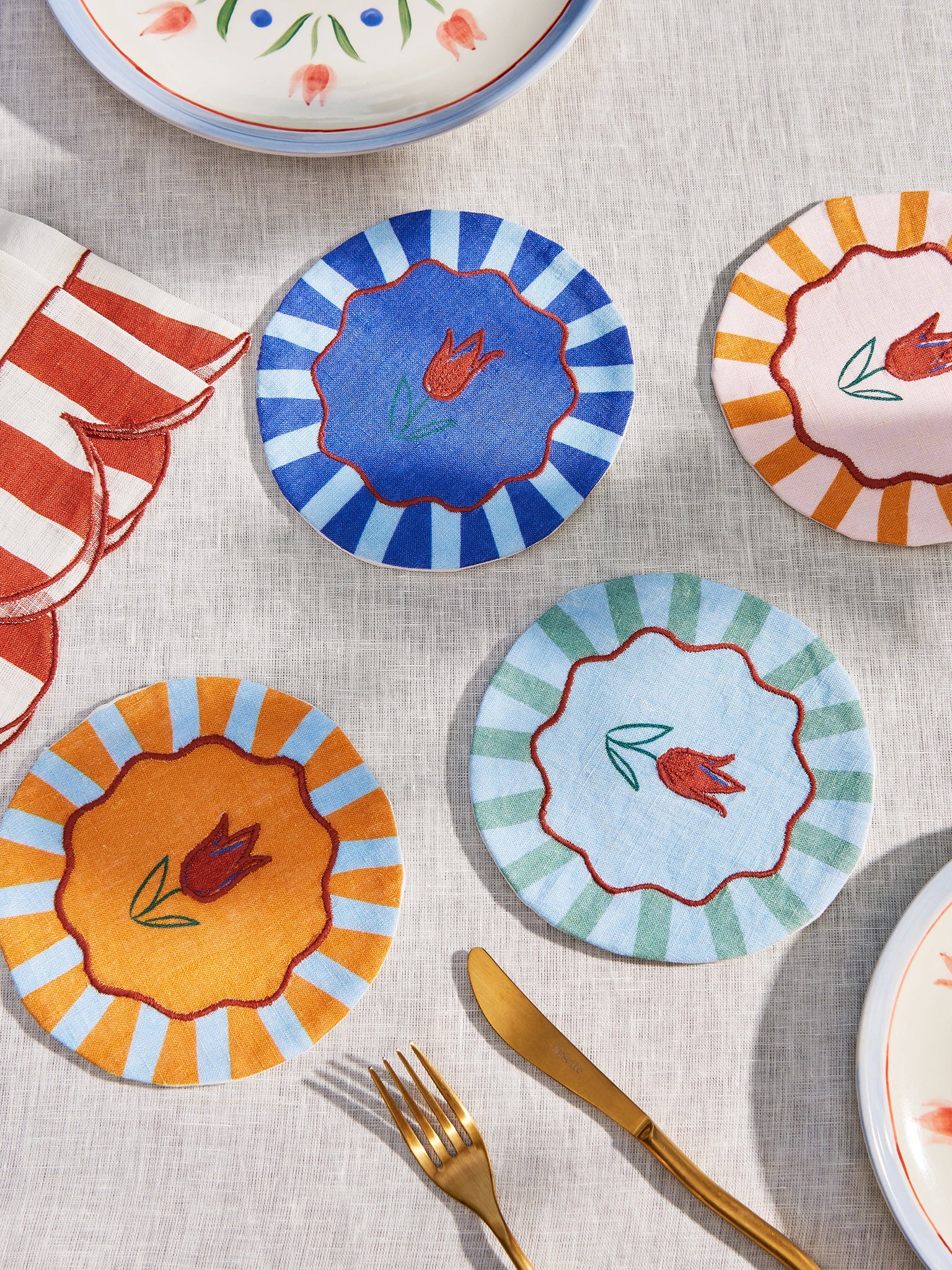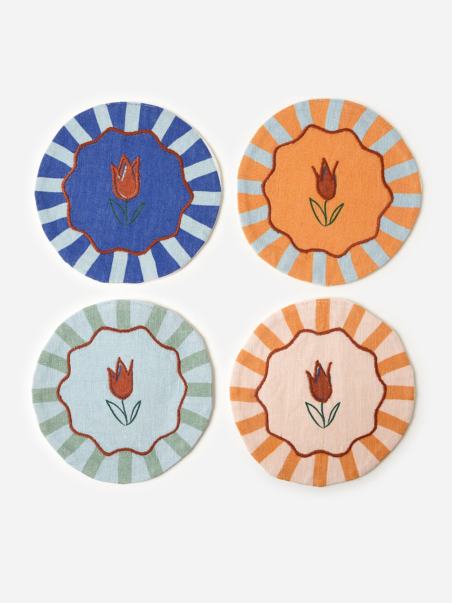 A set of four colorful coasters made from linen with an embroidered tulip design.