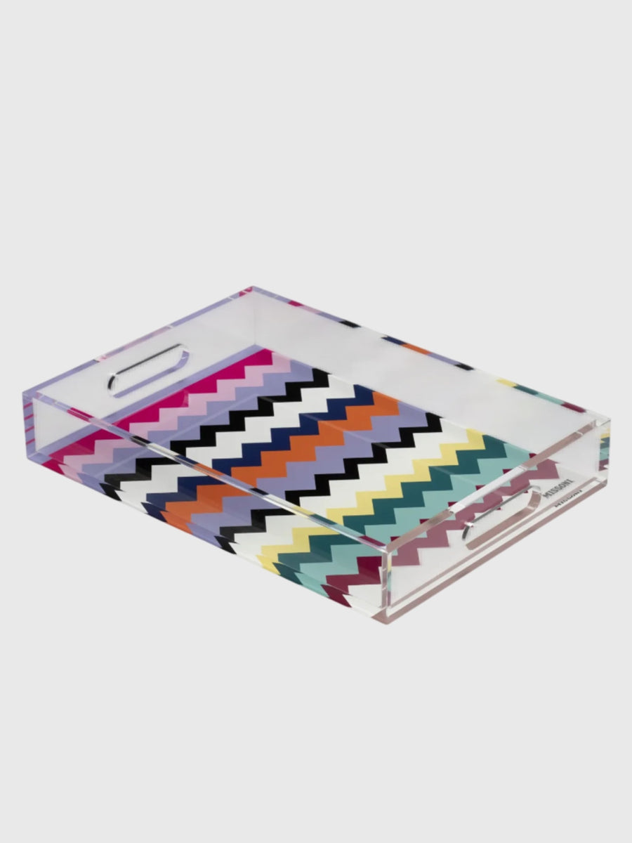 This medium-sized Missoni tray brings a high-energy pop of color to any surface. Crafted from clear plexiglass, the sleek and modern design provides a transparent view of the brand's legendary zig-zag motif showcased at the base.
