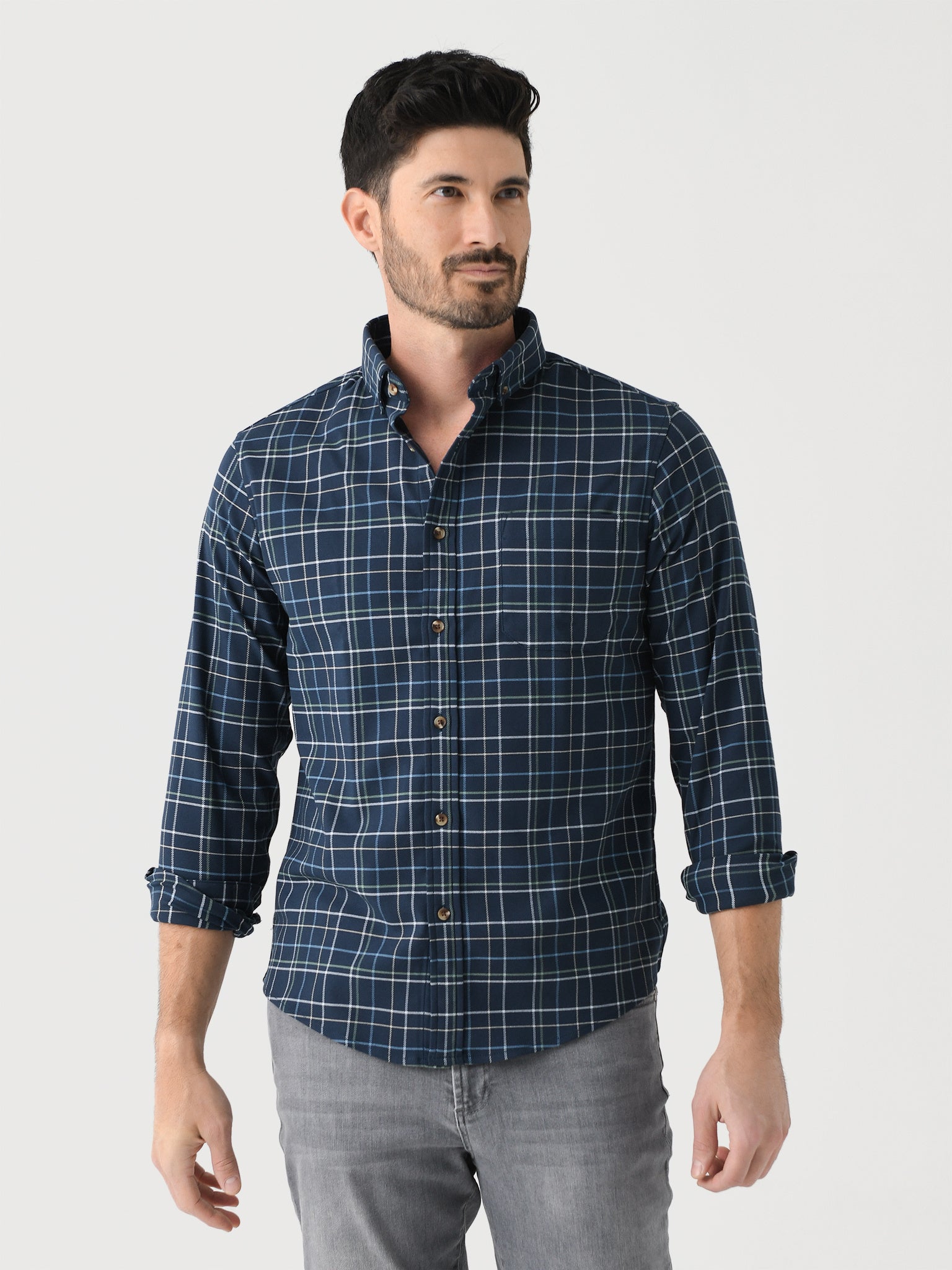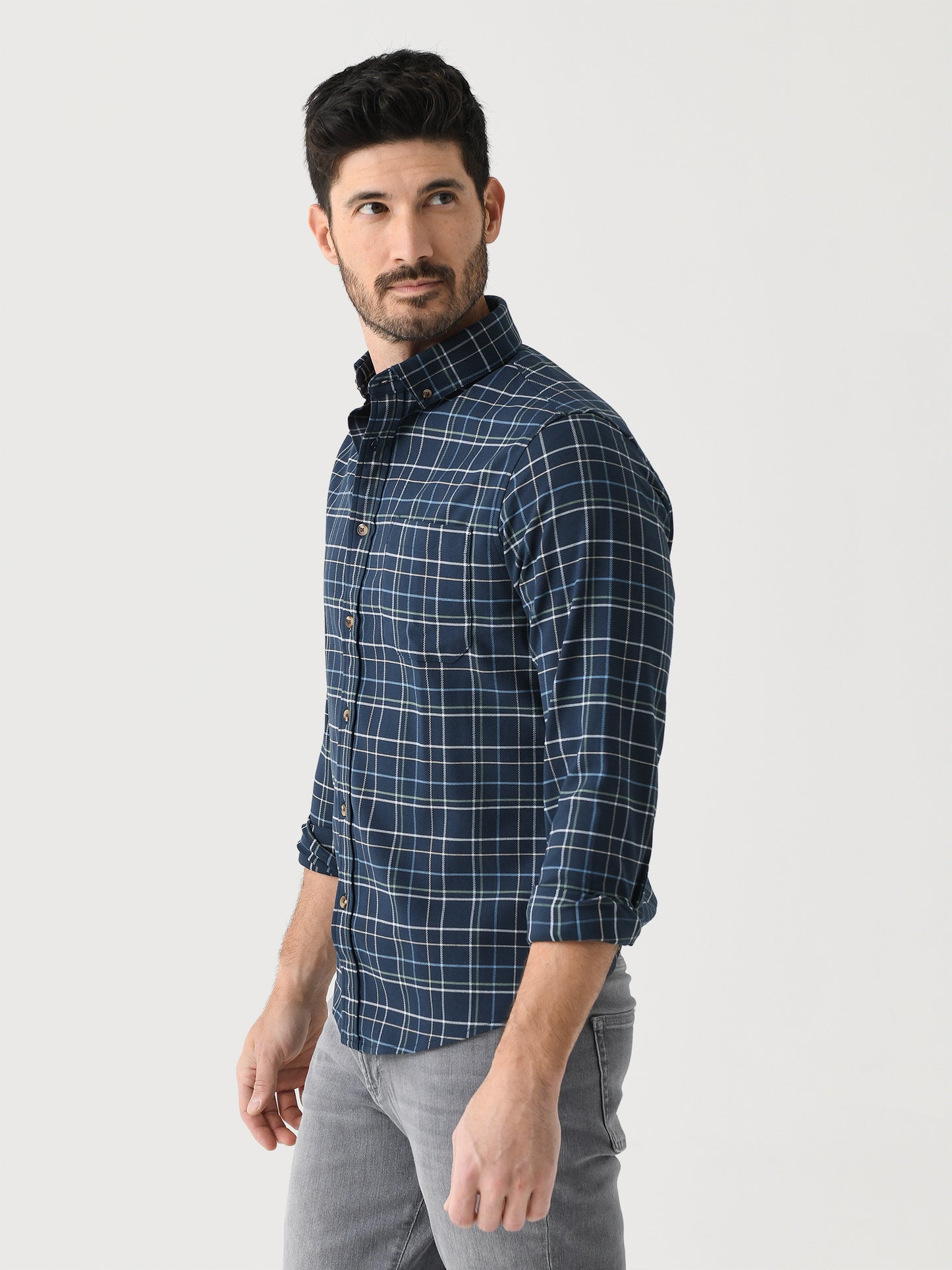 A lightweight button-down shirt made from performance twill flannel fabric with a moisture-wicking finish.