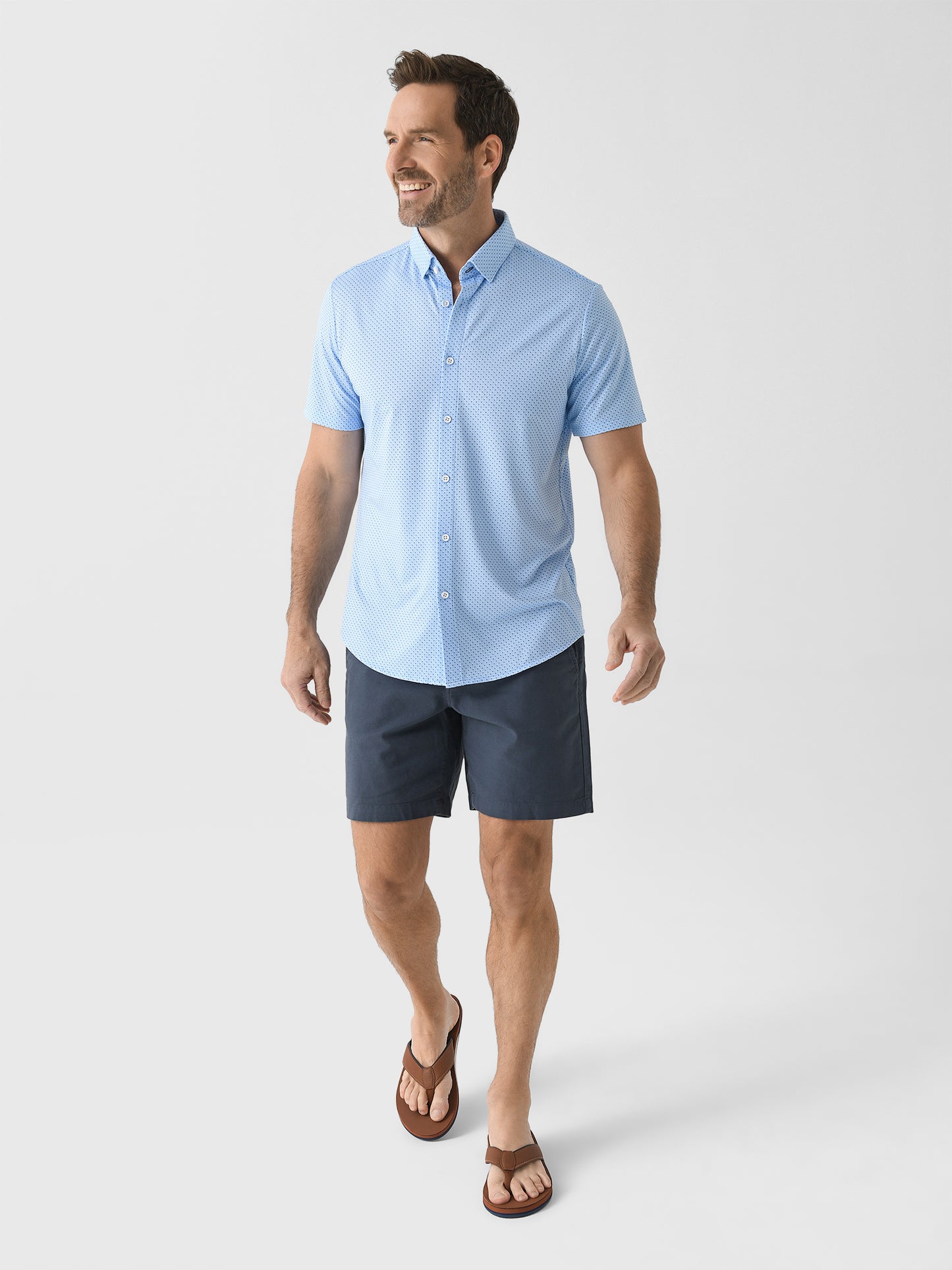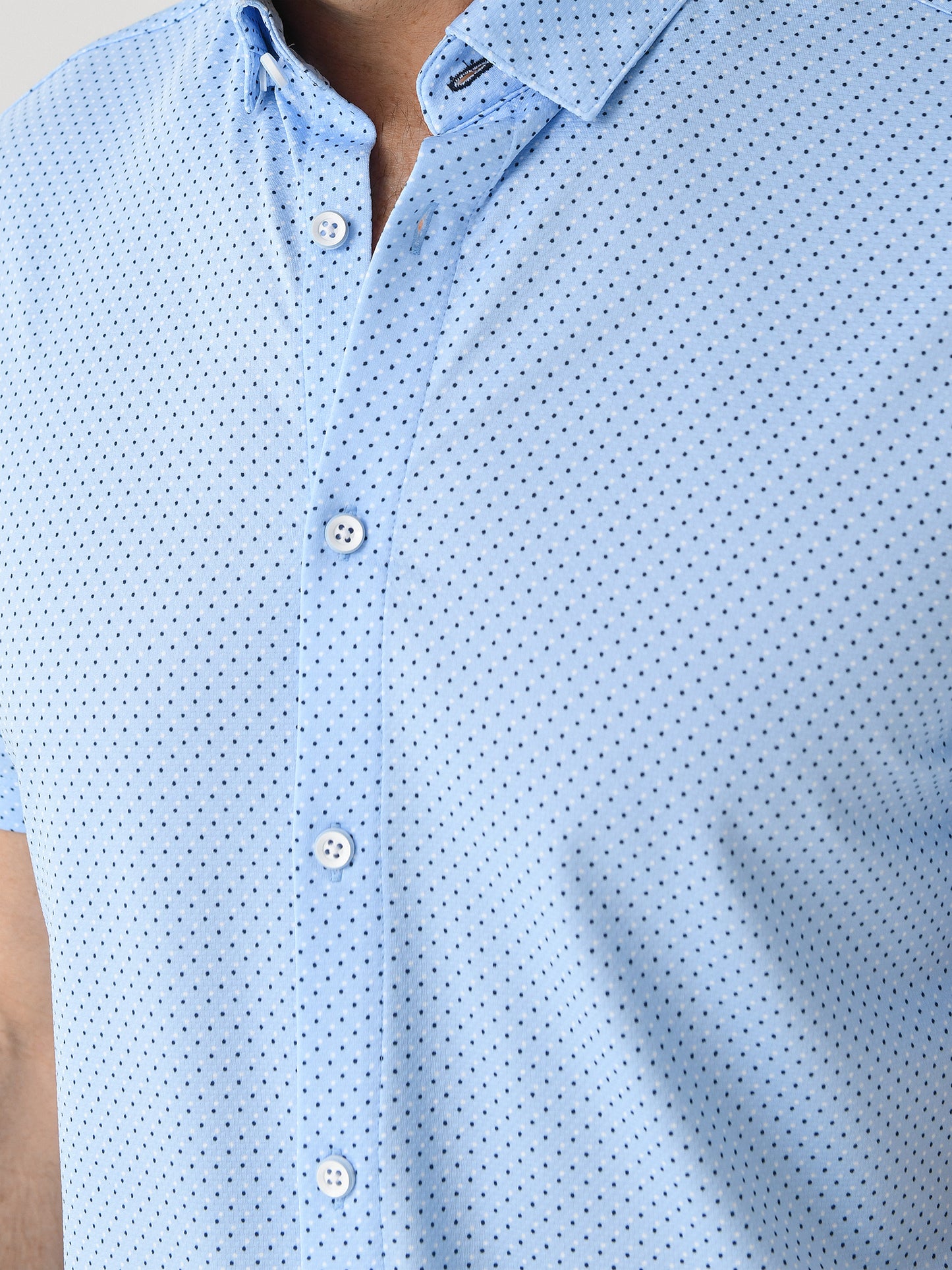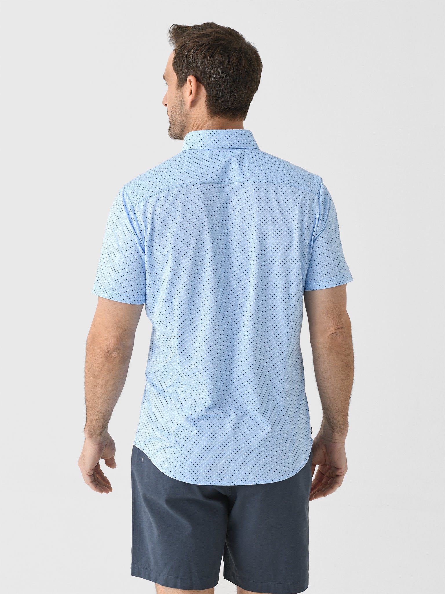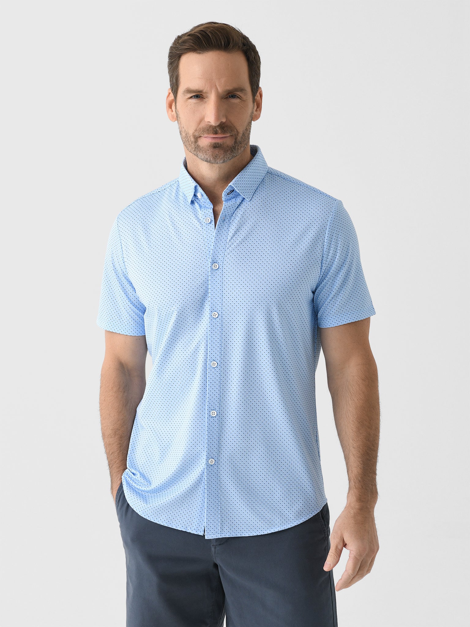 A light blue short-sleeve button-down shirt made from breathable performance fabric with a micro dot print.