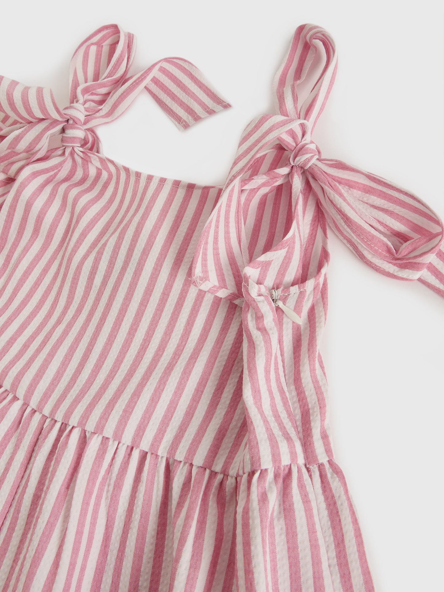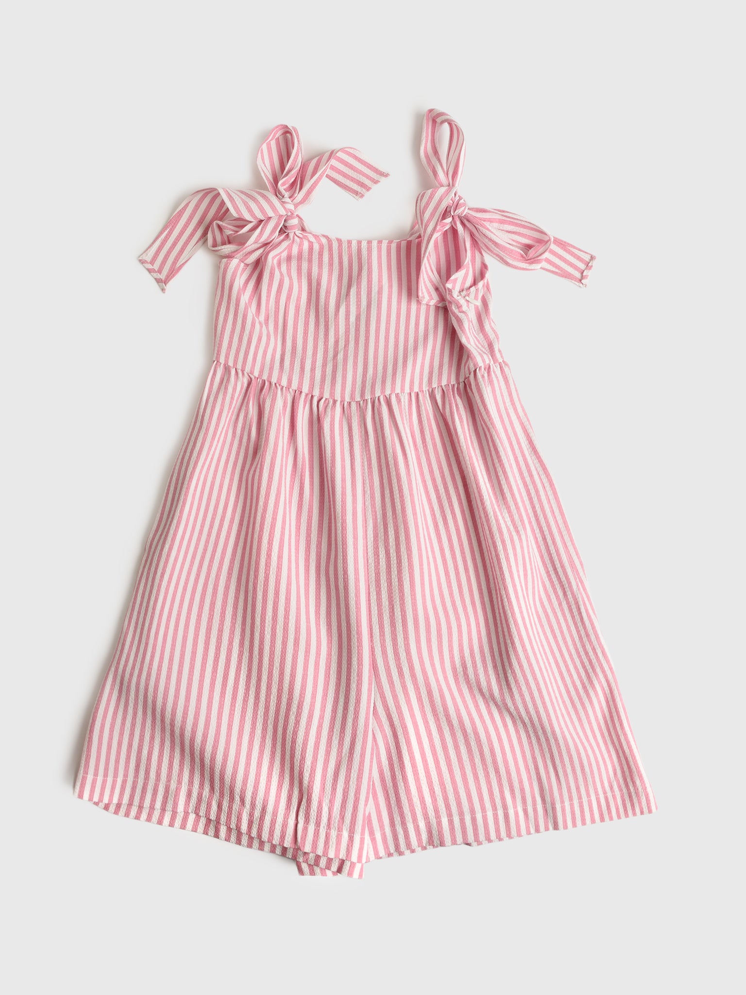This striped romper is made from lightweight woven fabric and features self-tie straps and pockets.