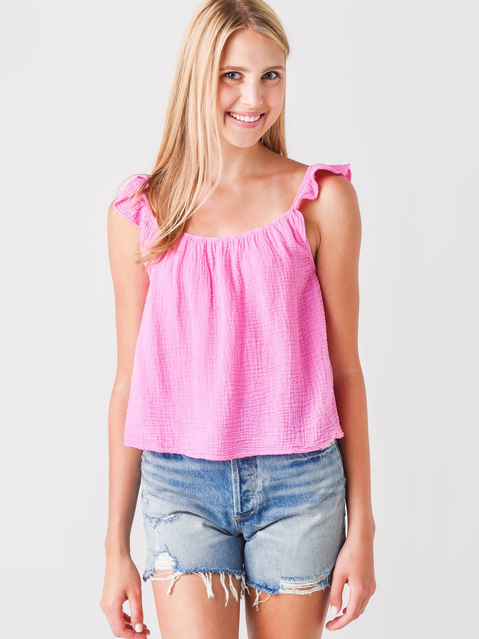 The Monrow Women's Ruffle Tank will have you summer weekend ready with its lightweight gauze fabrication and cute ruffle details.