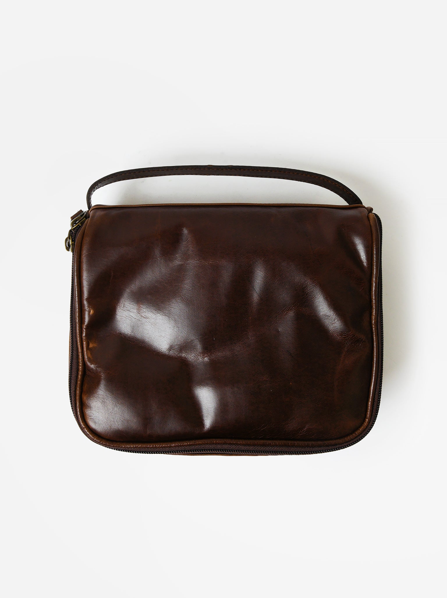 A leather toiletry bag with a water-resistant lining and two interior pockets.
