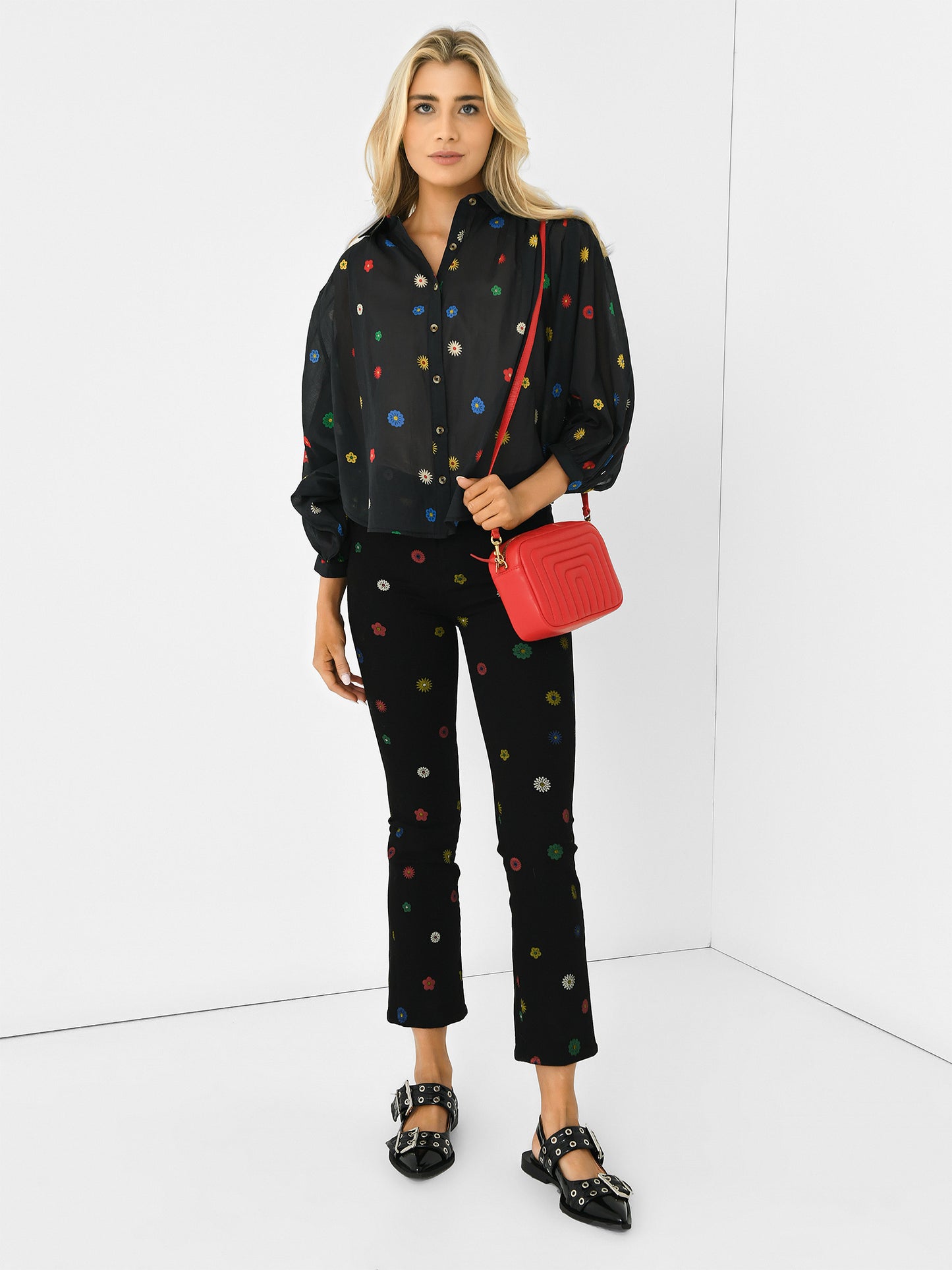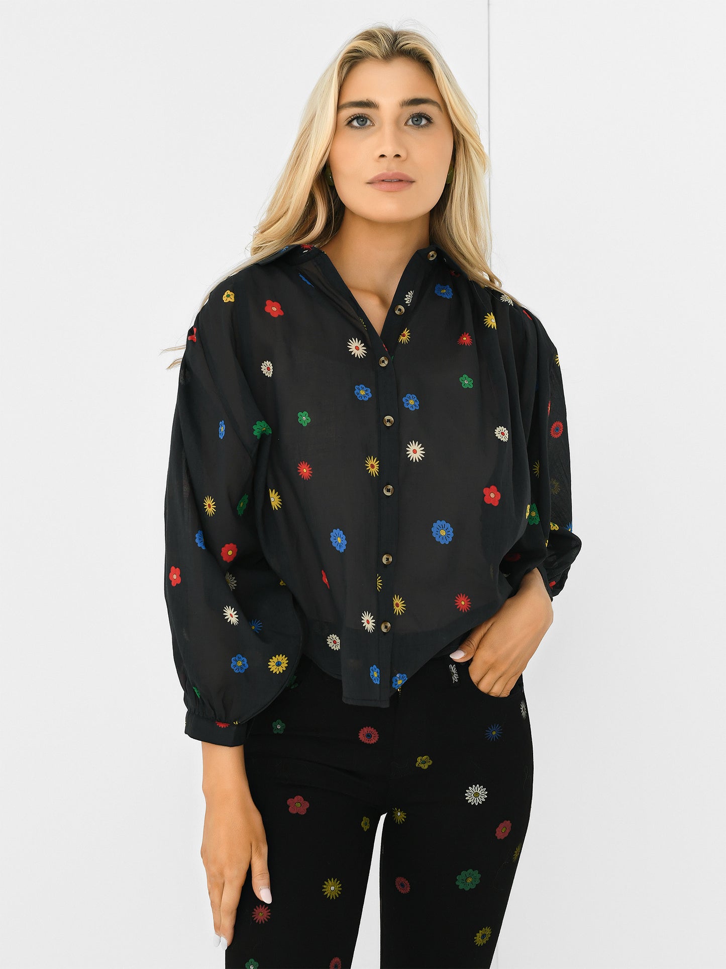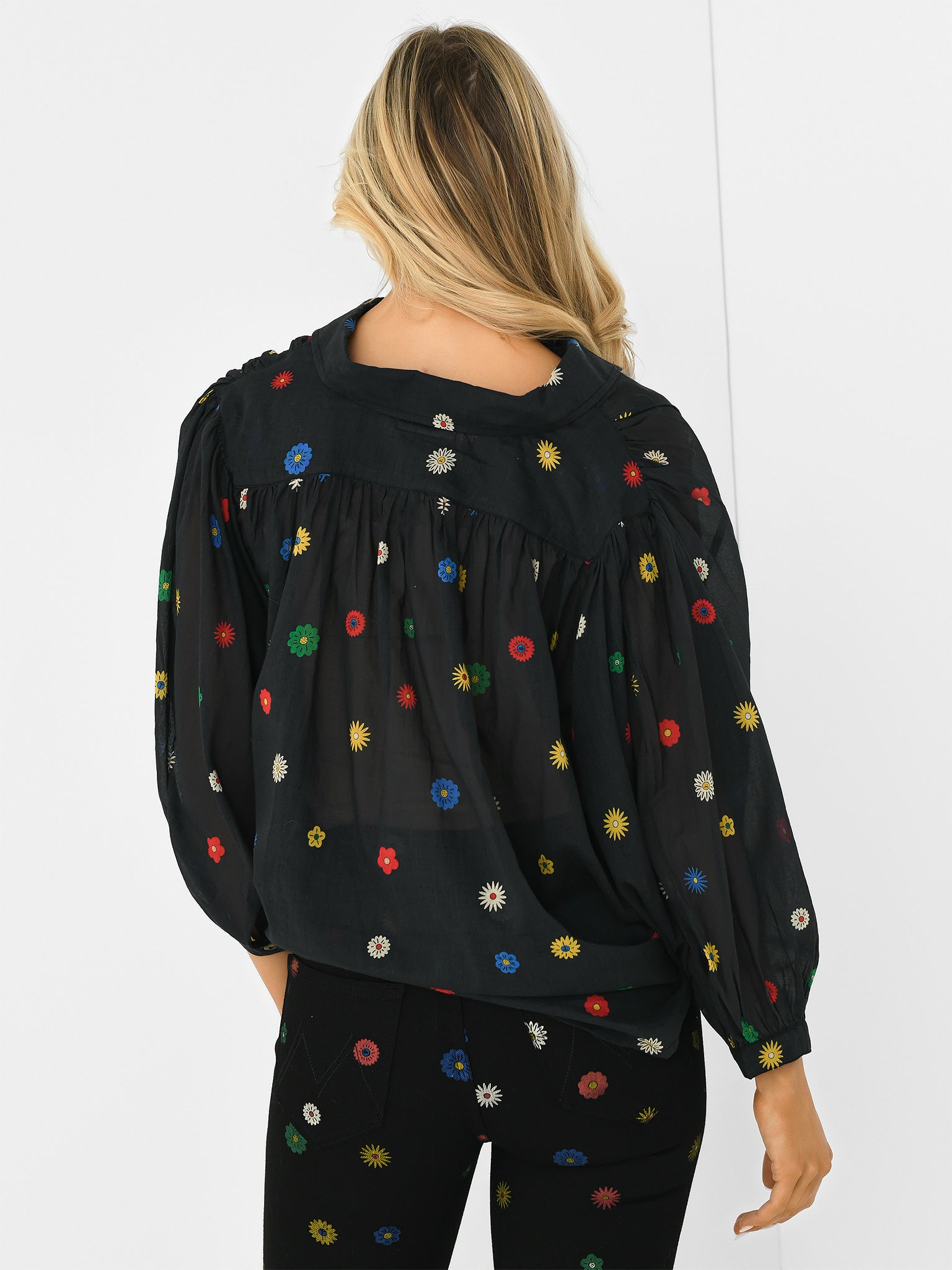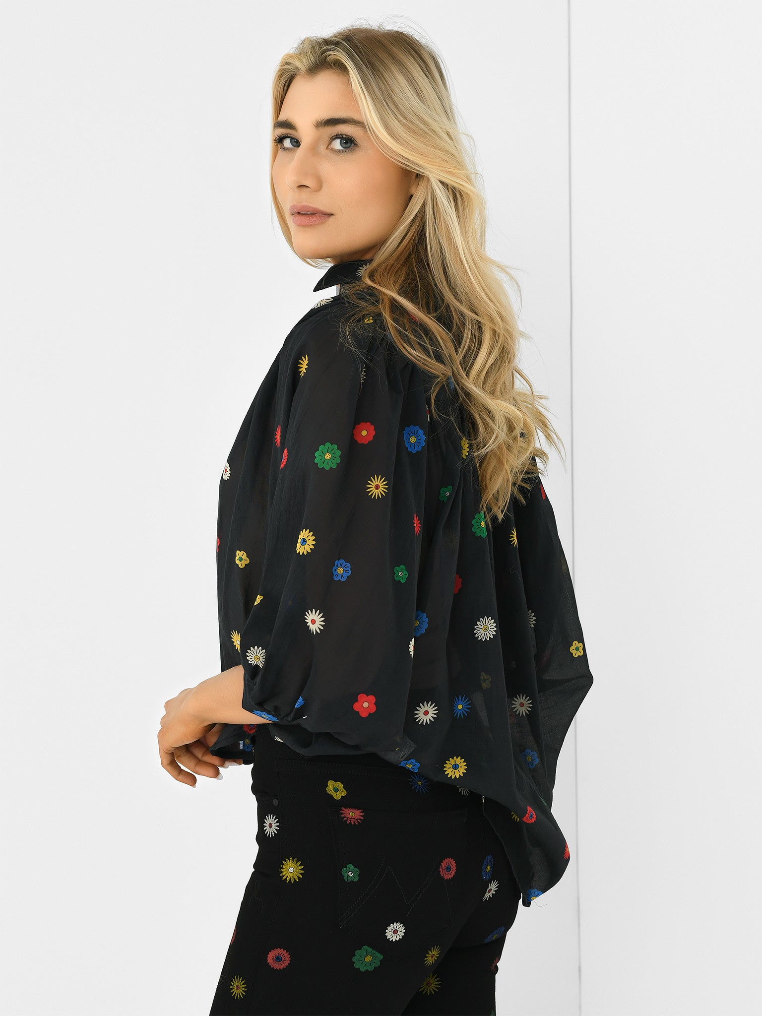 A semi-sheer cotton blouse with balloon sleeves and a fresh daisy print.