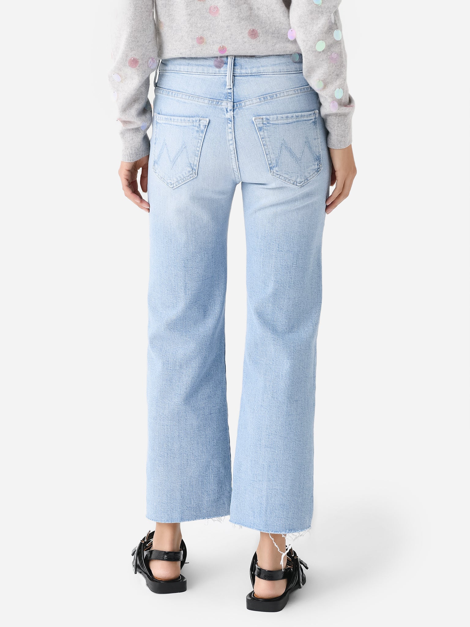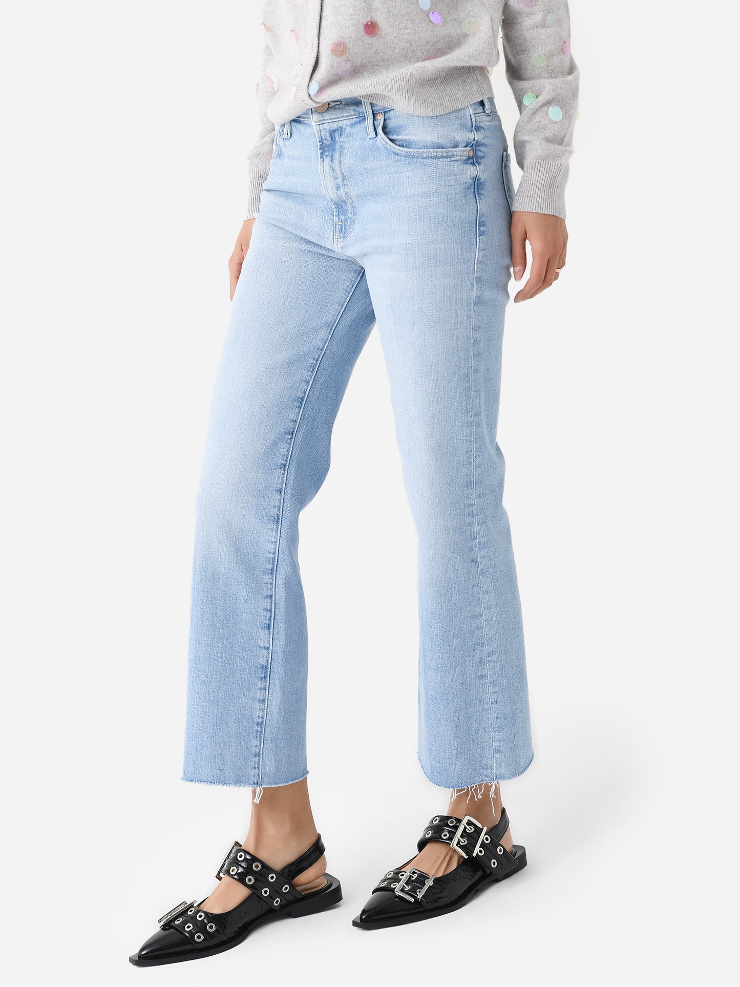 A light wash straight jean featuring a raw edge ankle length inseam.