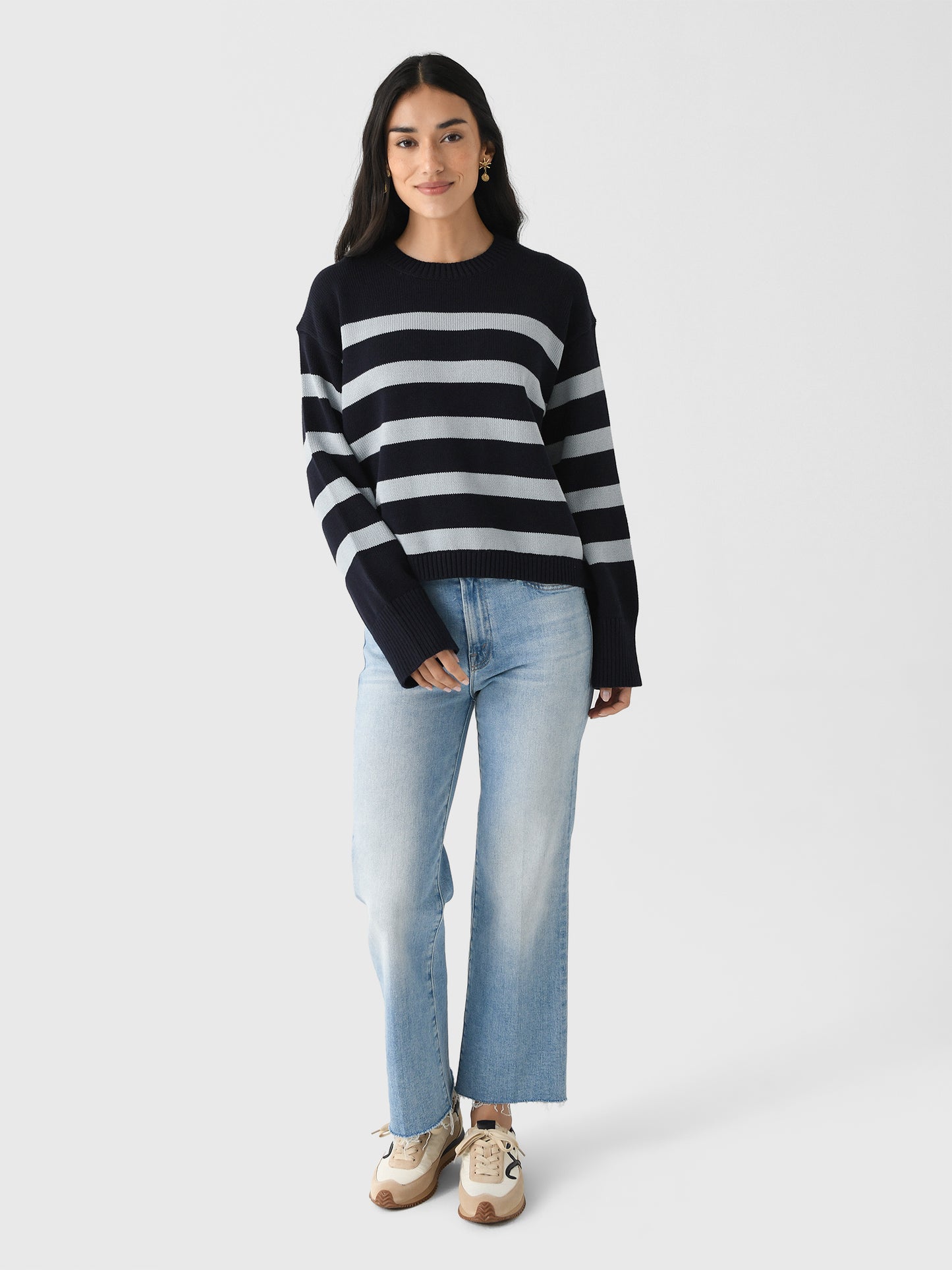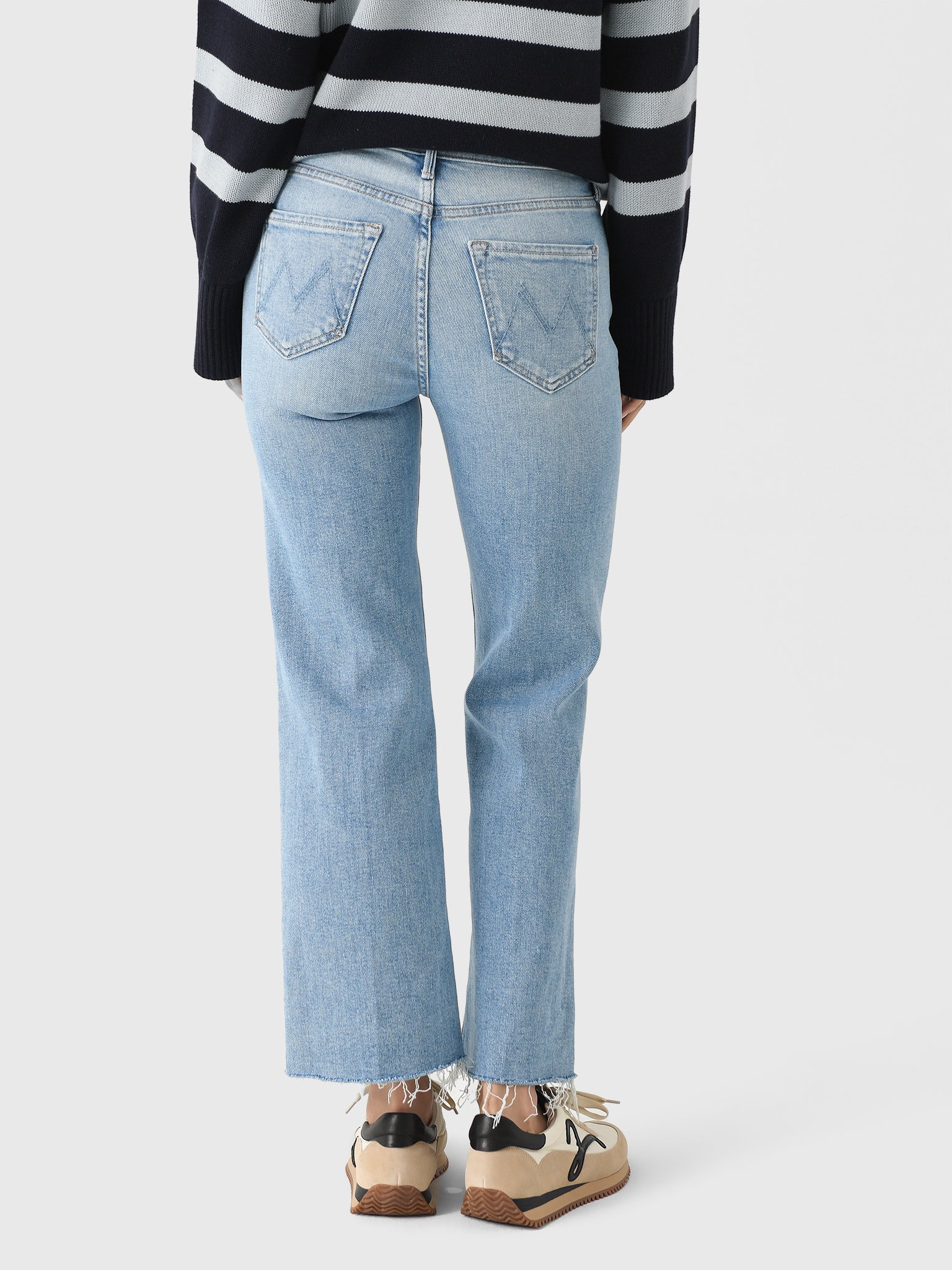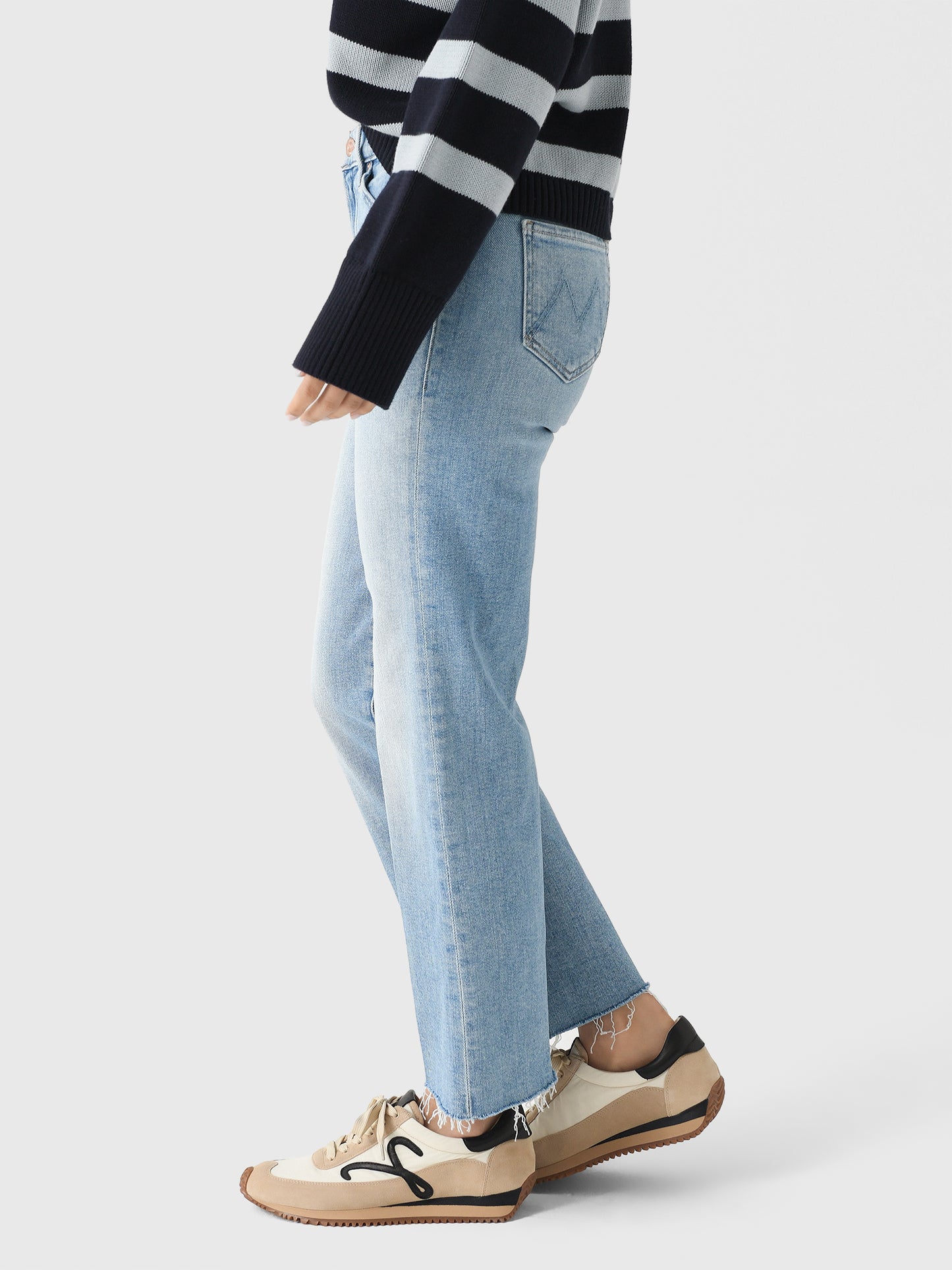 This high-rise straight jean is made from comfort stretch denim and features an ankle-length raw edge hem.